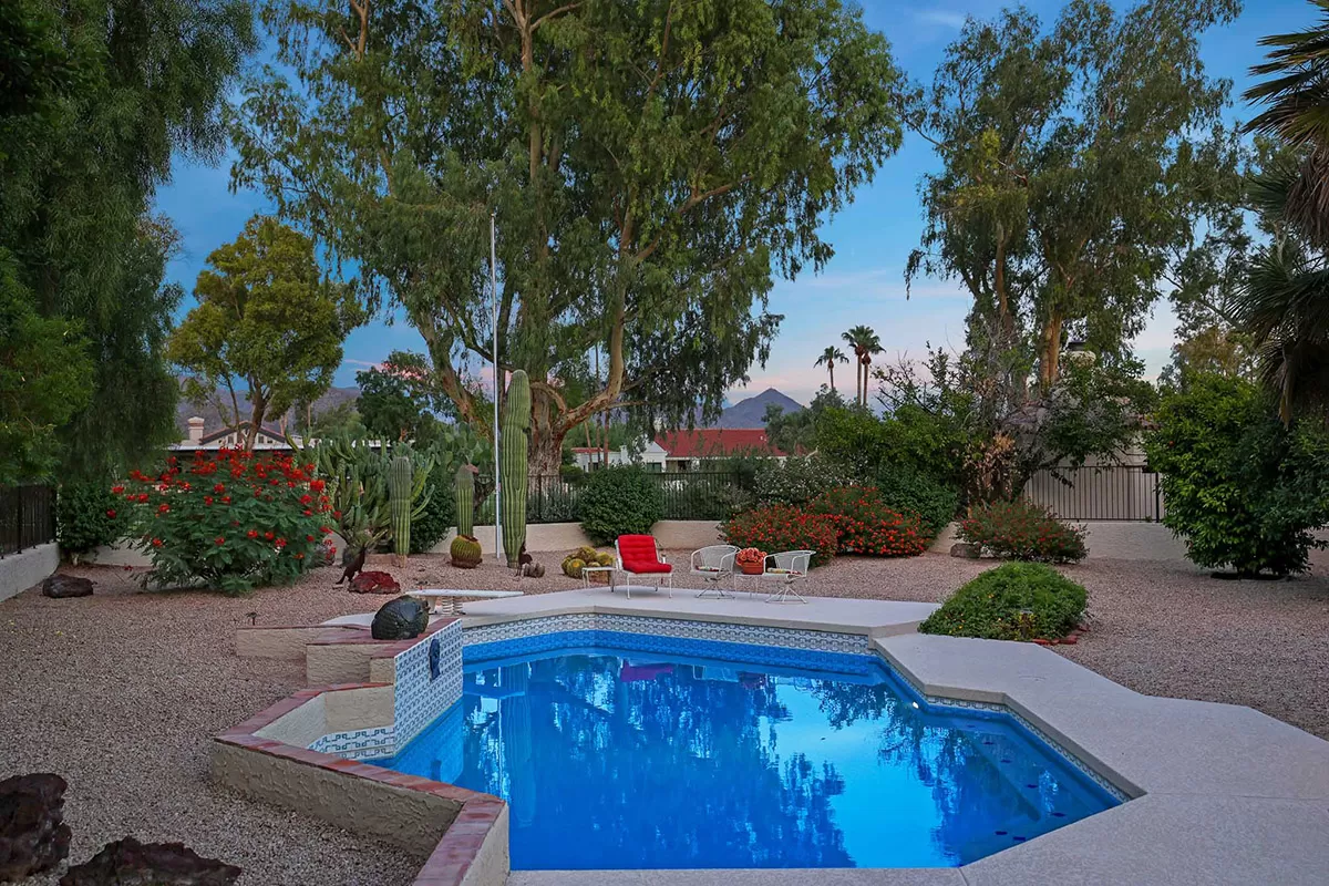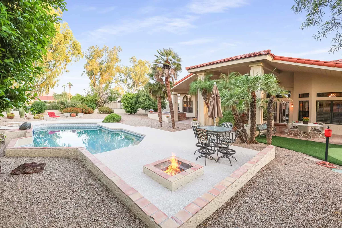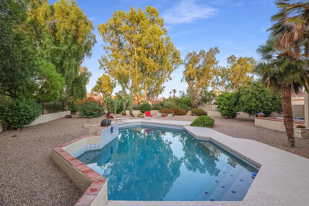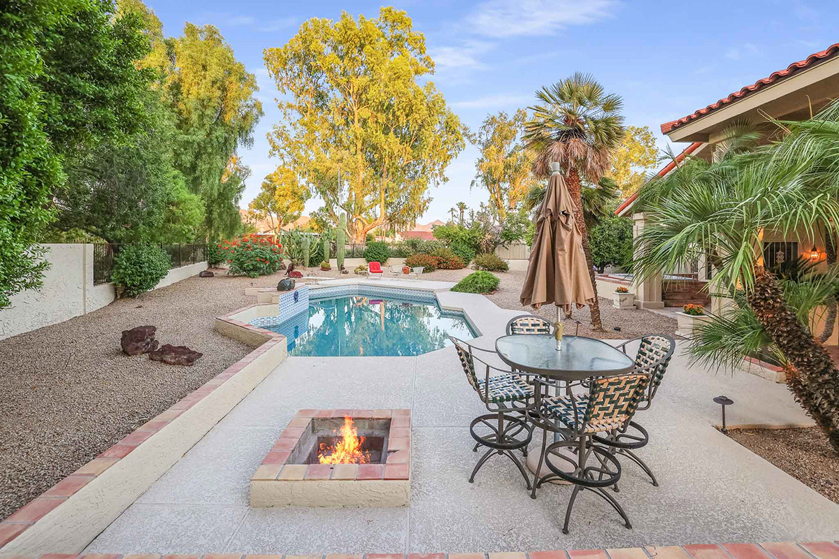 The backyard has a six hole artificial turf putting green, Pebble Tec salt water diving pool, spa in its own private courtyard, large covered patio, ample side yards, a private gate to the golf course, fire pit, and views of the McDowell Mountains and the large trees that line the golf course for a private feel.