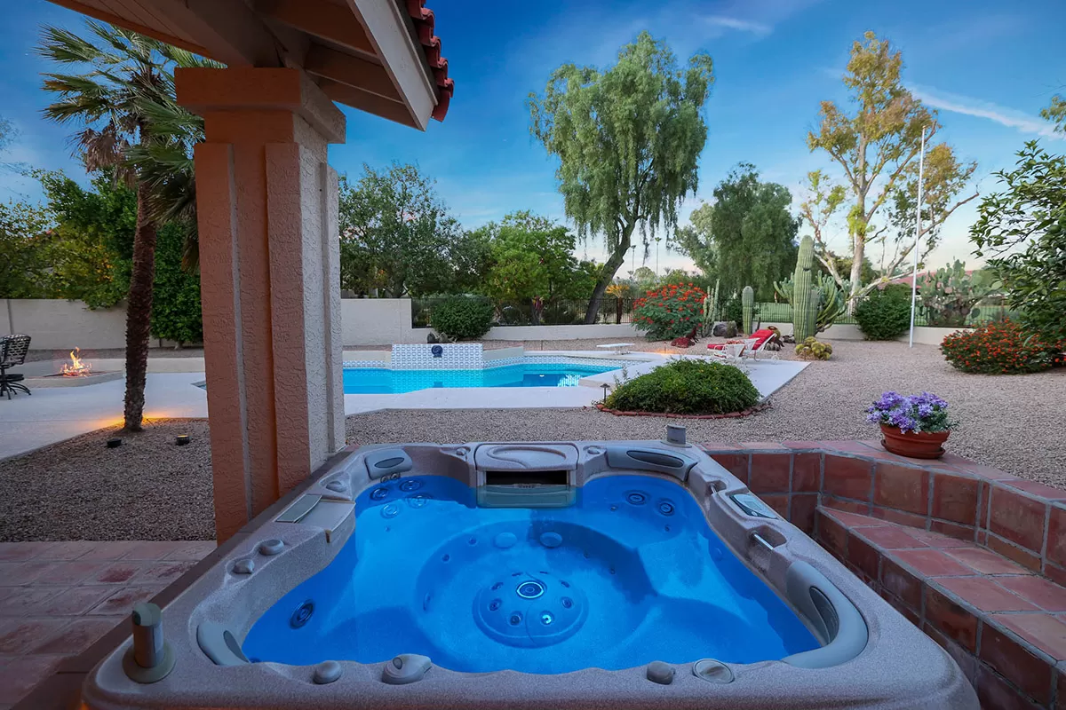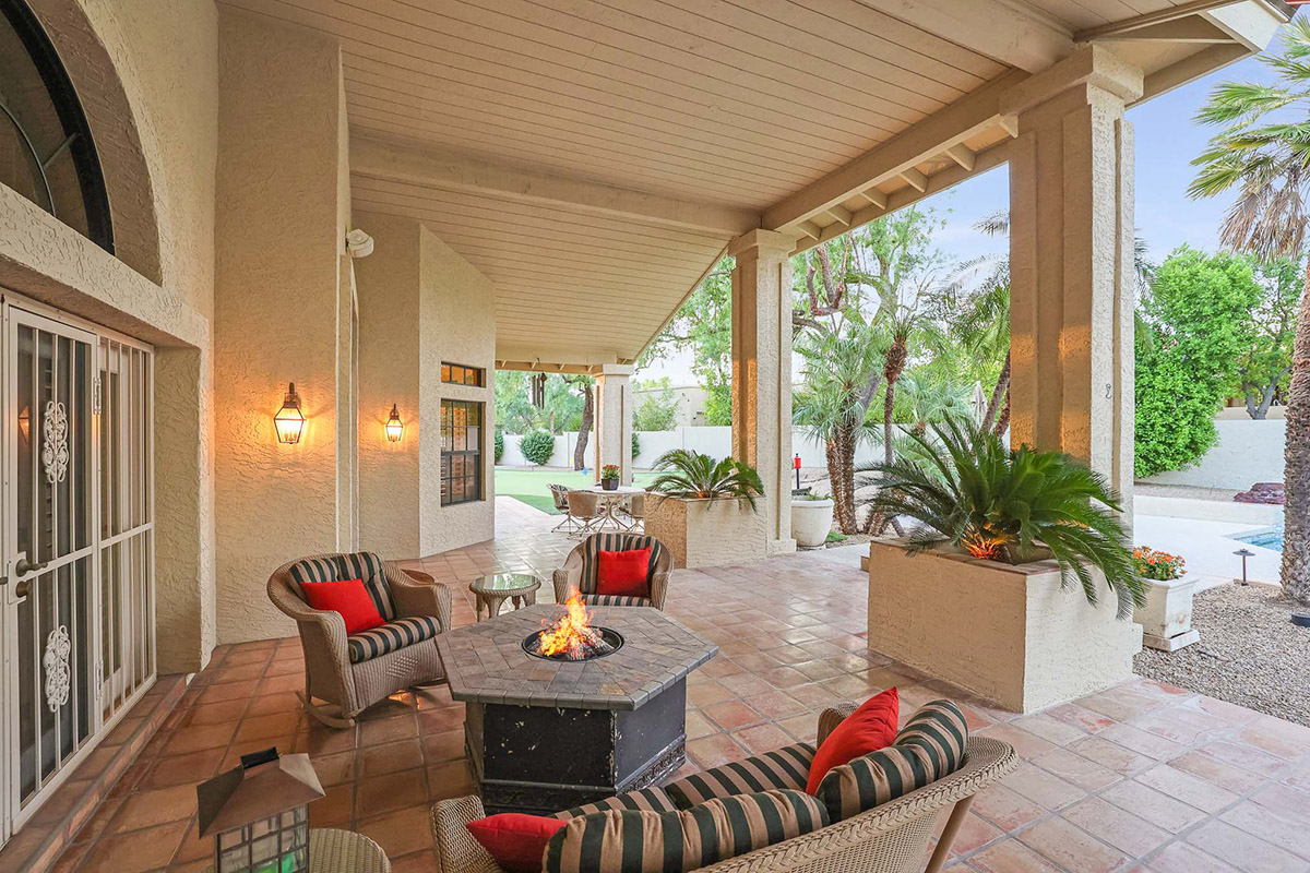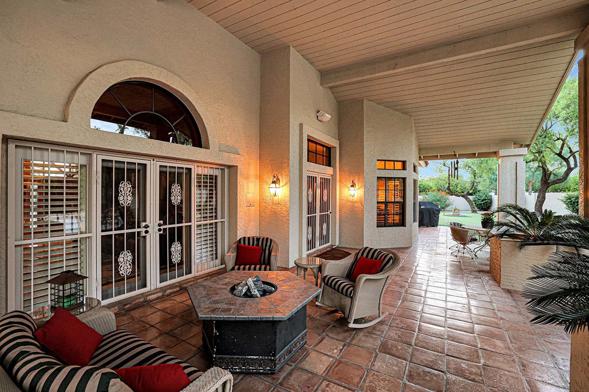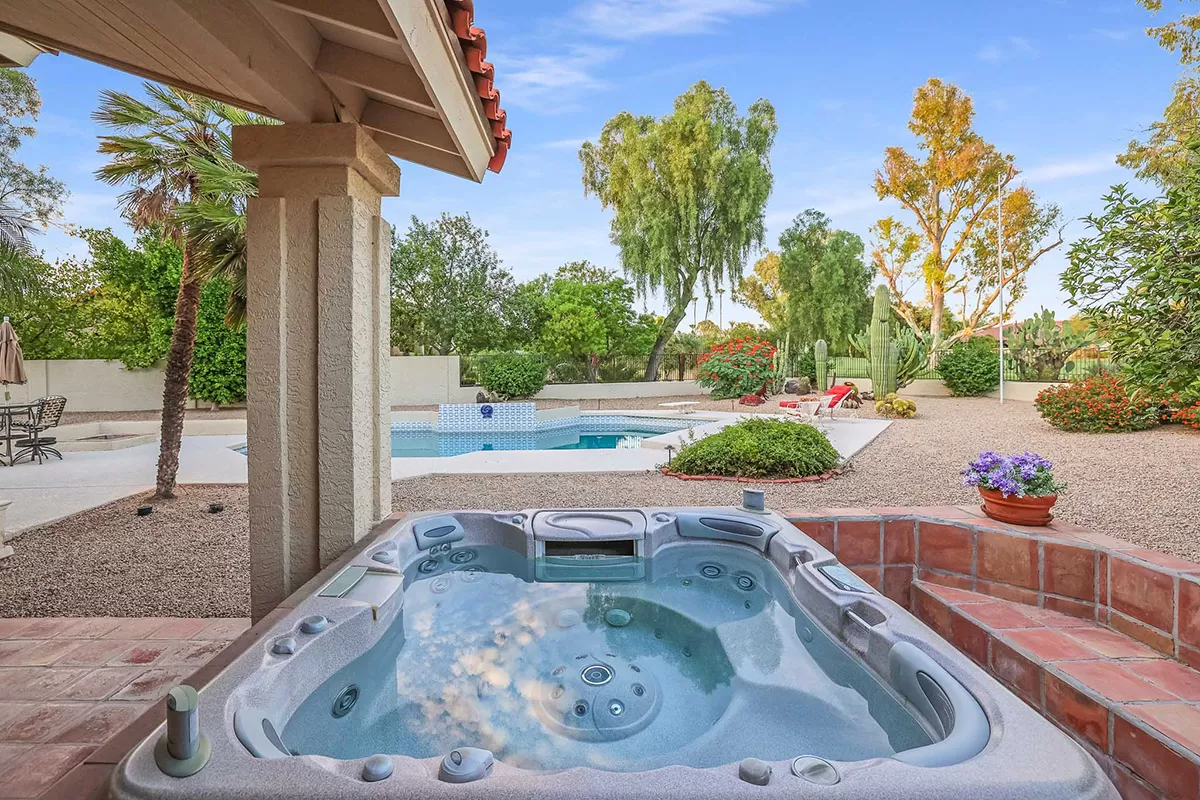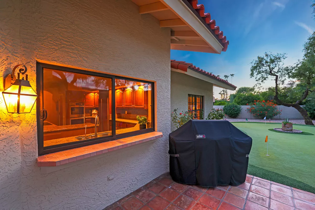 The backyard has a six hole artificial turf putting green, Pebble Tec salt water diving pool, spa in its own private courtyard, large covered patio, ample side yards, a private gate to the golf course, fire pit, and views of the McDowell Mountains and the large trees that line the golf course for a private feel.