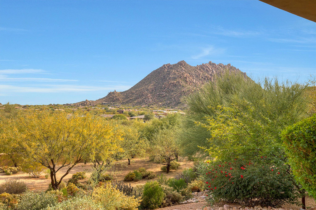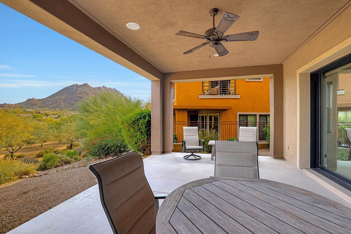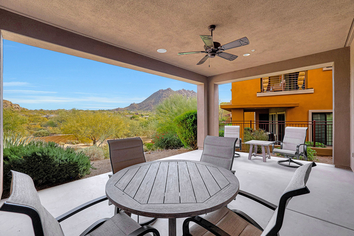 Spectacular Views!! Rare find of first floor unit in one of the most recent new builds in gated Pinnacle Pointe across from the Four Seasons Resort. Enter through your private gated courtyard with gas fireplace to this fabulous home with designer finishes, great room floor plan and dramatic wall of multi-sliding doors that open to your private covered patio and incredible mountain views of Troon and surround boulder outcropping.