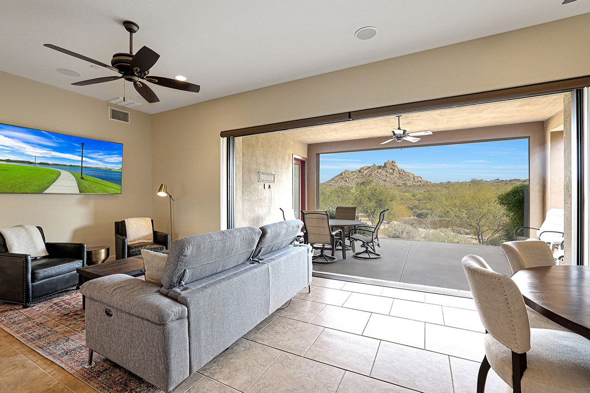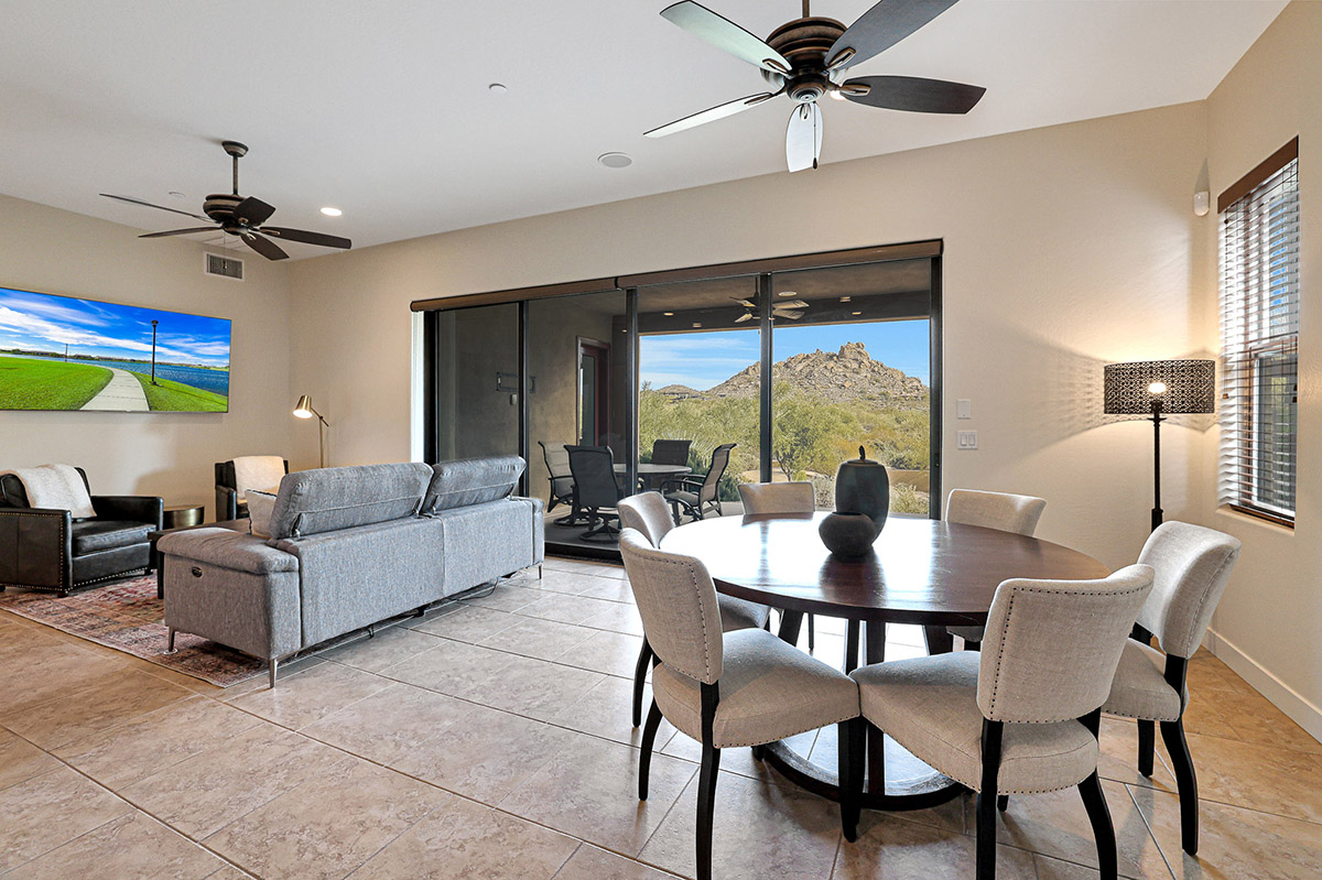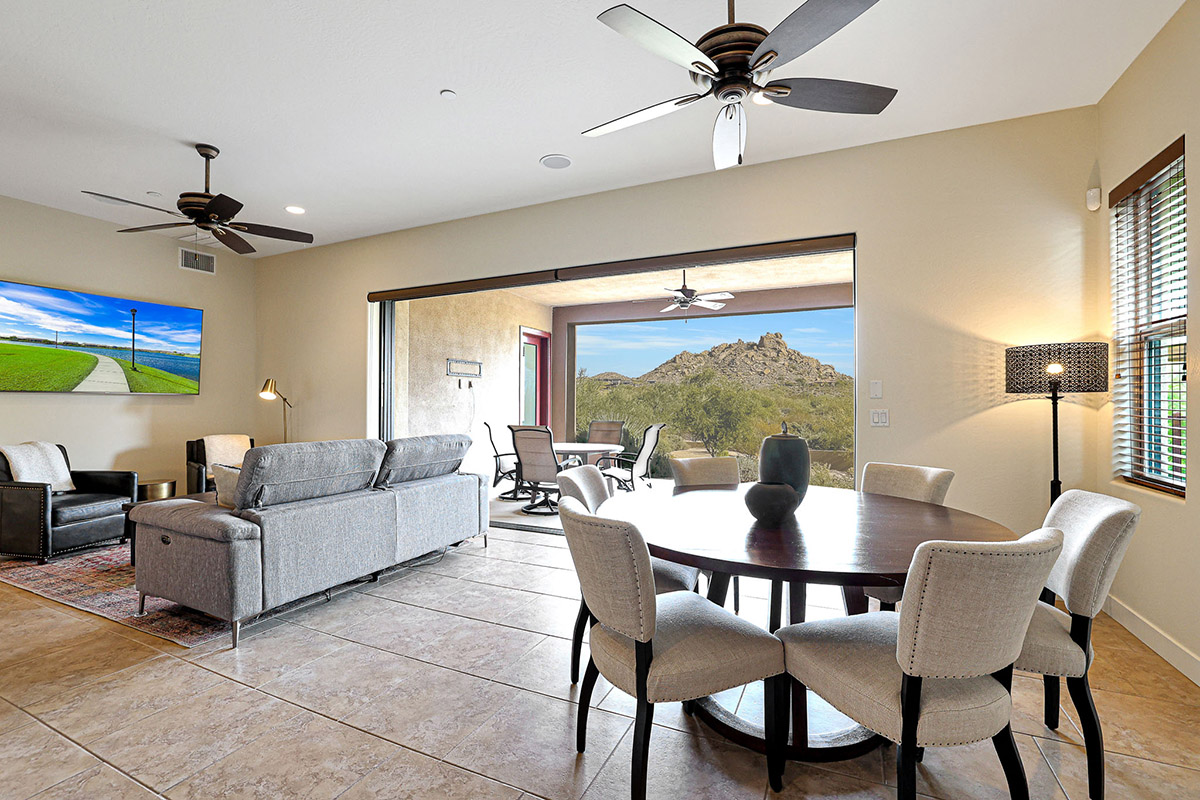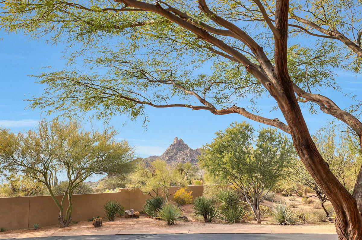 Spectacular Views!! Rare find of first floor unit in one of the most recent new builds in gated Pinnacle Pointe across from the Four Seasons Resort. Enter through your private gated courtyard with gas fireplace to this fabulous home with designer finishes, great room floor plan and dramatic wall of multi-sliding doors that open to your private covered patio and incredible mountain views of Troon and surround boulder outcropping.