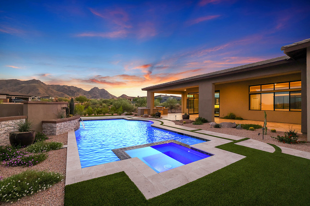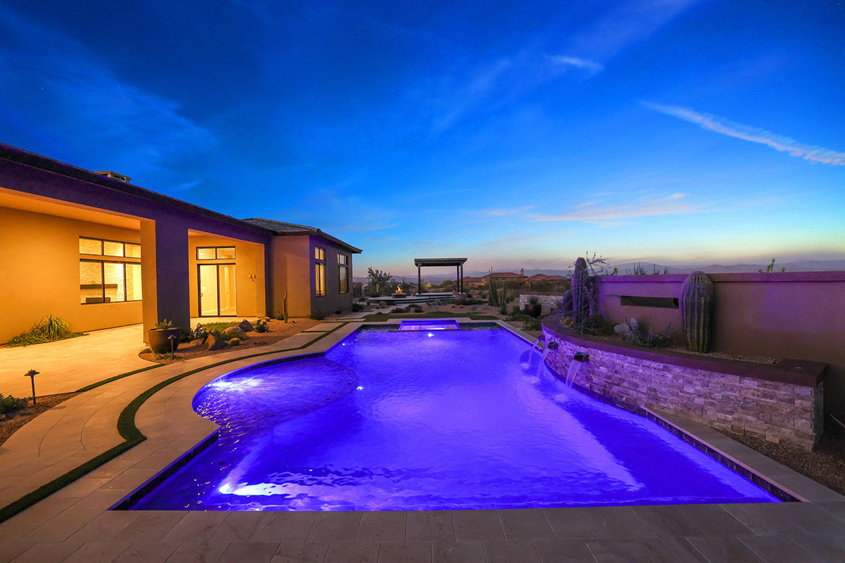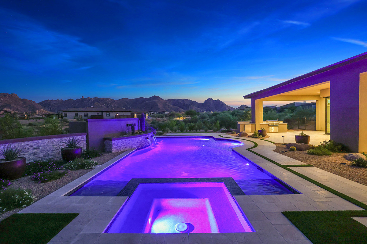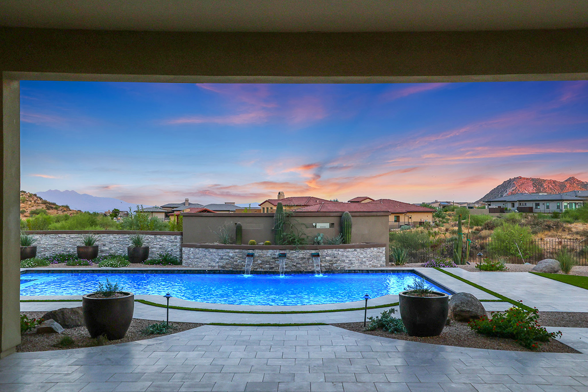 The exterior spaces are the highlight of this property with a brand new pool with integrated negative edge spa and water feature, travertine stone-scaping artfully placed around artificial turf accents, built-in barbecue and fridge, elevated wood gazebo with fire pit and lounge space, designer metal fencing maintaining the remarkable views, and large side yards, all from one of the larger lots (2.3 acres!) within the community.