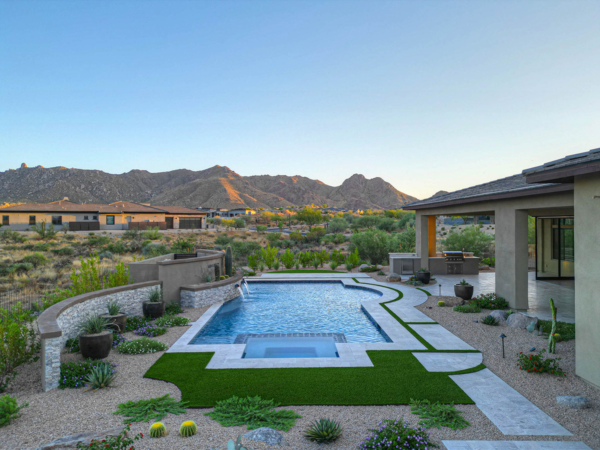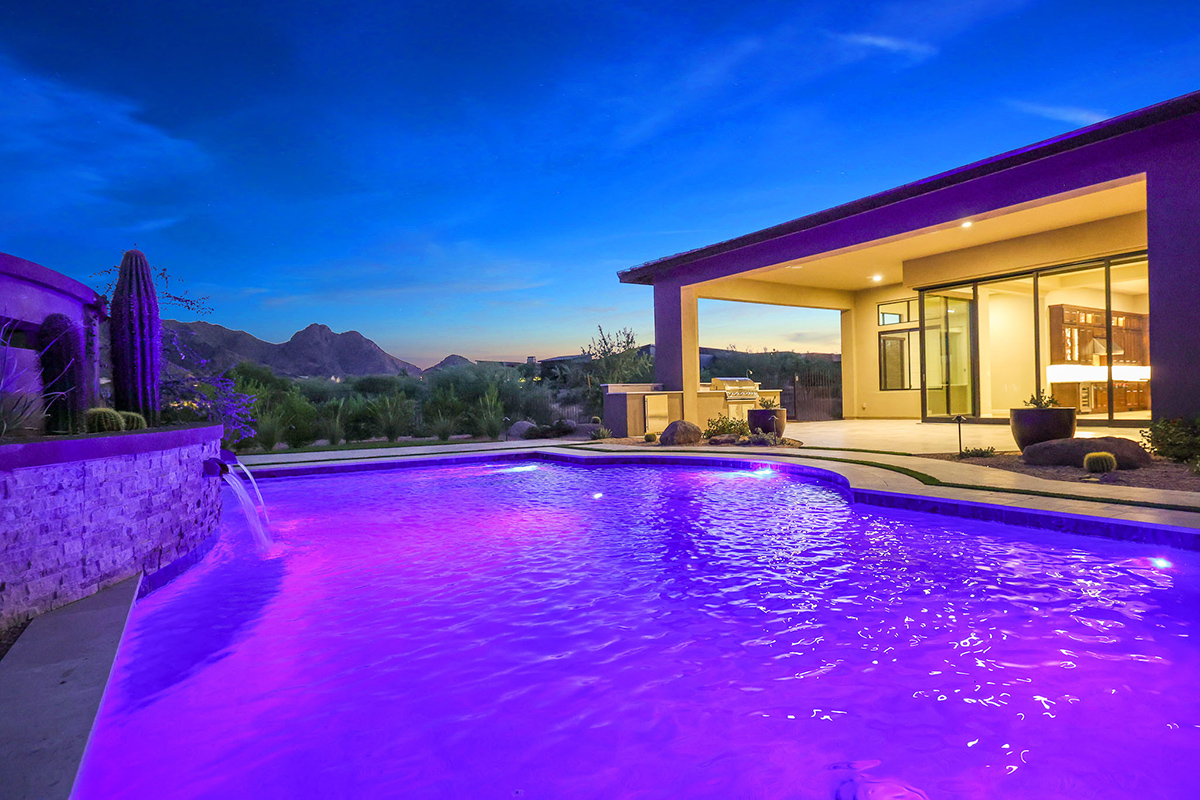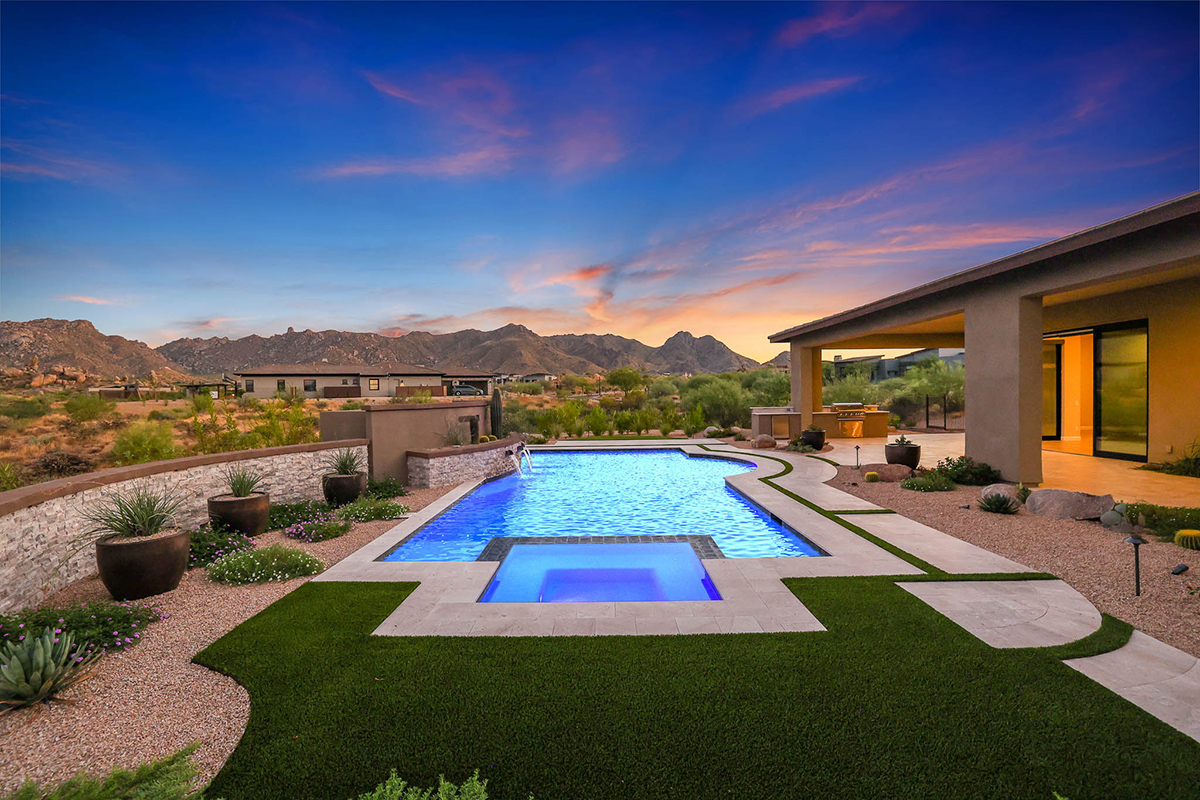 The exterior spaces are the highlight of this property with a brand new pool with integrated negative edge spa and water feature, travertine stone-scaping artfully placed around artificial turf accents, built-in barbecue and fridge, elevated wood gazebo with fire pit and lounge space, designer metal fencing maintaining the remarkable views, and large side yards, all from one of the larger lots (2.3 acres!) within the community.