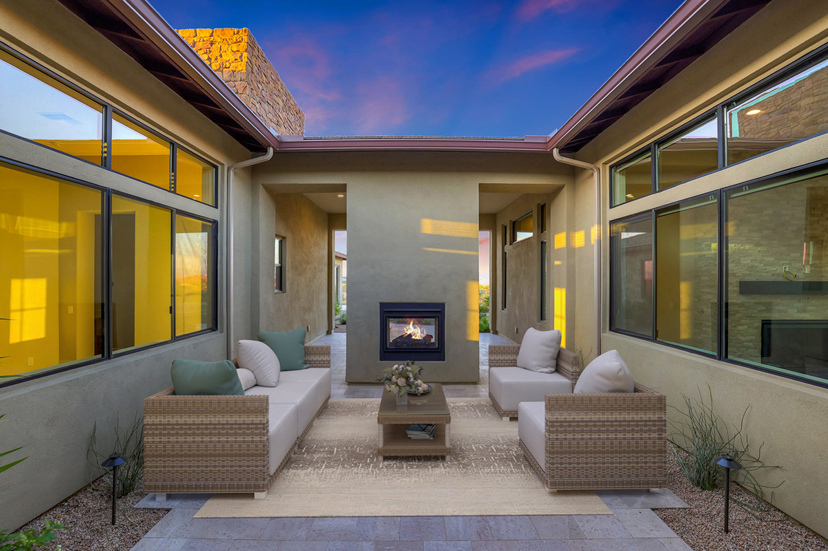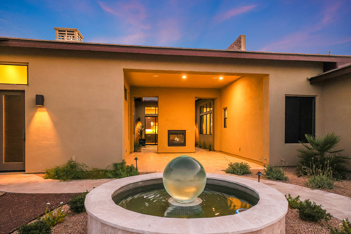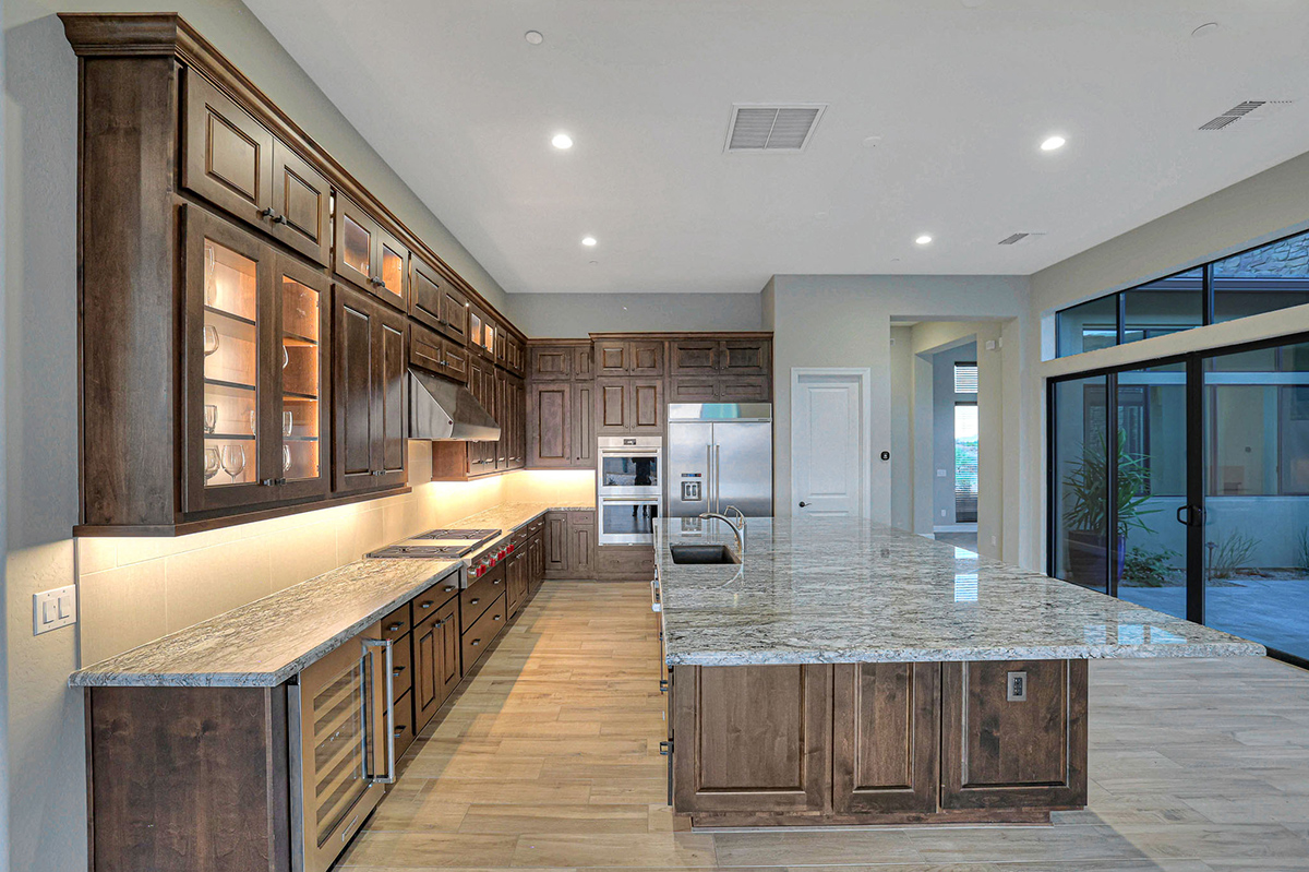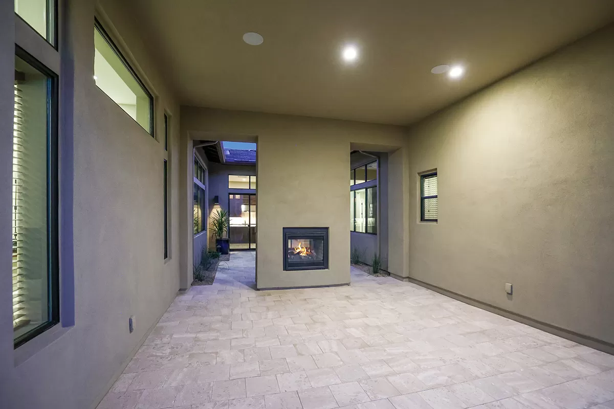 Step into this remarkable residence through an inviting 8-foot entry door, setting the tone for the grandeur. Embrace the feeling of spaciousness with dramatic 12-foot+ ceilings gracing the main living areas. The heart of this home is the luxurious gourmet kitchen featuring an oversized island and Crafted cabinets with crown molding. Indulge your culinary aspirations with designer stainless steel appliances, including a 48″ gas range top, built-in electric double oven, built-in microwave, beverage fridge and dishwasher. Adjacent to the kitchen is a courtyard leading to a covered patio separated by a two-way fireplace and water feature, perfect for entertaining.