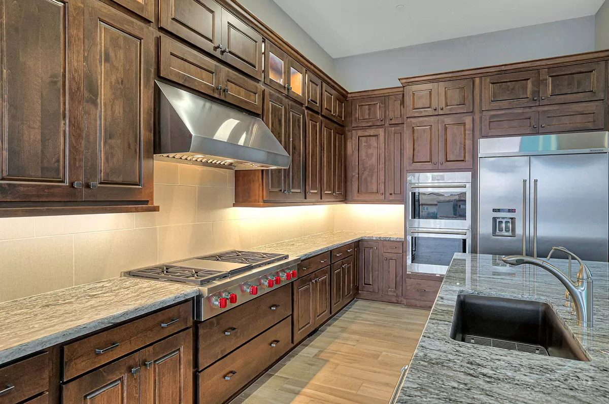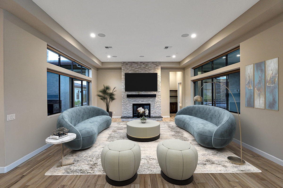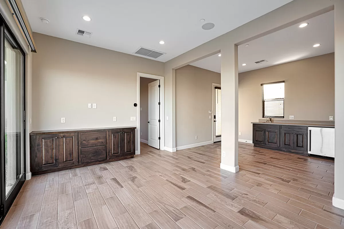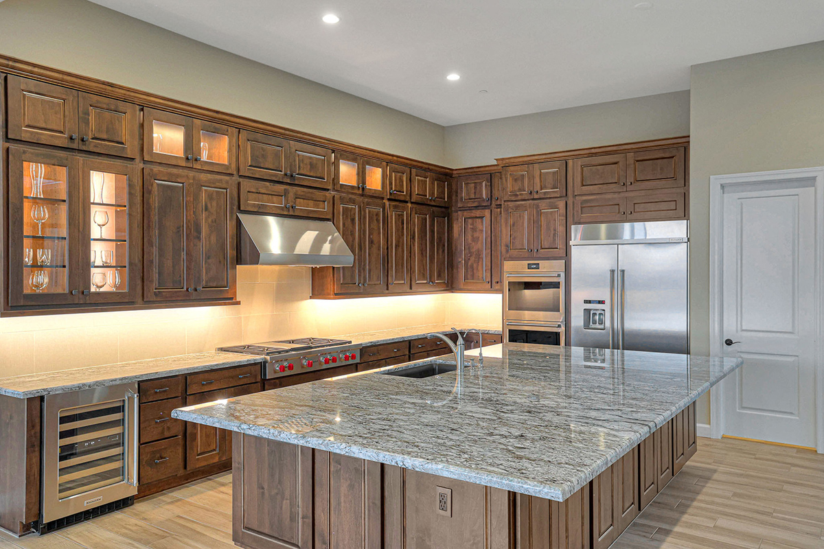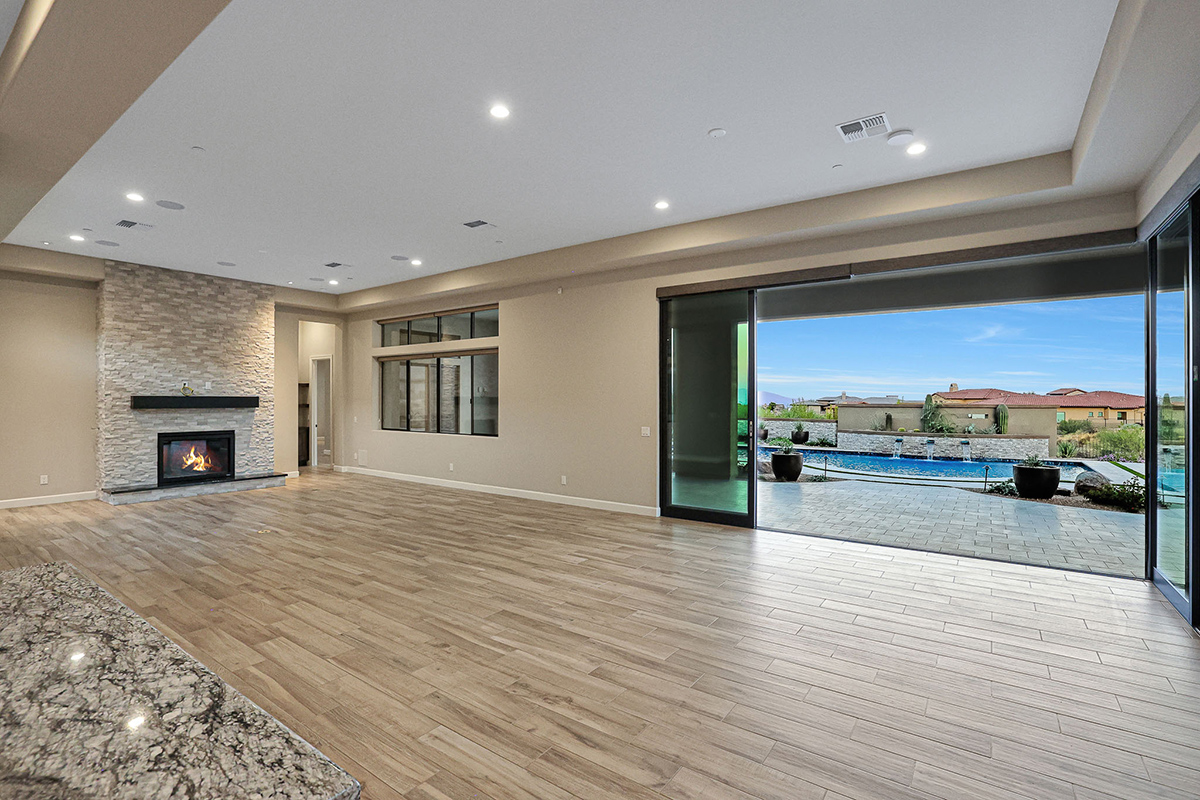 Step into this remarkable residence through an inviting 8-foot entry door, setting the tone for the grandeur. Embrace the feeling of spaciousness with dramatic 12-foot+ ceilings gracing the main living areas. The heart of this home is the luxurious gourmet kitchen featuring an oversized island and Crafted cabinets with crown molding. Indulge your culinary aspirations with designer stainless steel appliances, including a 48″ gas range top, built-in electric double oven, built-in microwave, beverage fridge and dishwasher. Adjacent to the kitchen is a courtyard leading to a covered patio separated by a two-way fireplace and water feature, perfect for entertaining.