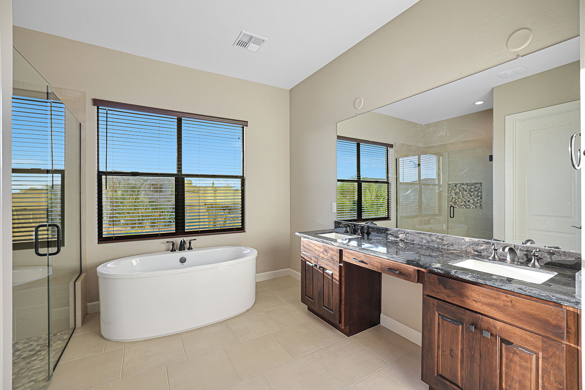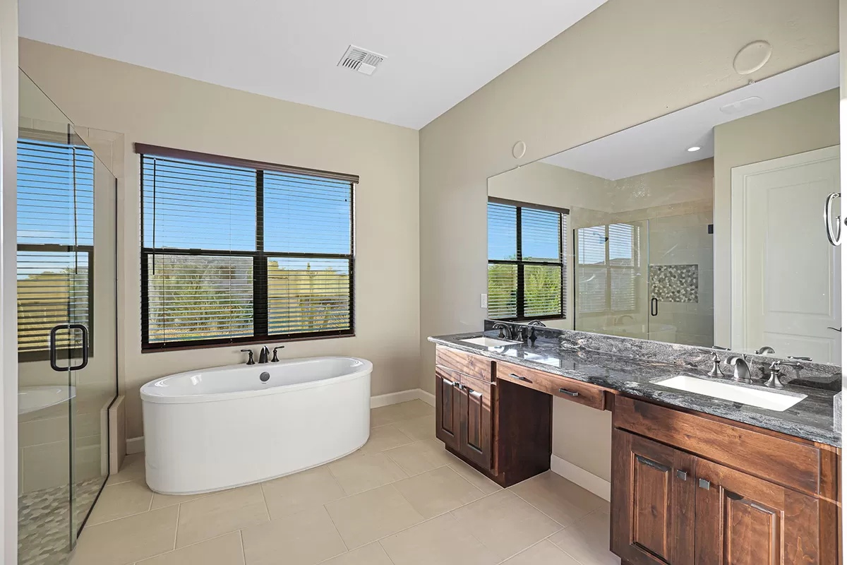 The primary suite features a retreat room with a beverage fridge, spacious enough to serve as an office or exercise room. Prepare to unwind in the lavish primary bath, complete with a free-standing soaking tub and a separate walk-in shower. Dual walk-in closets with custom storage cabinetry and dual vanities make this the ideal his and her space.