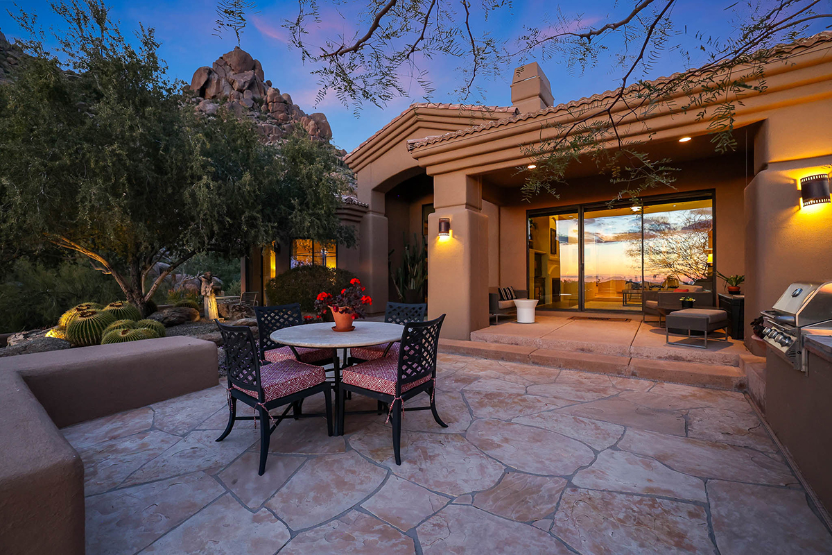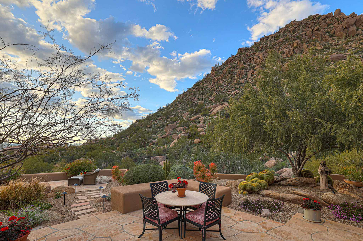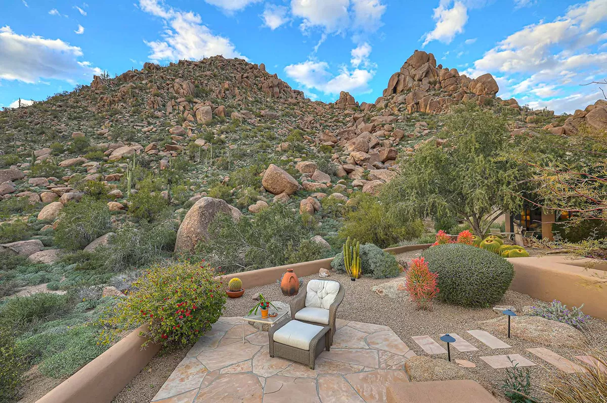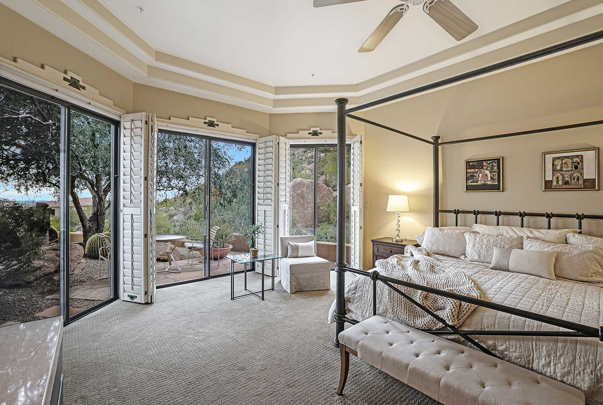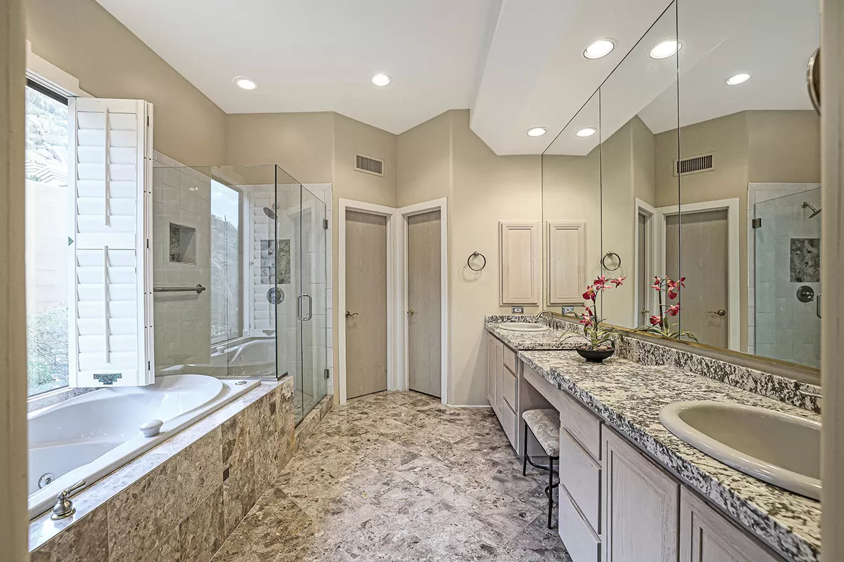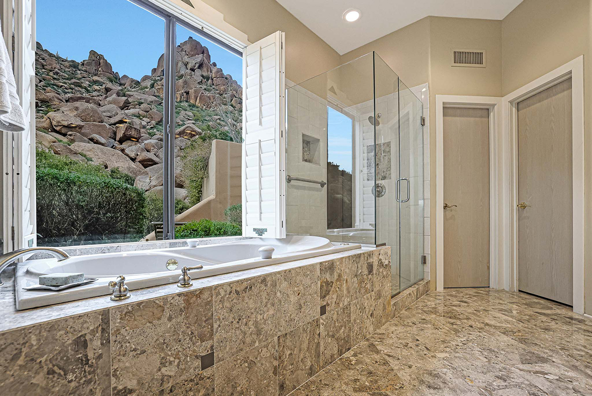 A private den with an exterior seating area and water fountain offers up close mountain views, making it the perfect space for quiet contemplation or working from home. Plantation shutters throughout the home provide privacy and light control. The primary suite is a true oasis, with marble tile accents, a jetted tub with a picture window, separate shower and a walk-in closet.