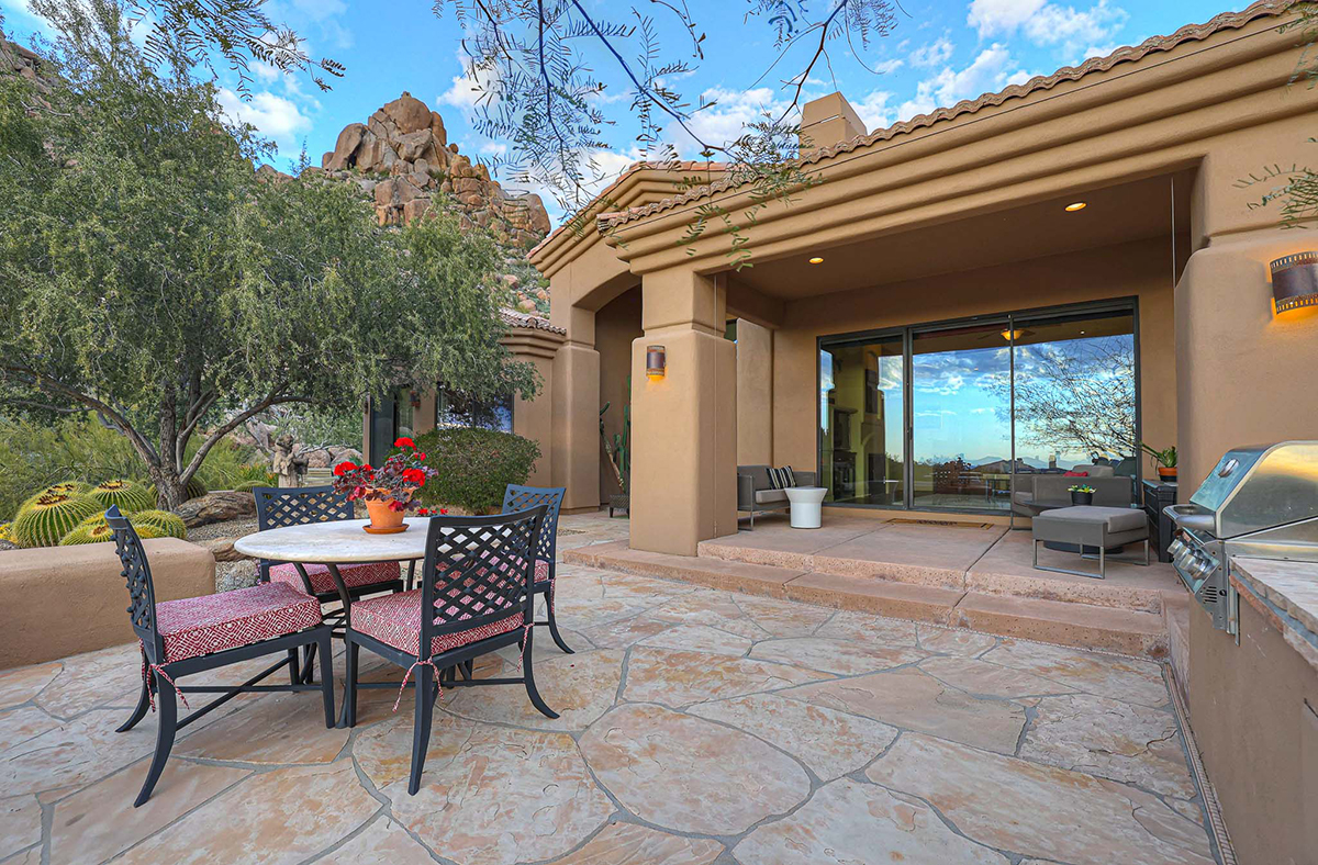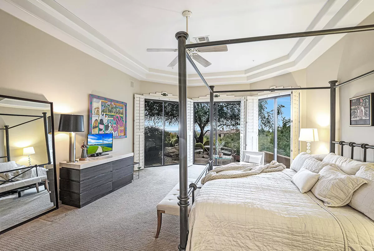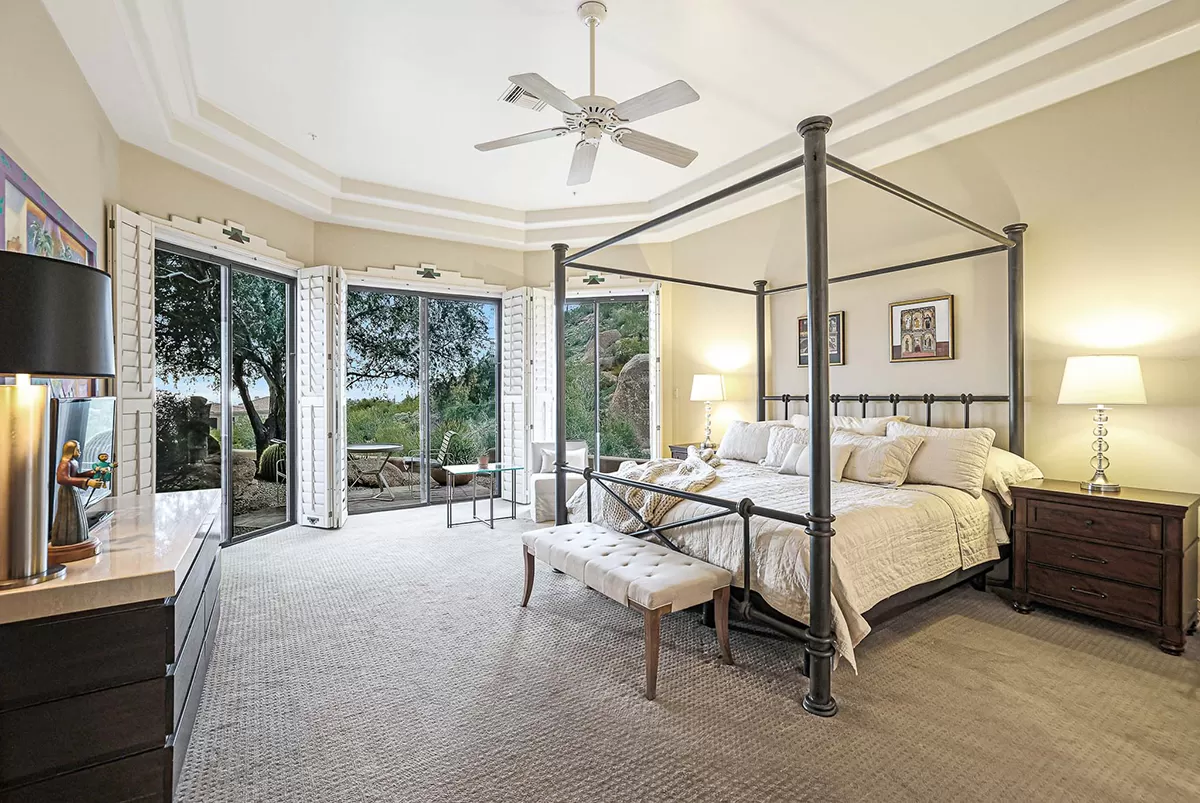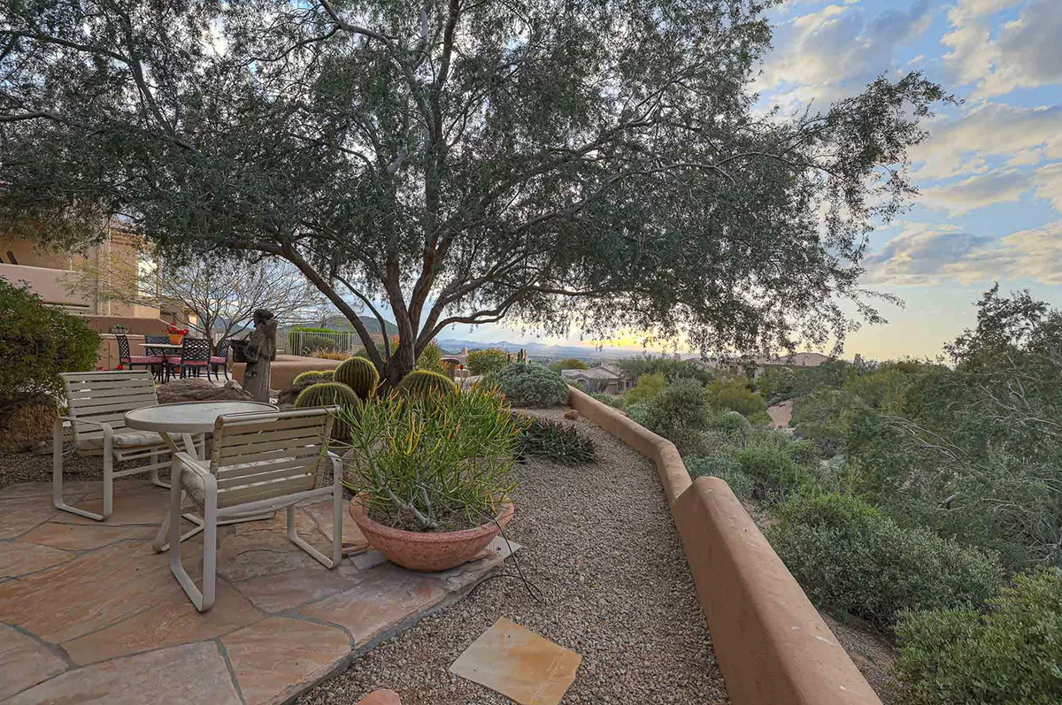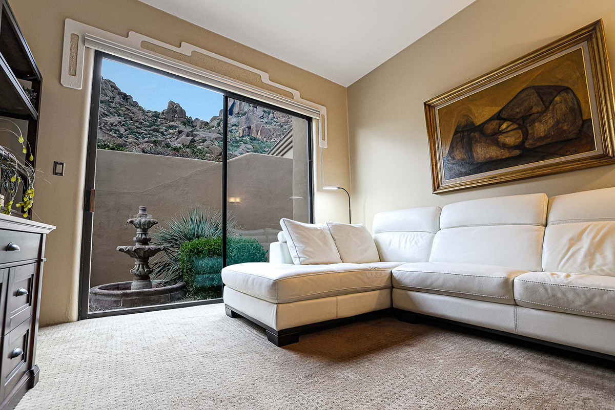 A private den with an exterior seating area and water fountain offers up close mountain views, making it the perfect space for quiet contemplation or working from home. Plantation shutters throughout the home provide privacy and light control. The primary suite is a true oasis, with marble tile accents, a jetted tub with a picture window, separate shower and a walk-in closet.