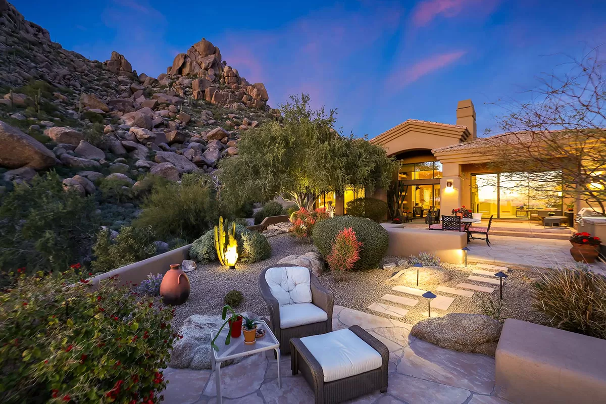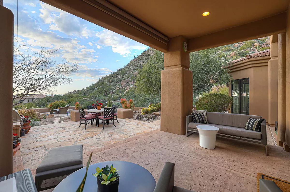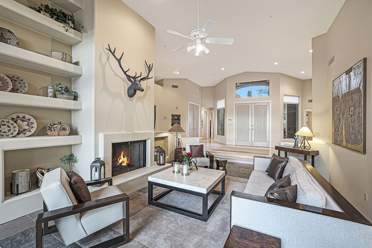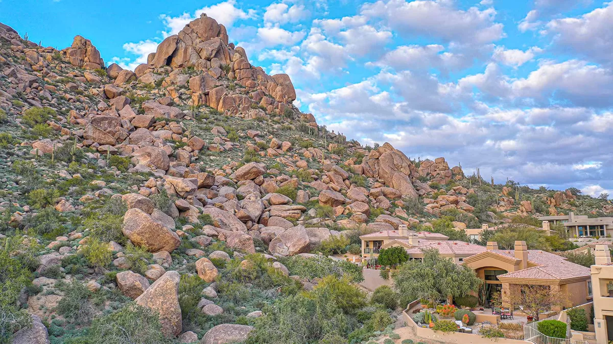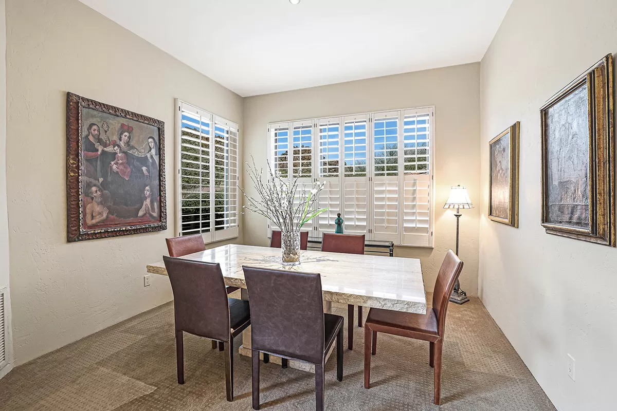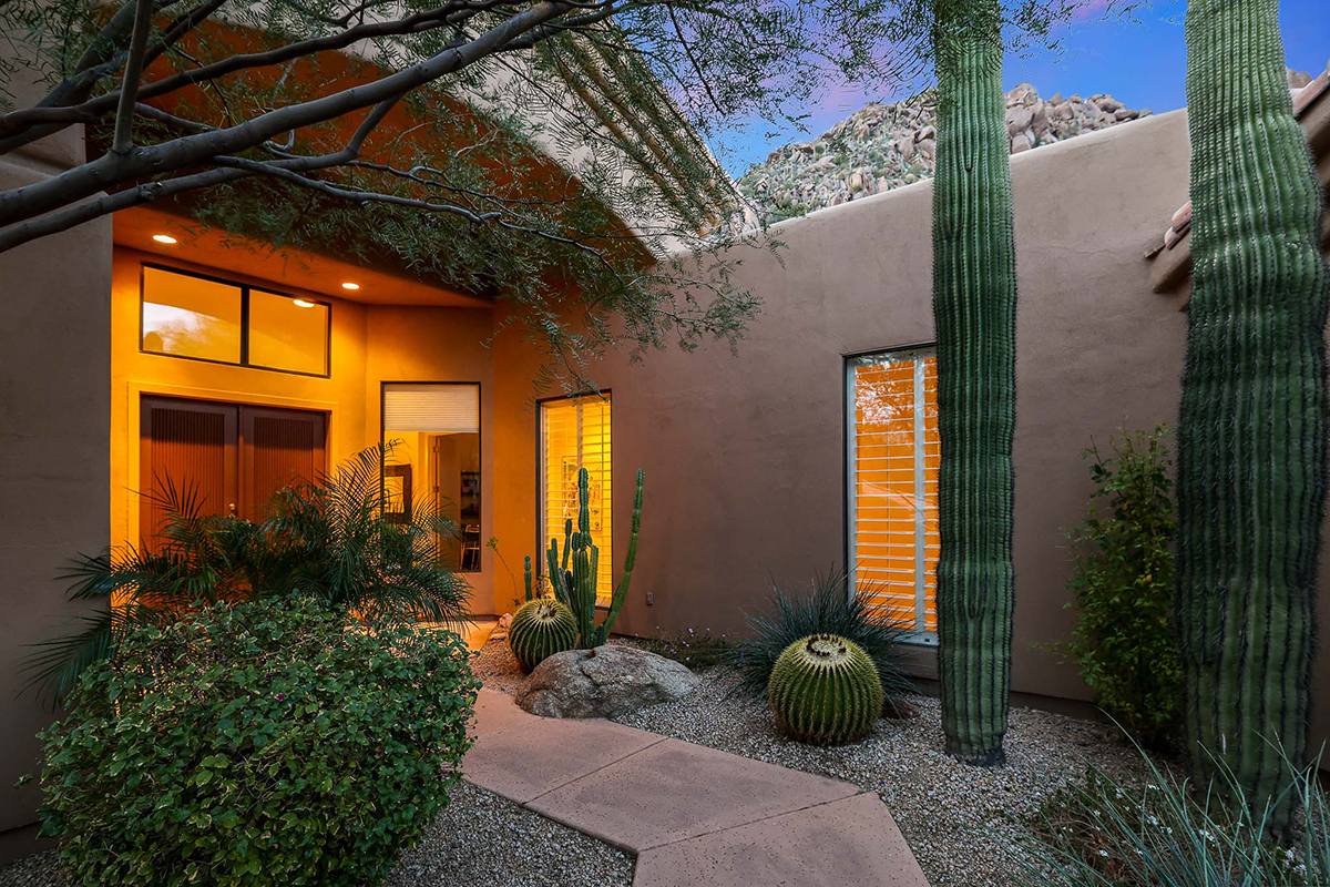A private den with an exterior seating area and water fountain offers up close mountain views, making it the perfect space for quiet contemplation or working from home. Plantation shutters throughout the home provide privacy and light control. The primary suite is a true oasis, with marble tile accents, a jetted tub with a picture window, separate shower and a walk-in closet.