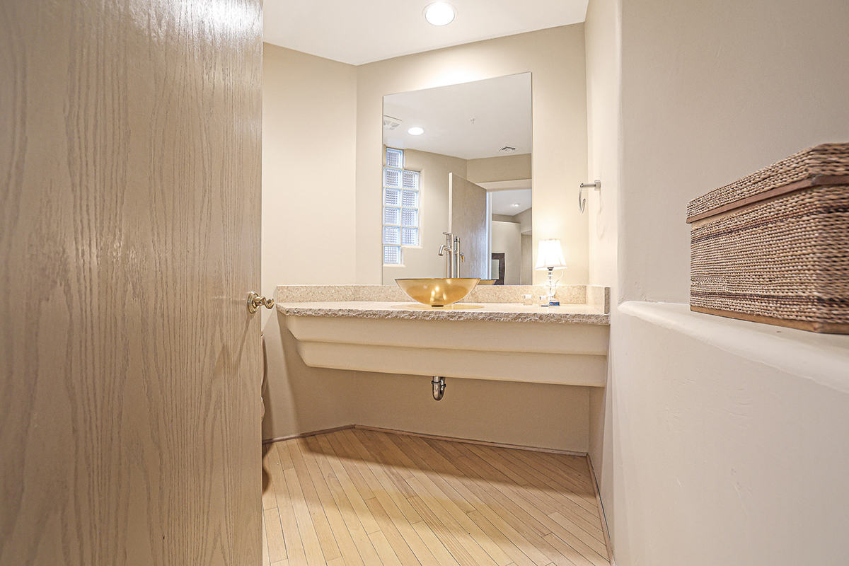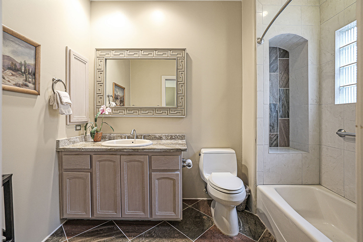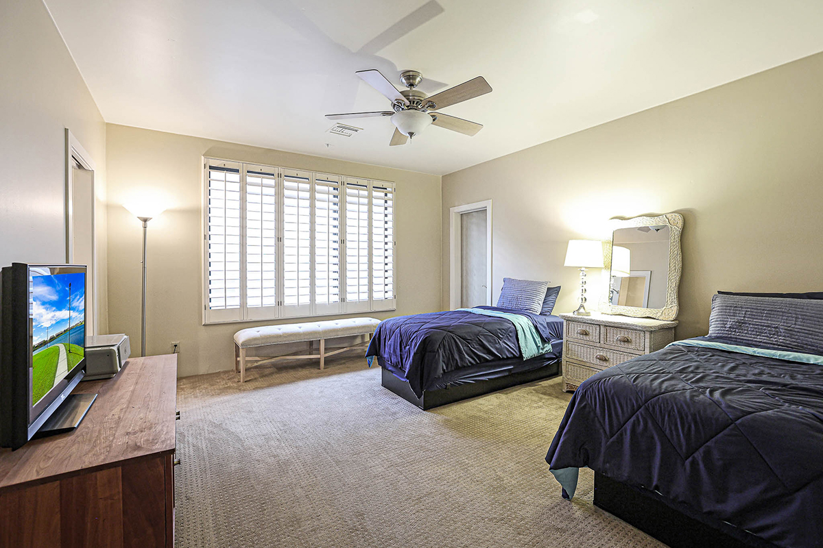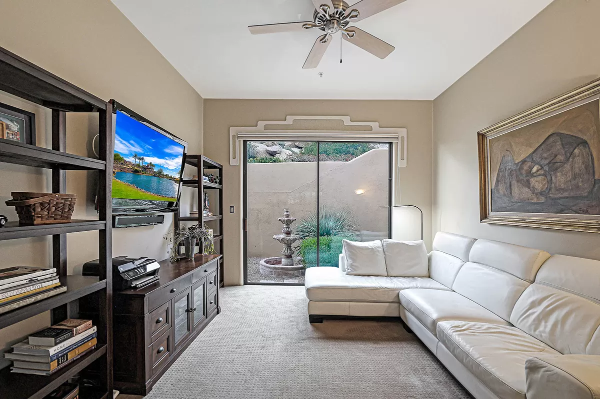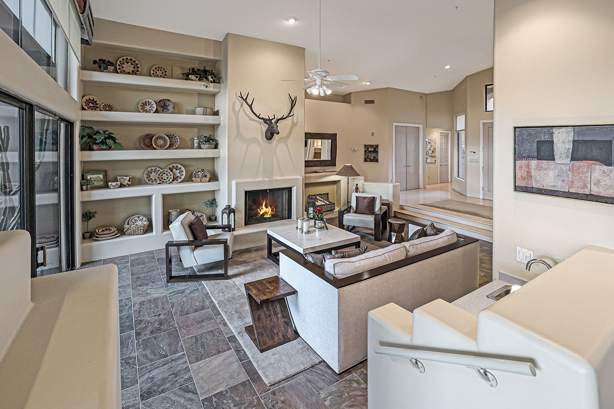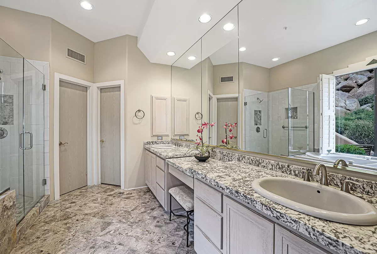 A private den with an exterior seating area and water fountain offers up close mountain views, making it the perfect space for quiet contemplation or working from home. Plantation shutters throughout the home provide privacy and light control. The primary suite is a true oasis, with marble tile accents, a jetted tub with a picture window, separate shower and a walk-in closet.
