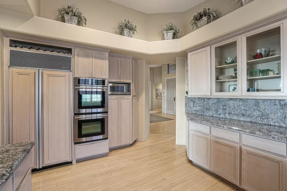 Other living spaces in the home include a living room, family room, formal dining room, and a kitchen with granite counters and plenty of counter space, as well as countertop seating and a breakfast area. The two car garage features epoxy floors, while the common areas boast wood and slate floors.