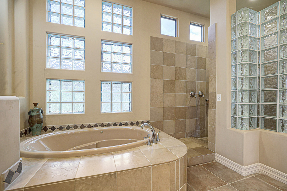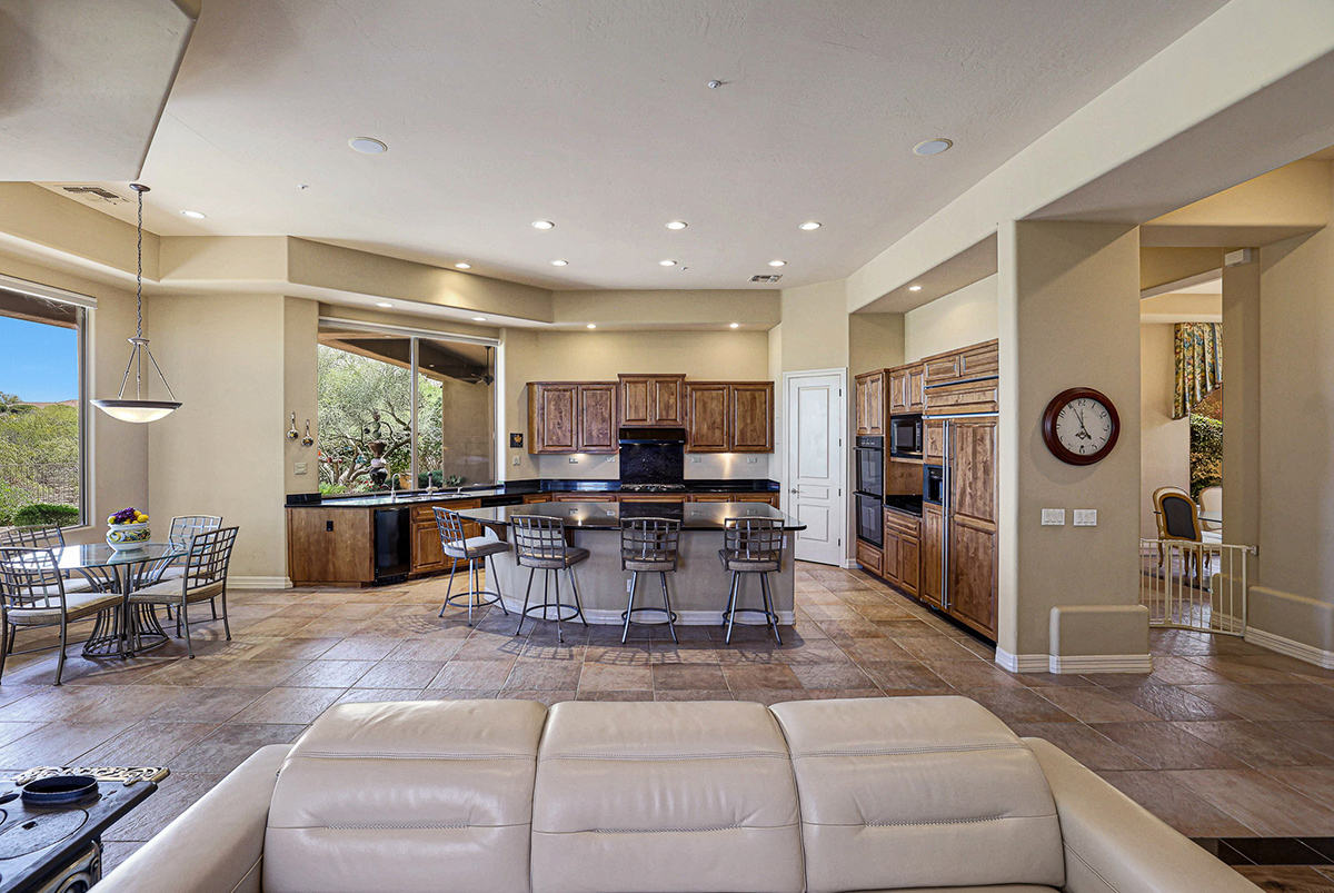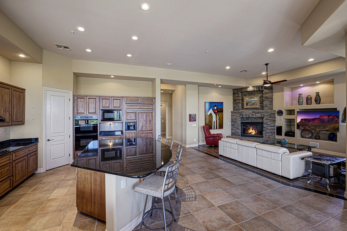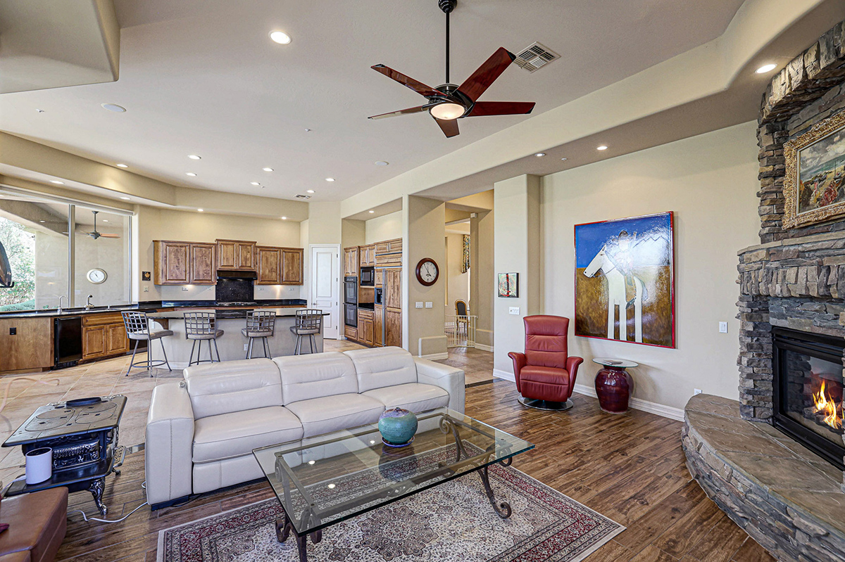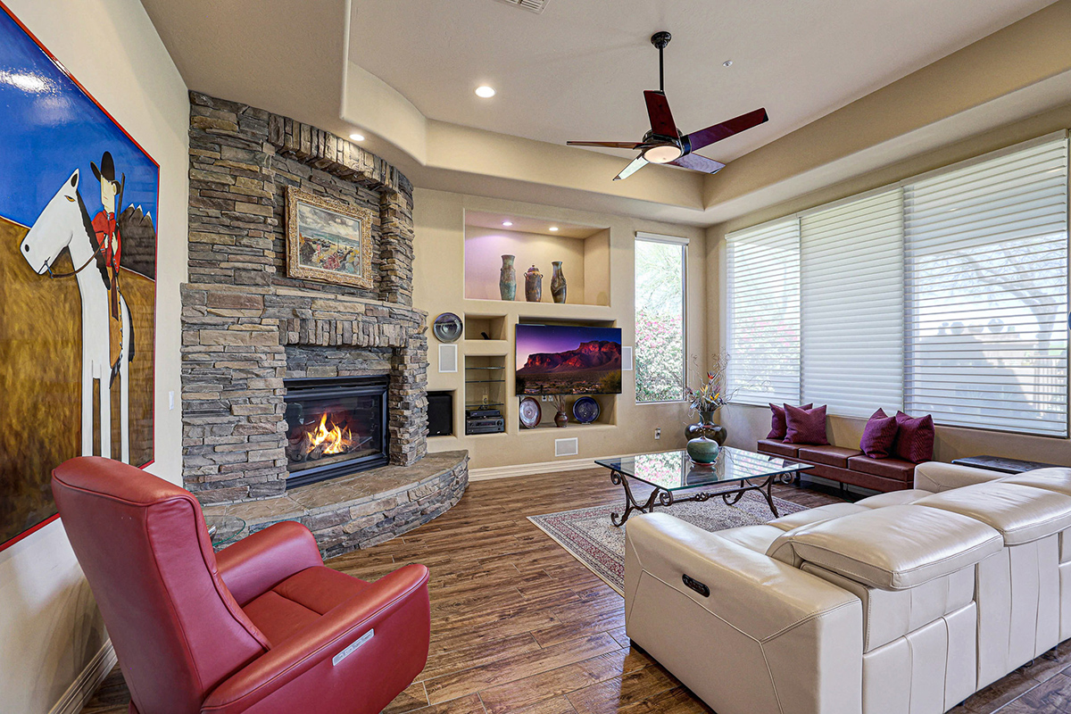 The kitchen opens to the family room and breakfast nook, ideal for casual gatherings. The family room boasts wood look tile floors, art niches, mechanical light-filtering shades, and a stacked stone fireplace.