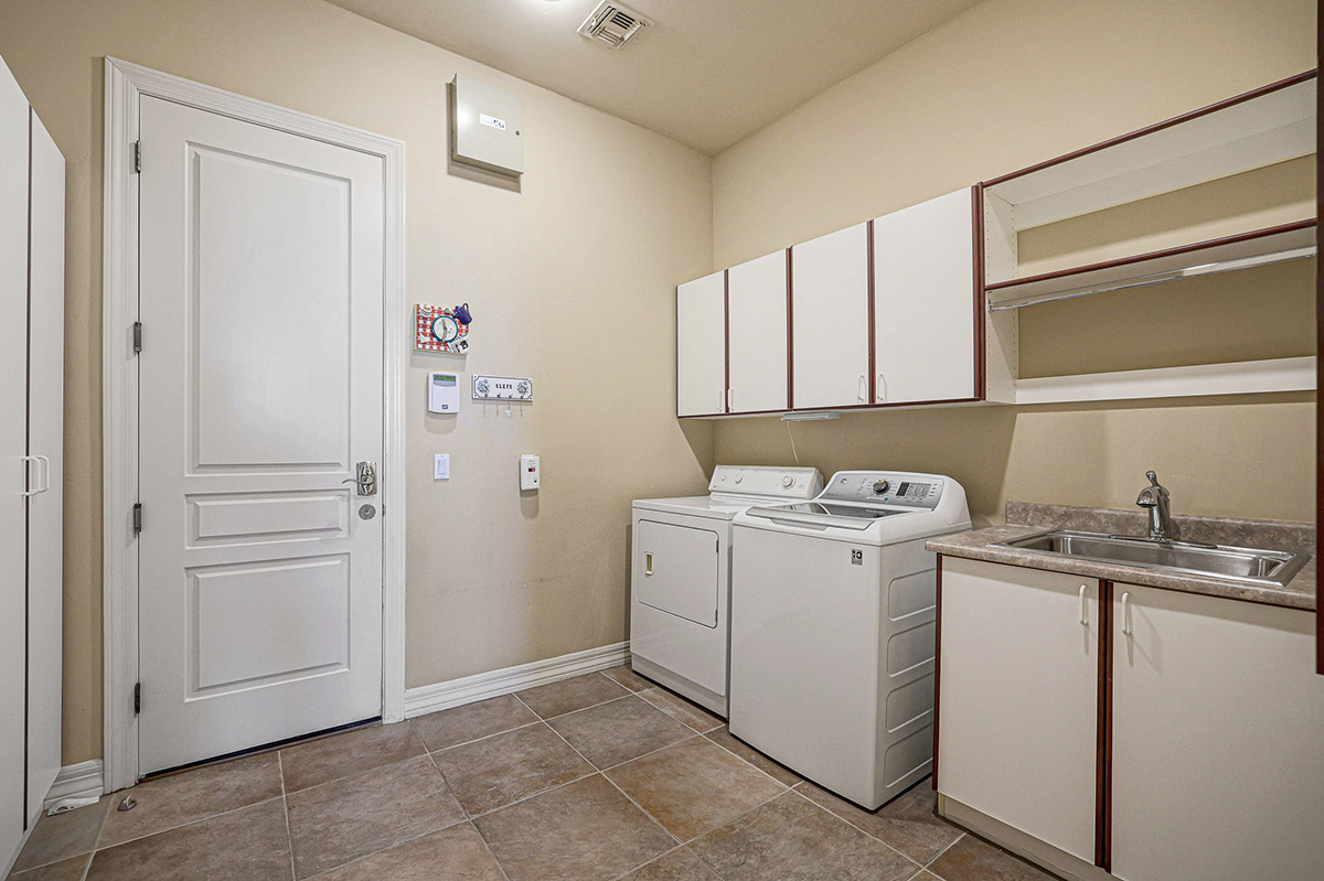 Convenience abounds with a 3-car garage offering direct entry into the large laundry room with a sink and ample storage space. A gated courtyard with a paver walkway welcomes you home, while a large paver drive leads to the side entry garage.