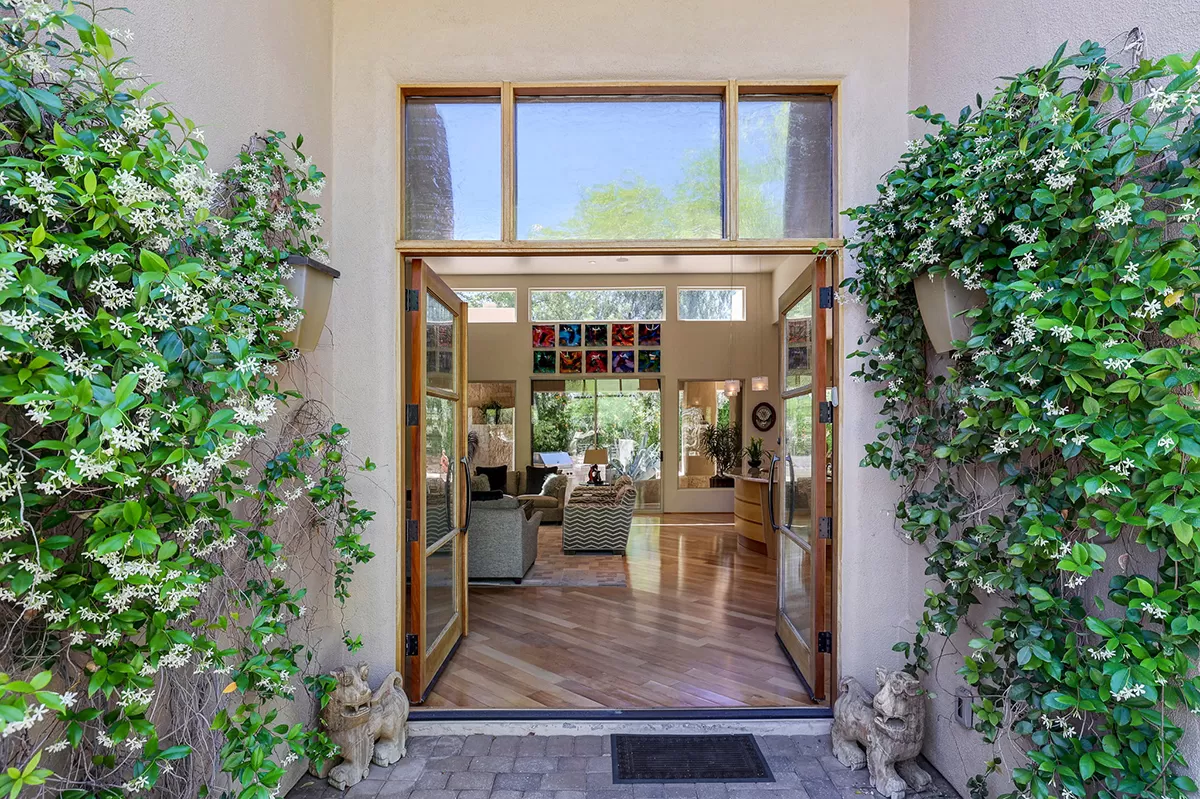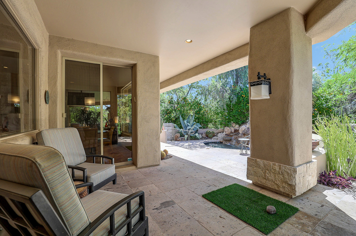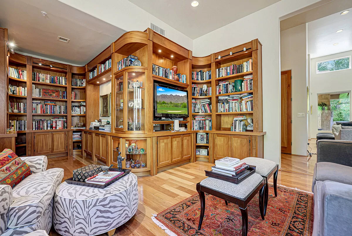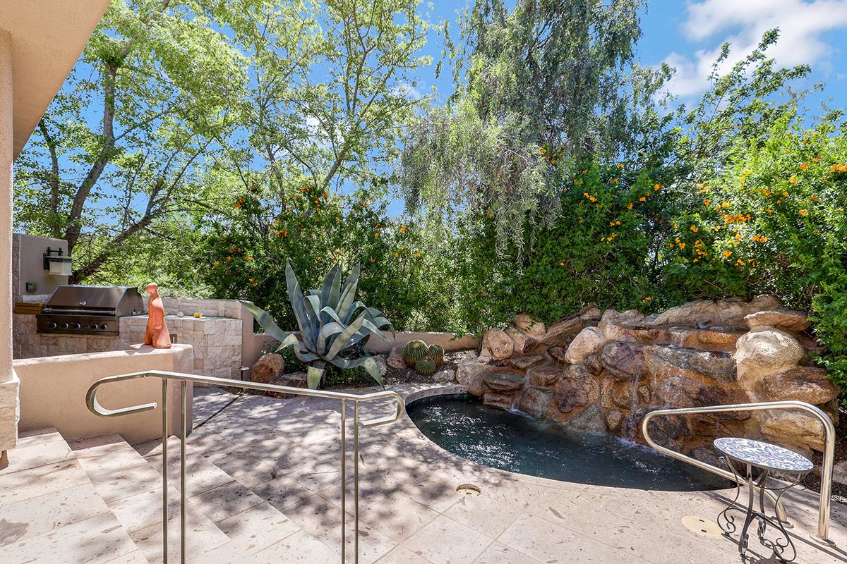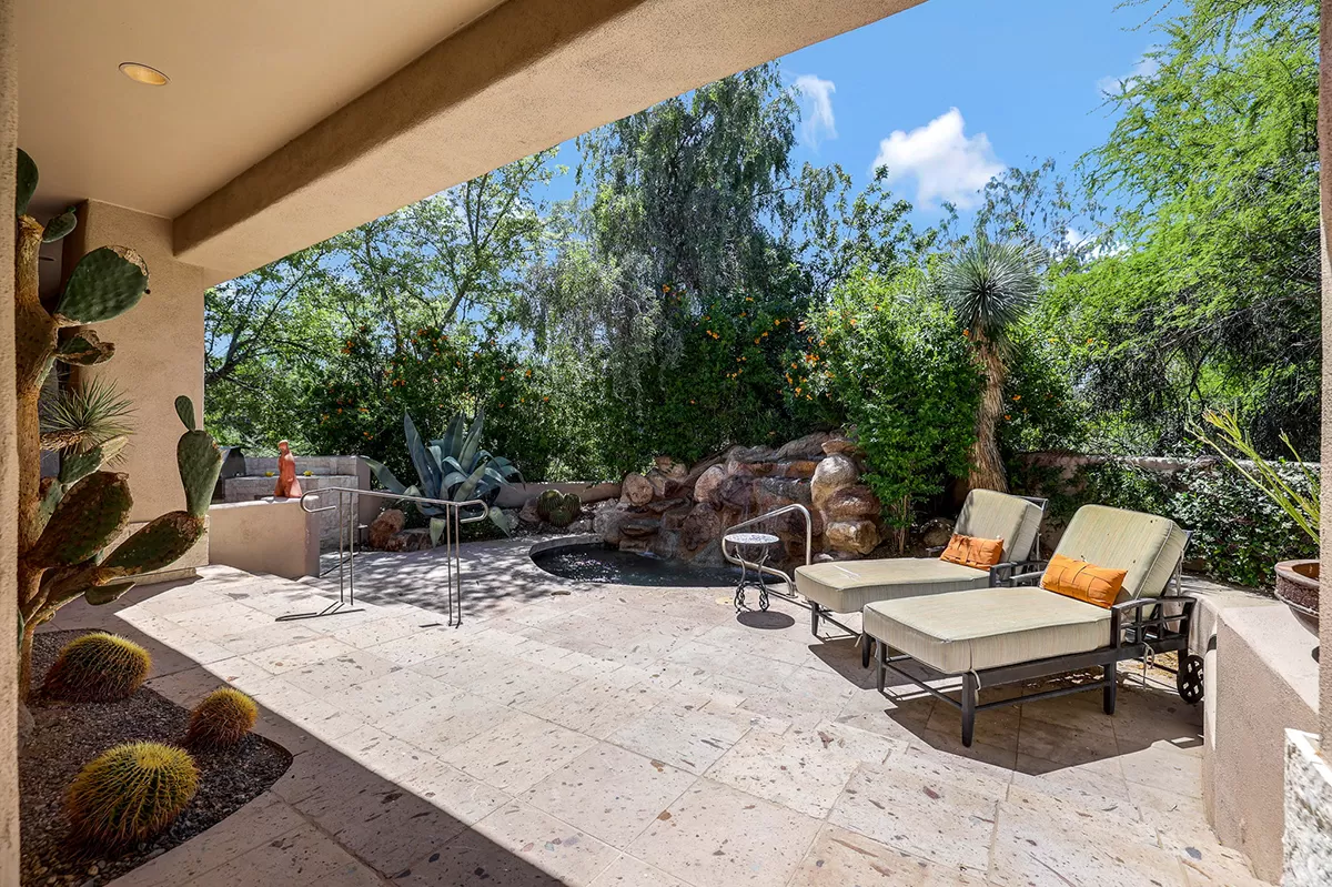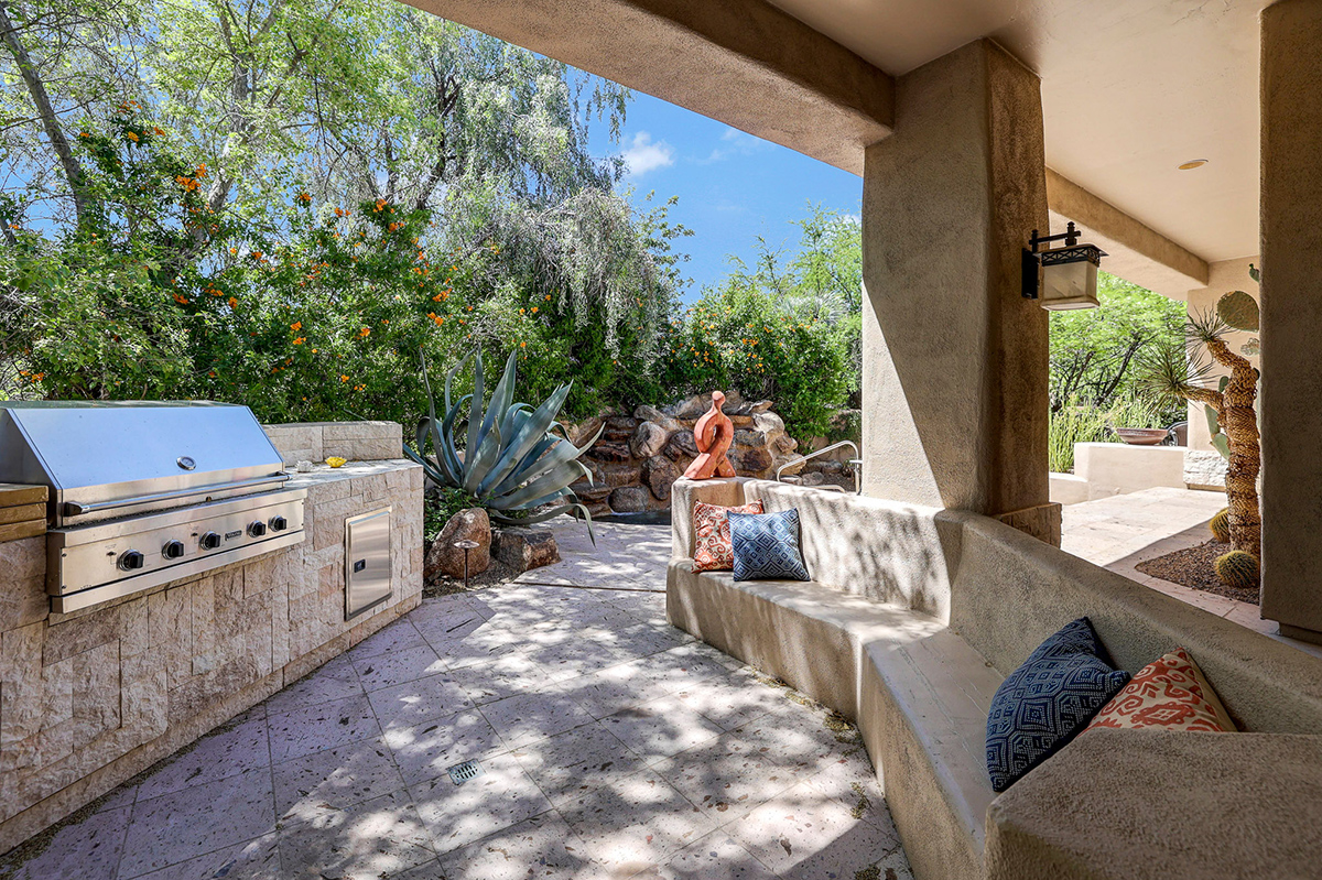 Outside, a desert oasis awaits, with lush vegetation, built-in barbecue, fireplace, covered patios, and a spa—perfect for dining al fresco. The primary suite and library occupy one wing of the home, offering a serene sanctuary for relaxation. Meanwhile, two guest suites and an office reside on the opposite wing, ensuring privacy for all.