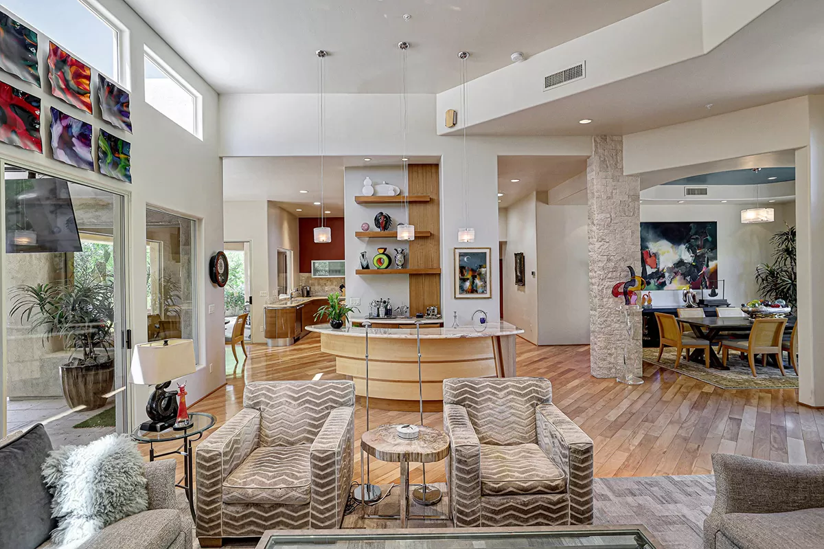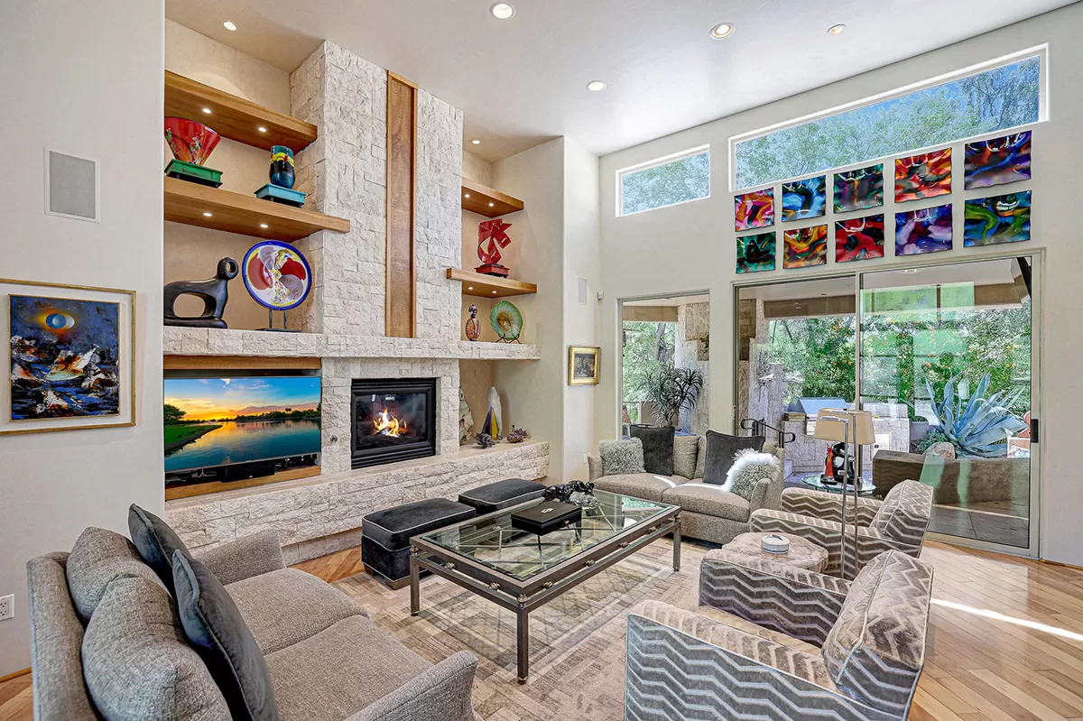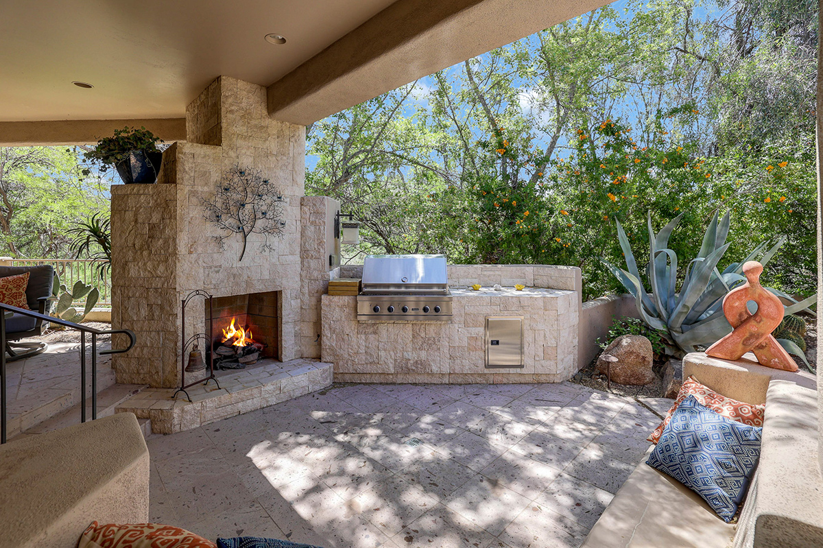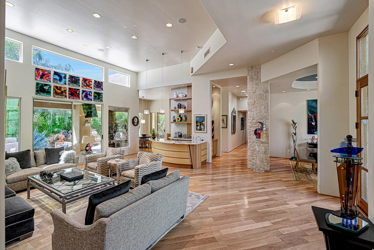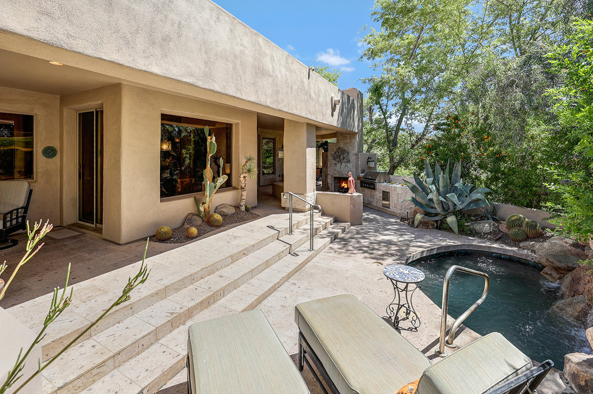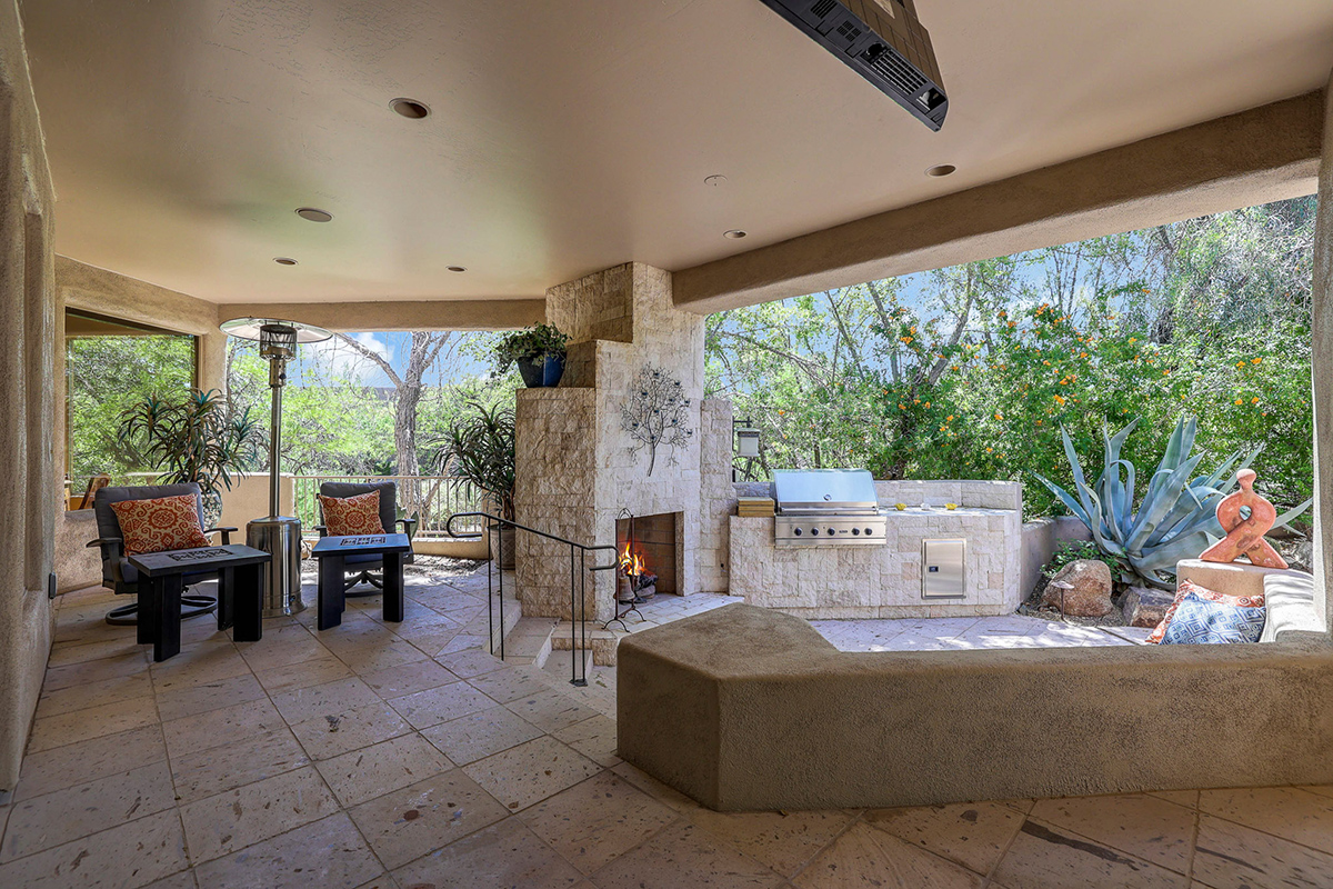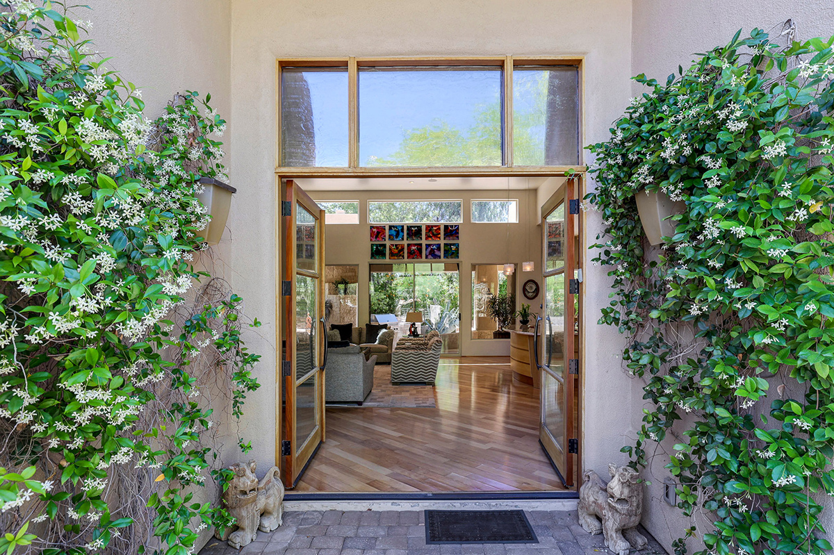 Outside, a desert oasis awaits, with lush vegetation, built-in barbecue, fireplace, covered patios, and a spa—perfect for dining al fresco. The primary suite and library occupy one wing of the home, offering a serene sanctuary for relaxation. Meanwhile, two guest suites and an office reside on the opposite wing, ensuring privacy for all.