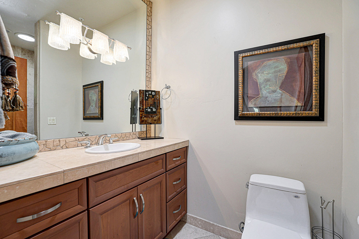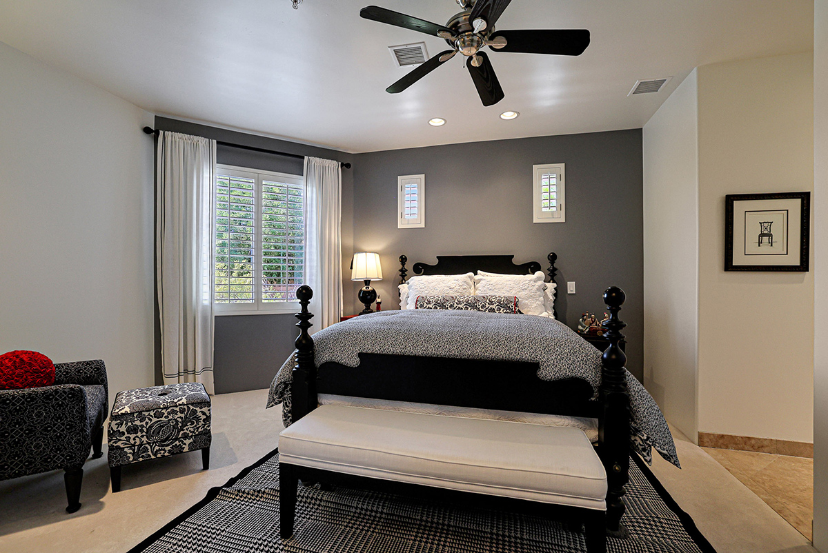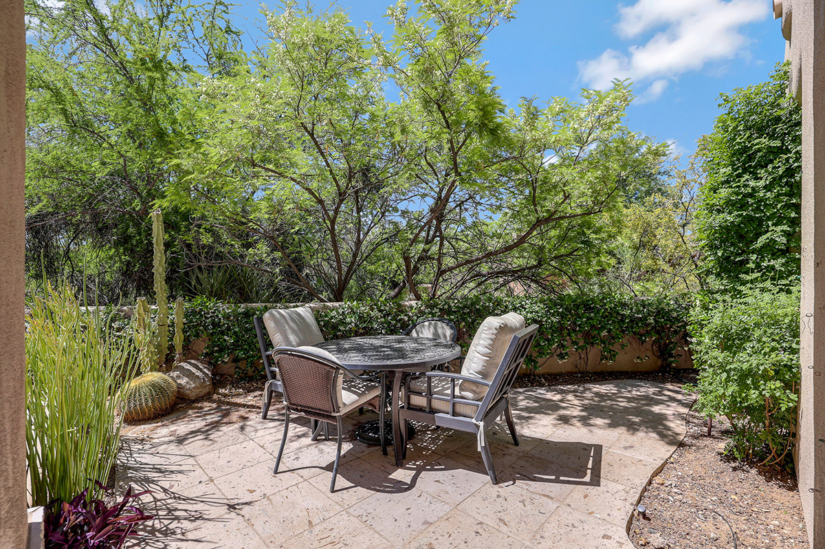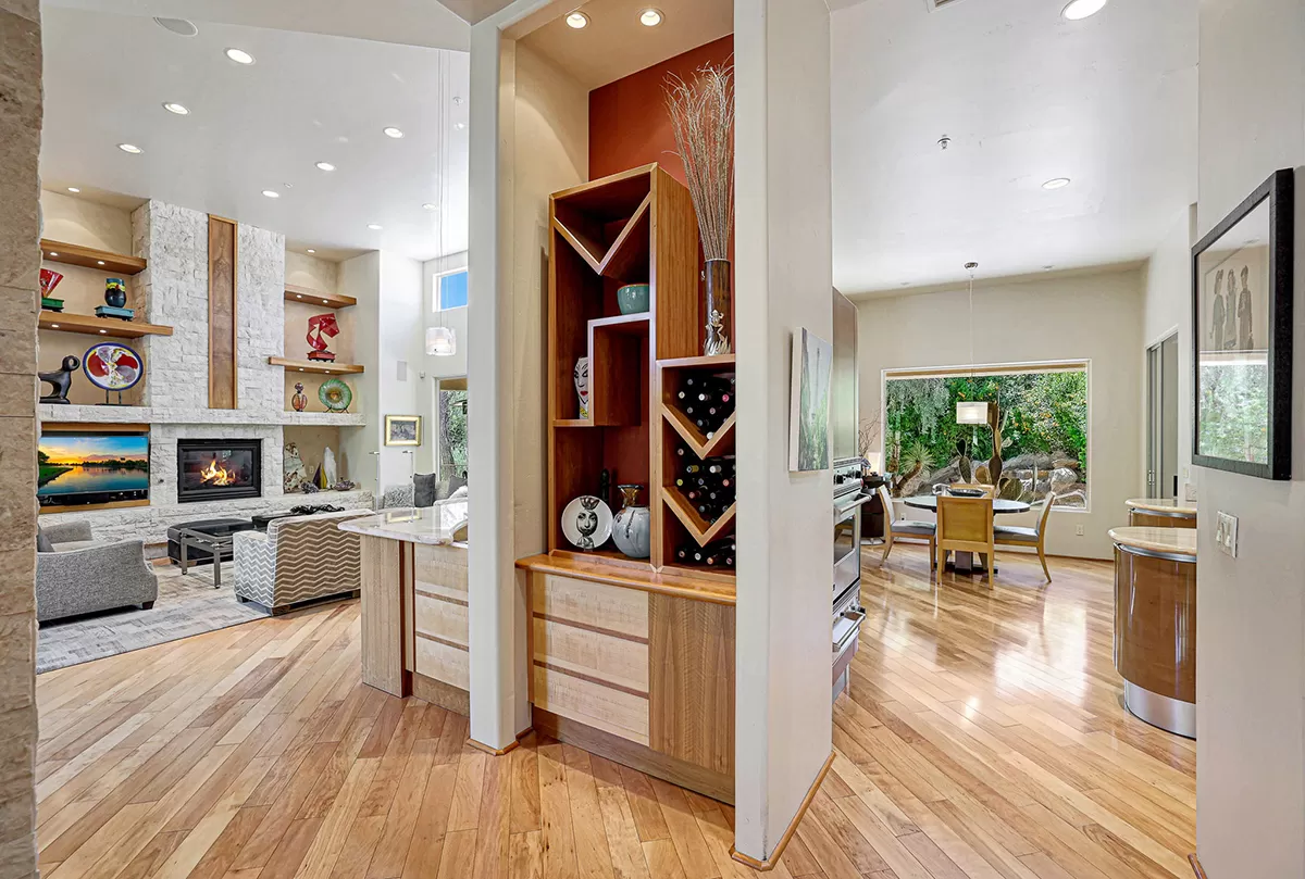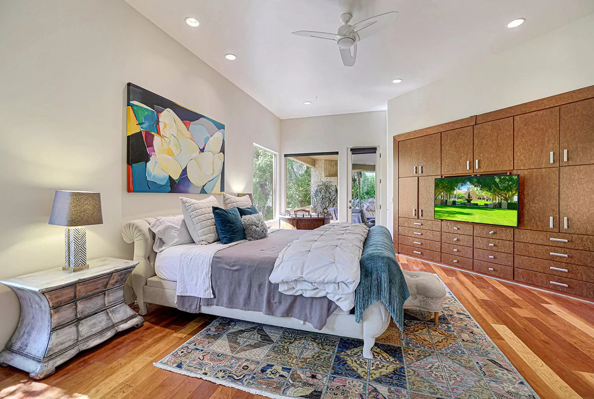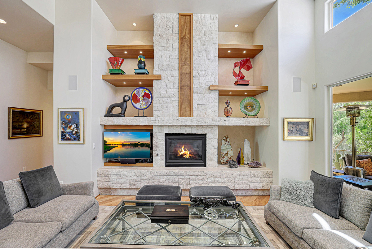 Outside, a desert oasis awaits, with lush vegetation, built-in barbecue, fireplace, covered patios, and a spa—perfect for dining al fresco. The primary suite and library occupy one wing of the home, offering a serene sanctuary for relaxation. Meanwhile, two guest suites and an office reside on the opposite wing, ensuring privacy for all.