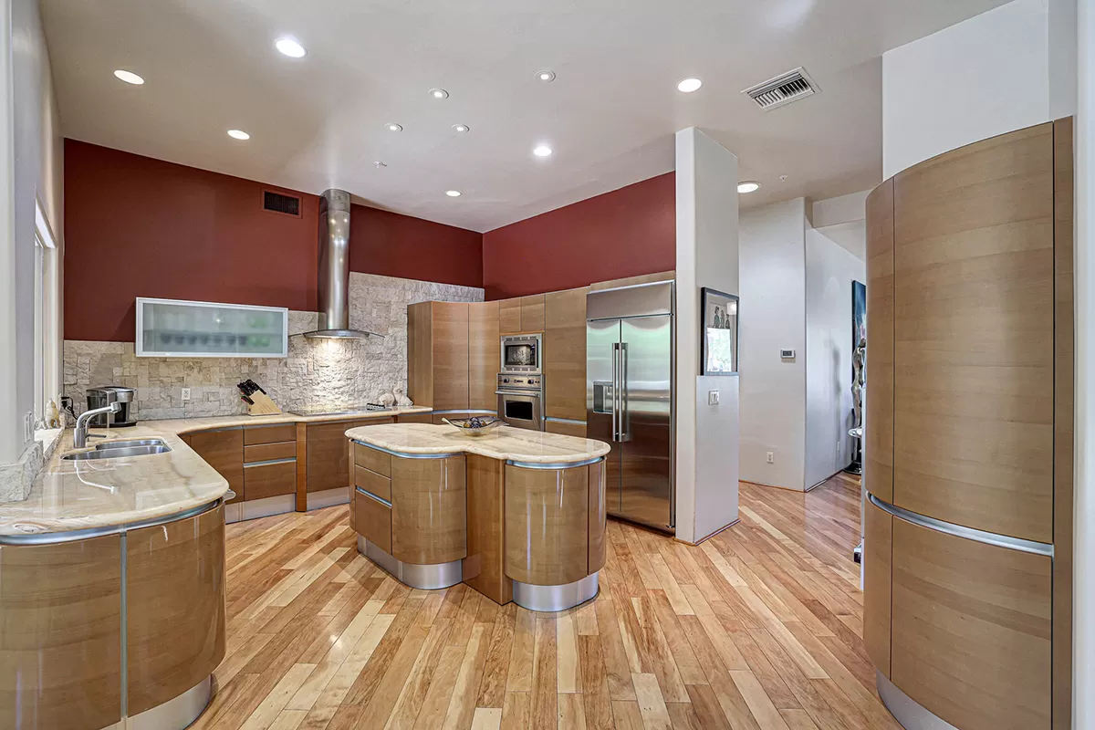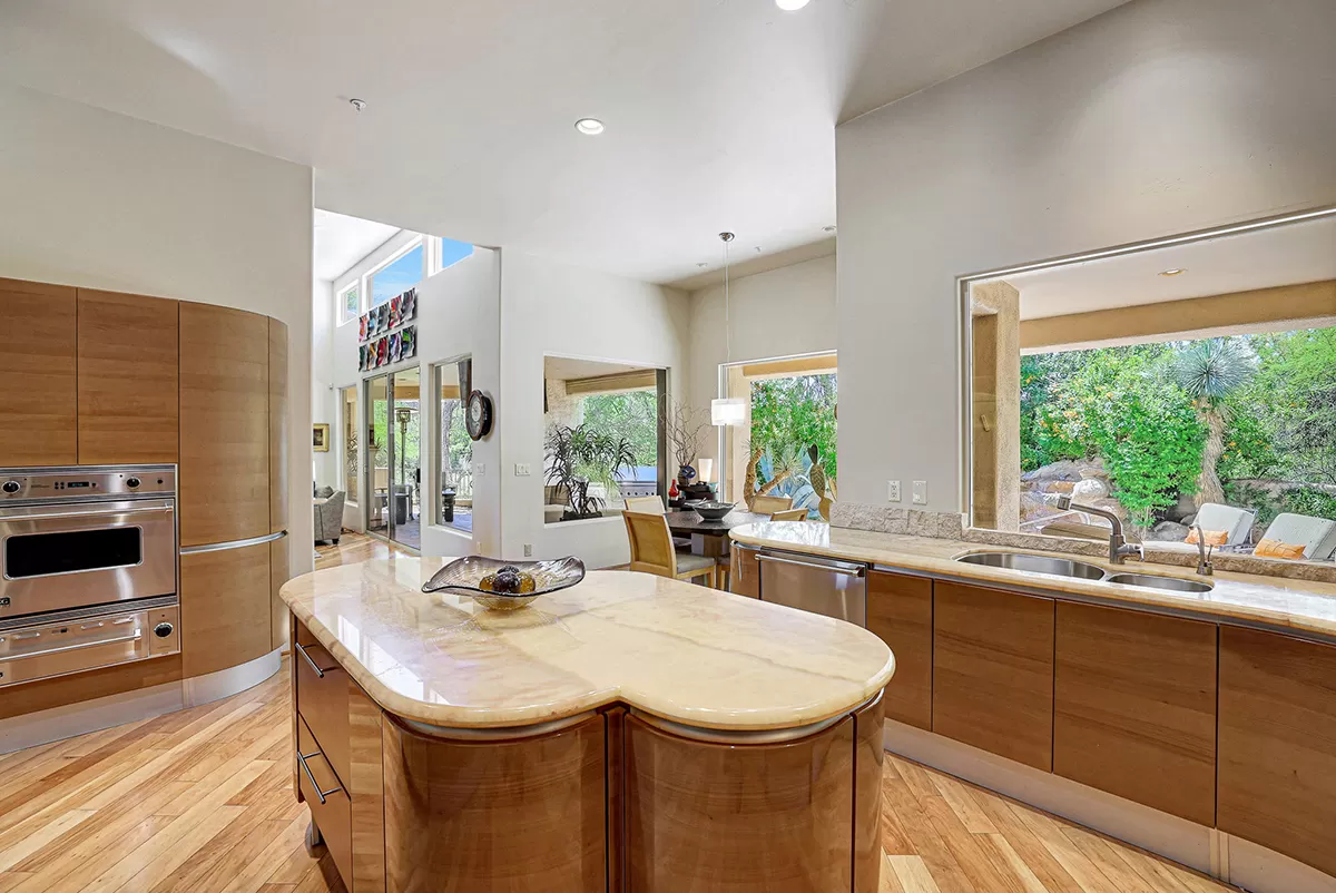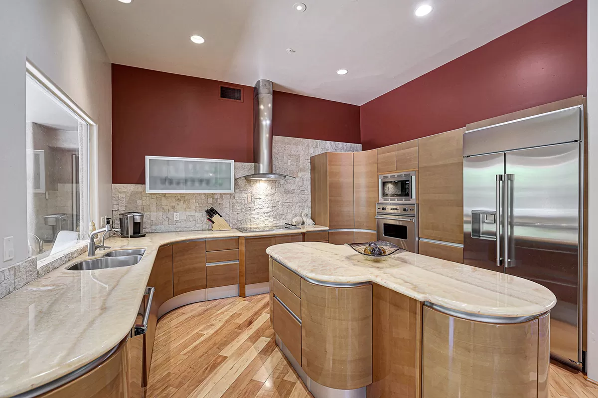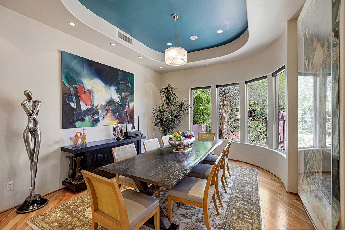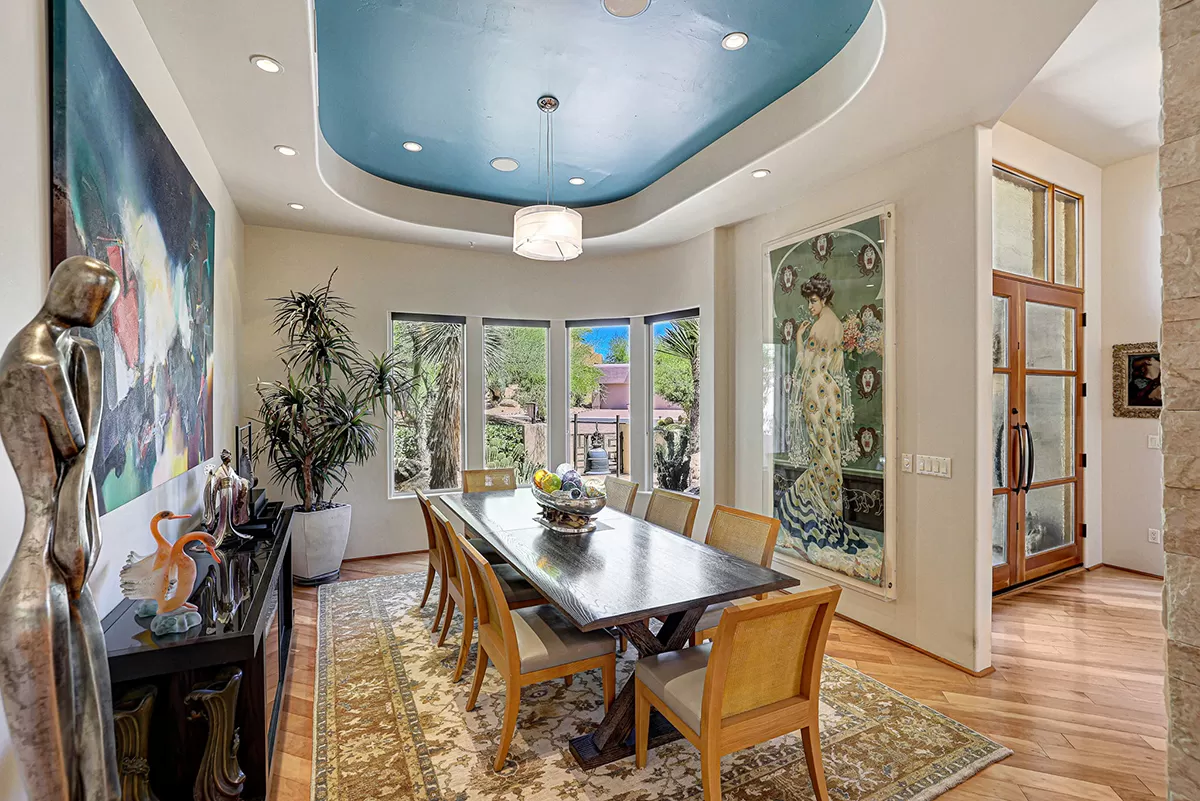 The heart of the home, the great room, beckons with its soaring ceilings, clerestory windows, wet bar, and a stunning centerpiece fireplace adorned with art niches and stone accents. Entertain with ease in the formal dining room, graced with a coved ceiling and views of the entry courtyard with a water fountain. For the culinary enthusiast, the kitchen is superb, featuring European-style gloss-coated cabinets, Viking stainless steel appliances, onyx stone countertops, and a stone backsplash.