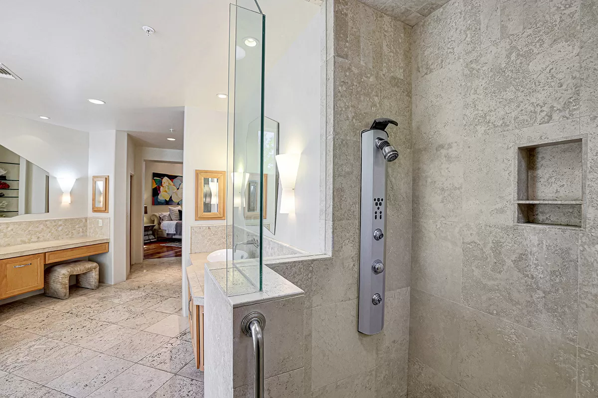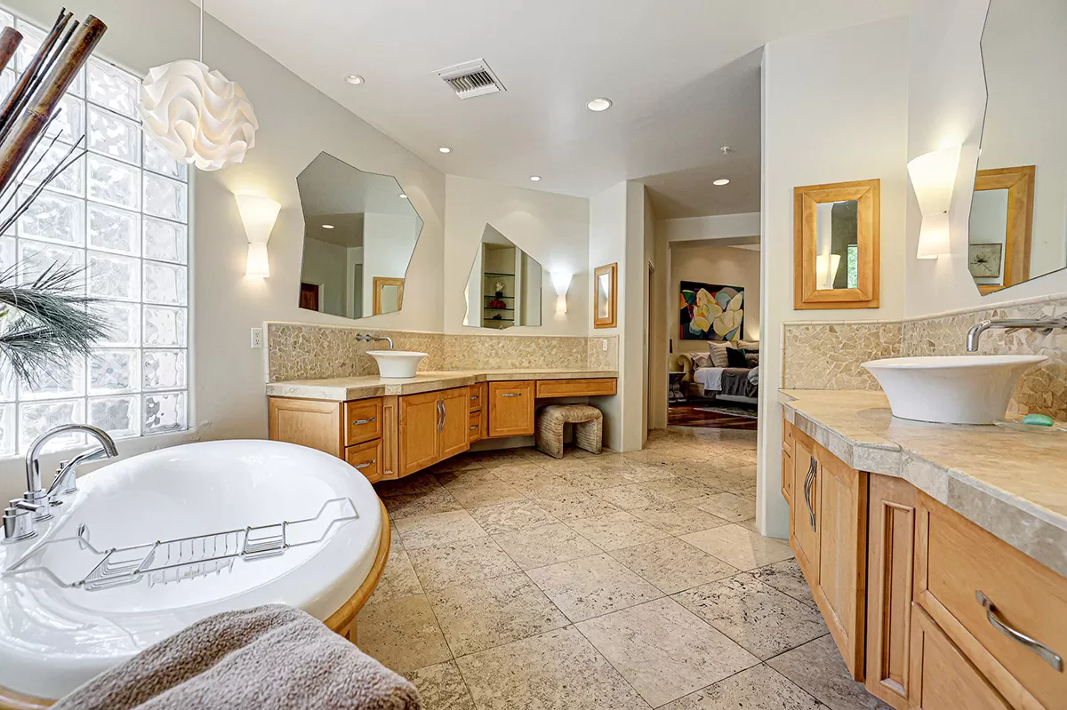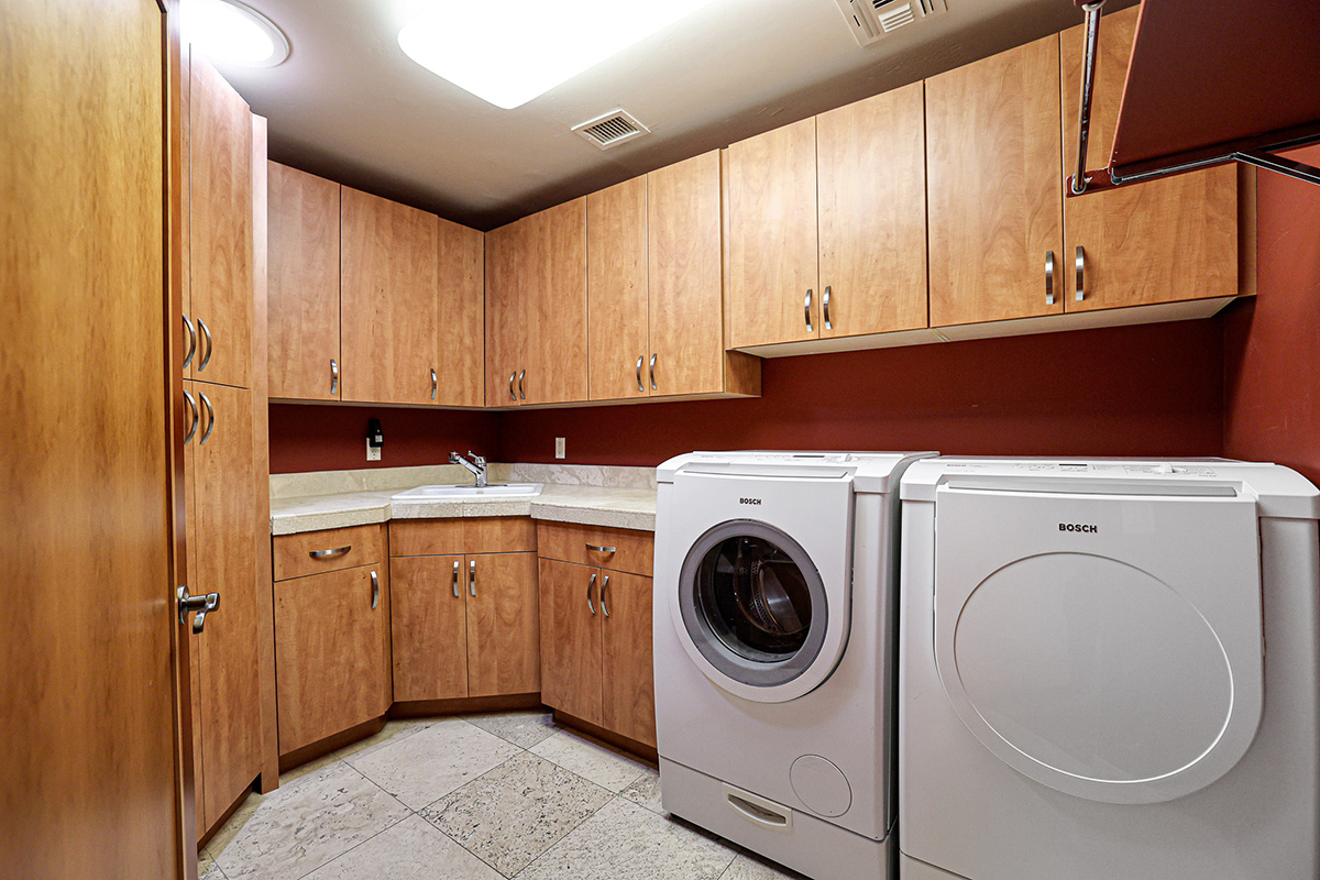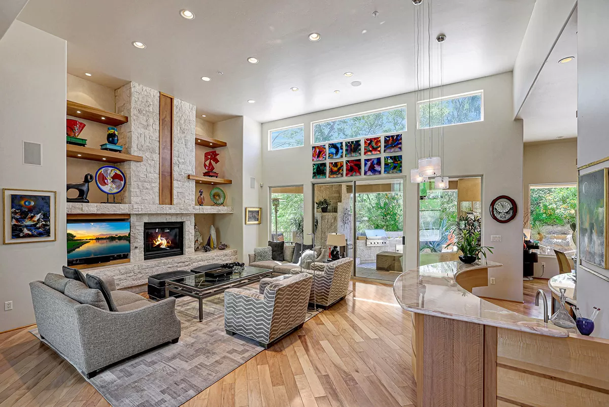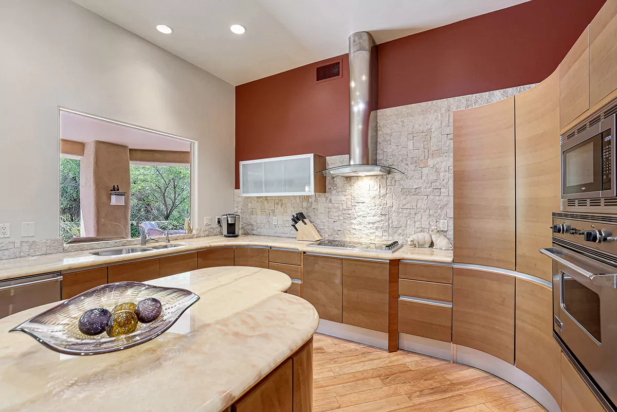 The heart of the home, the great room, beckons with its soaring ceilings, clerestory windows, wet bar, and a stunning centerpiece fireplace adorned with art niches and stone accents. Entertain with ease in the formal dining room, graced with a coved ceiling and views of the entry courtyard with a water fountain. For the culinary enthusiast, the kitchen is superb, featuring European-style gloss-coated cabinets, Viking stainless steel appliances, onyx stone countertops, and a stone backsplash.