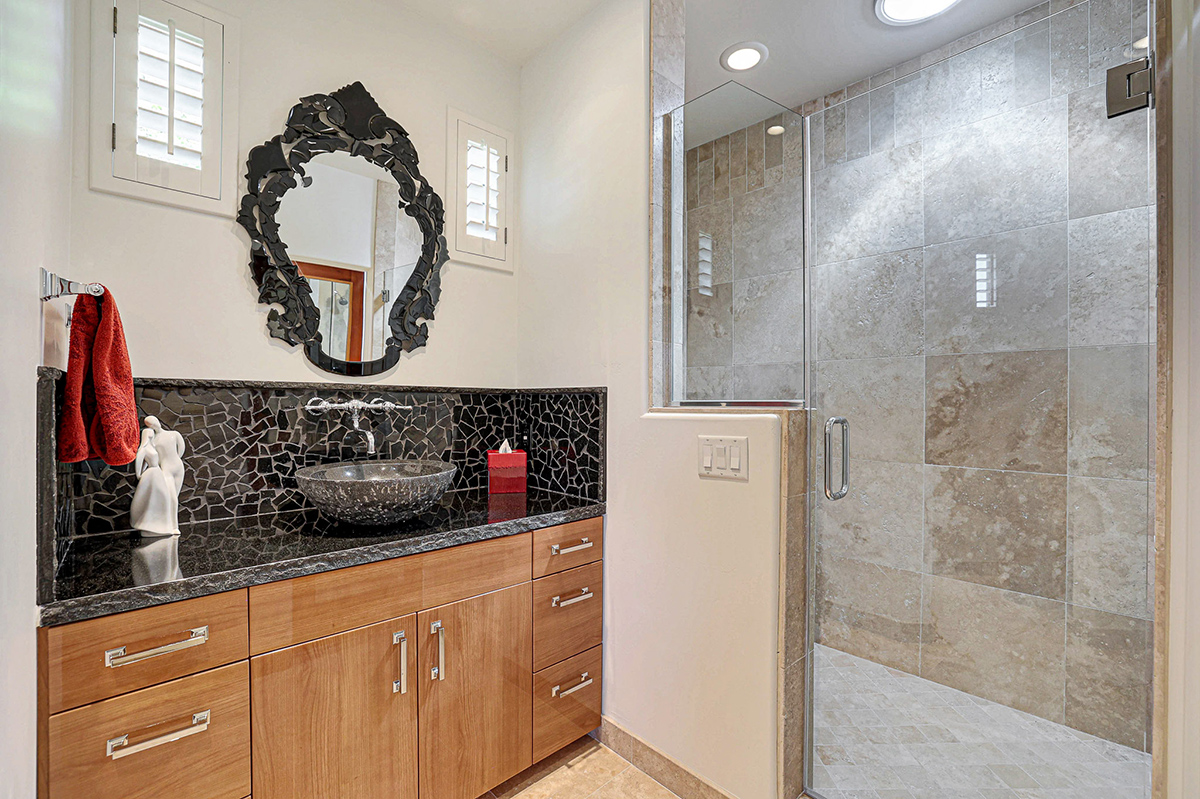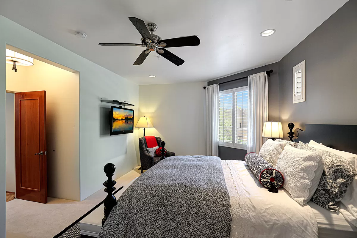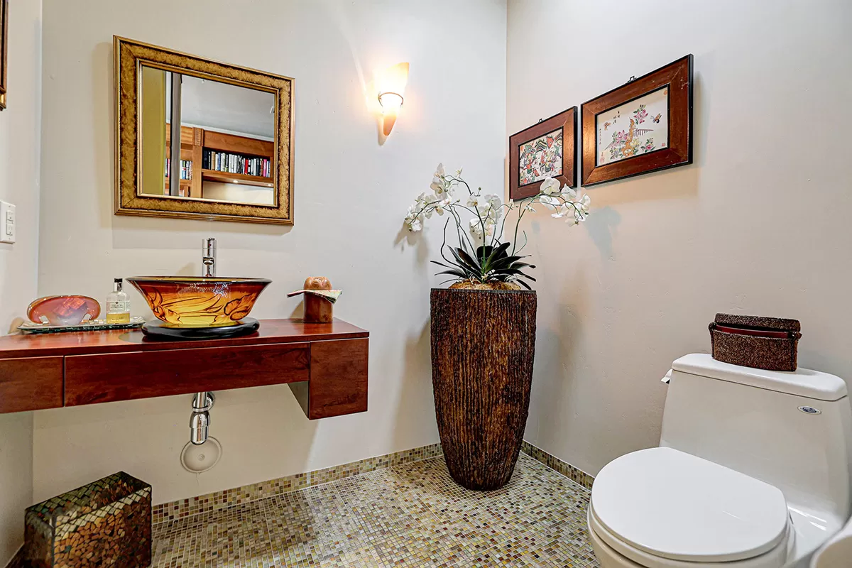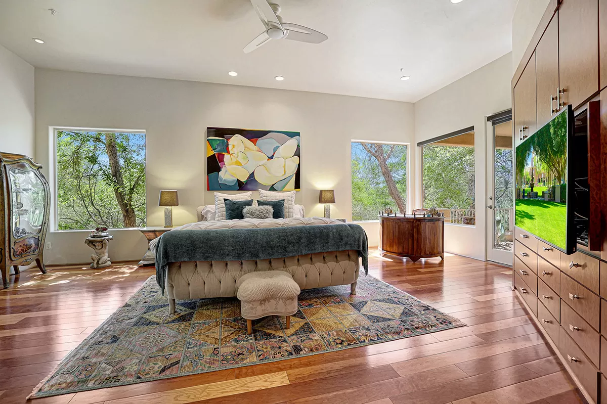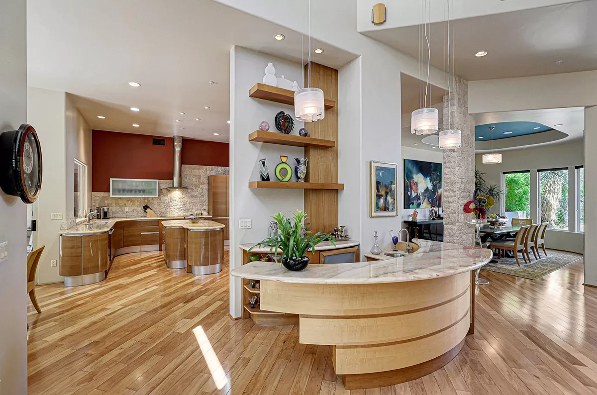 The heart of the home, the great room, beckons with its soaring ceilings, clerestory windows, wet bar, and a stunning centerpiece fireplace adorned with art niches and stone accents. Entertain with ease in the formal dining room, graced with a coved ceiling and views of the entry courtyard with a water fountain. For the culinary enthusiast, the kitchen is superb, featuring European-style gloss-coated cabinets, Viking stainless steel appliances, onyx stone countertops, and a stone backsplash.