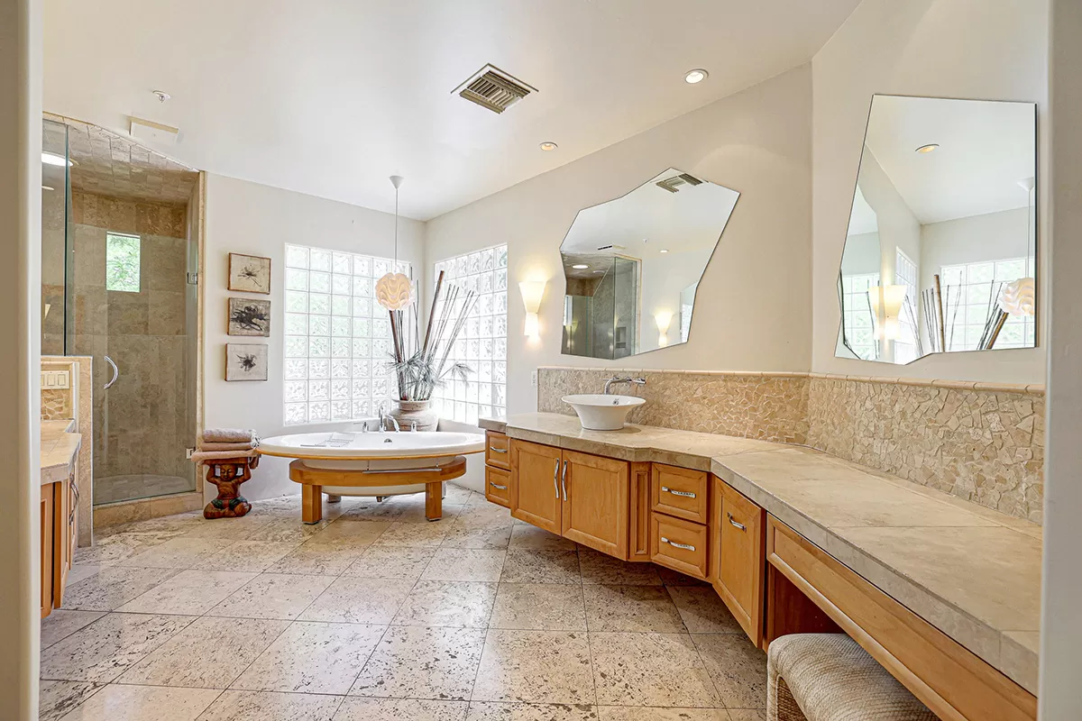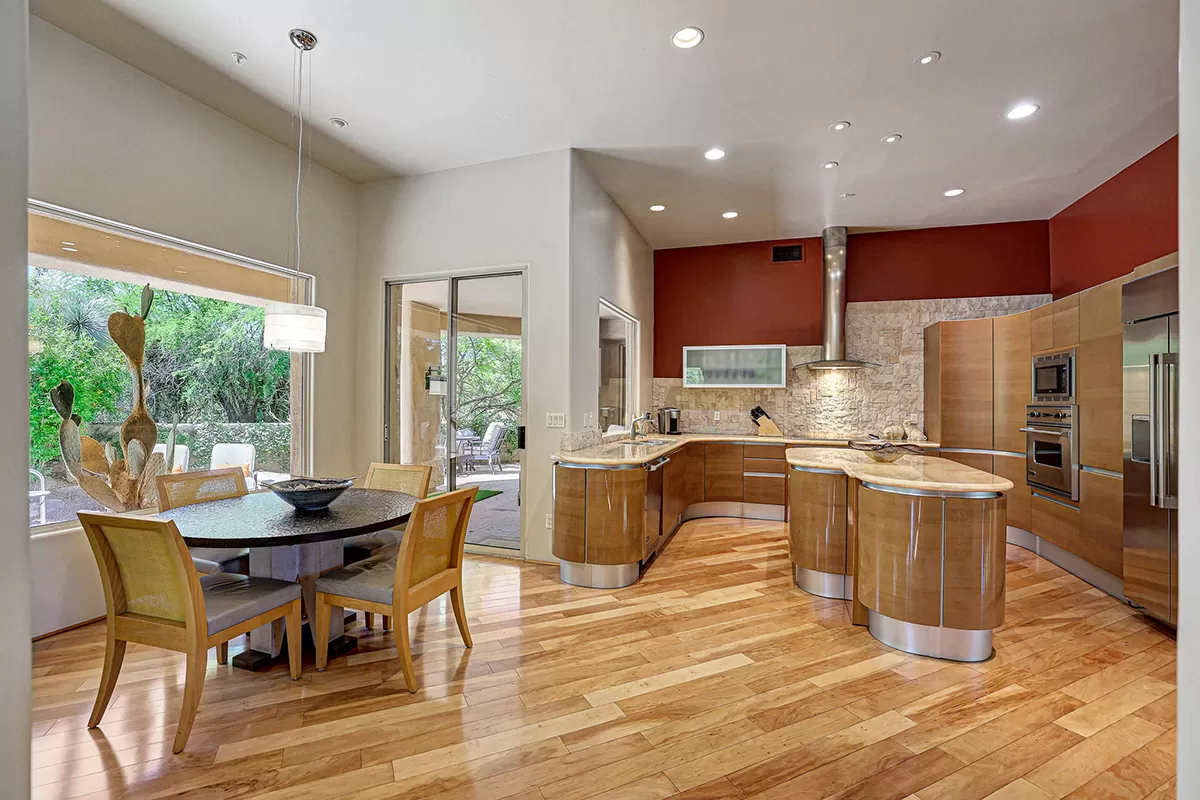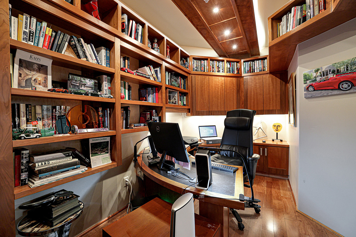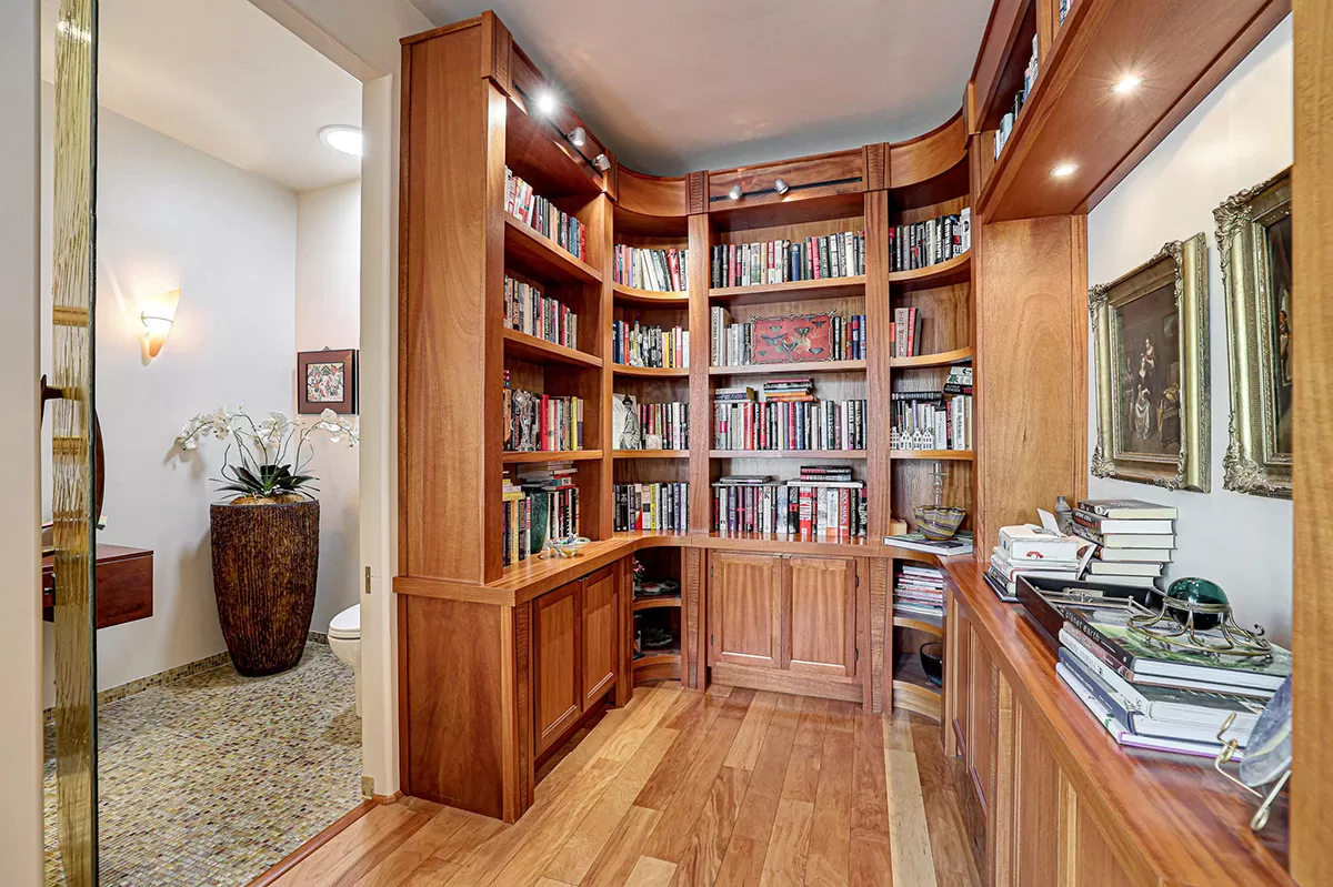 A breakfast nook and exterior patio access complete this space. The primary bedroom retreat boasts exterior access, dual floating vanities, a walk-in shower, and a freestanding tub, offering an escape. The library provides a perfect retreat with corner windows, built-in wrap-around bookshelves, and an attached powder bath. Additional highlights include a laundry room with ample cabinetry and a prep sink, a three-car garage with attached cabinets, and wood and tile floors throughout. Most furnishings are available by separate bill of sale.