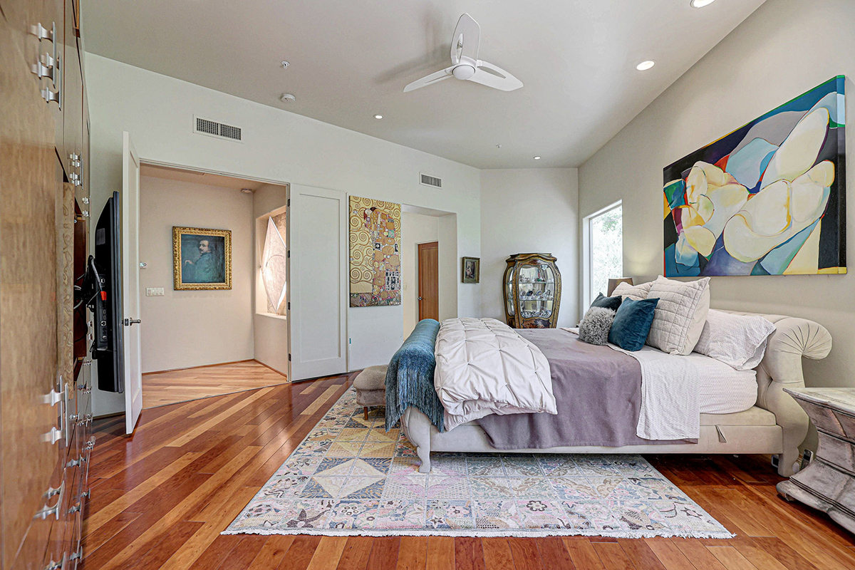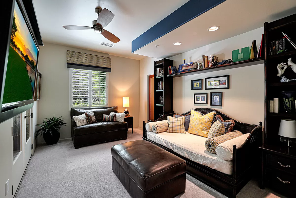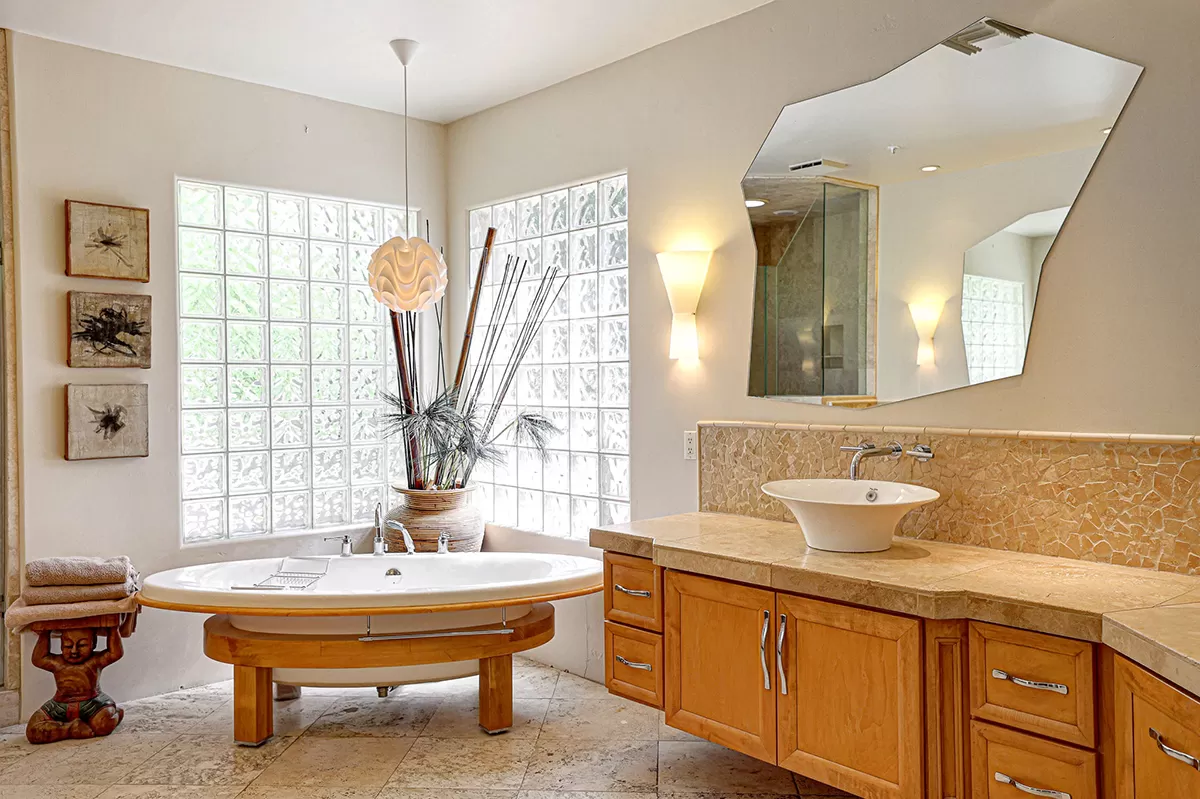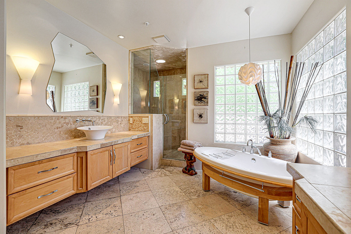 A breakfast nook and exterior patio access complete this space. The primary bedroom retreat boasts exterior access, dual floating vanities, a walk-in shower, and a freestanding tub, offering an escape. The library provides a perfect retreat with corner windows, built-in wrap-around bookshelves, and an attached powder bath. Additional highlights include a laundry room with ample cabinetry and a prep sink, a three-car garage with attached cabinets, and wood and tile floors throughout. Most furnishings are available by separate bill of sale.