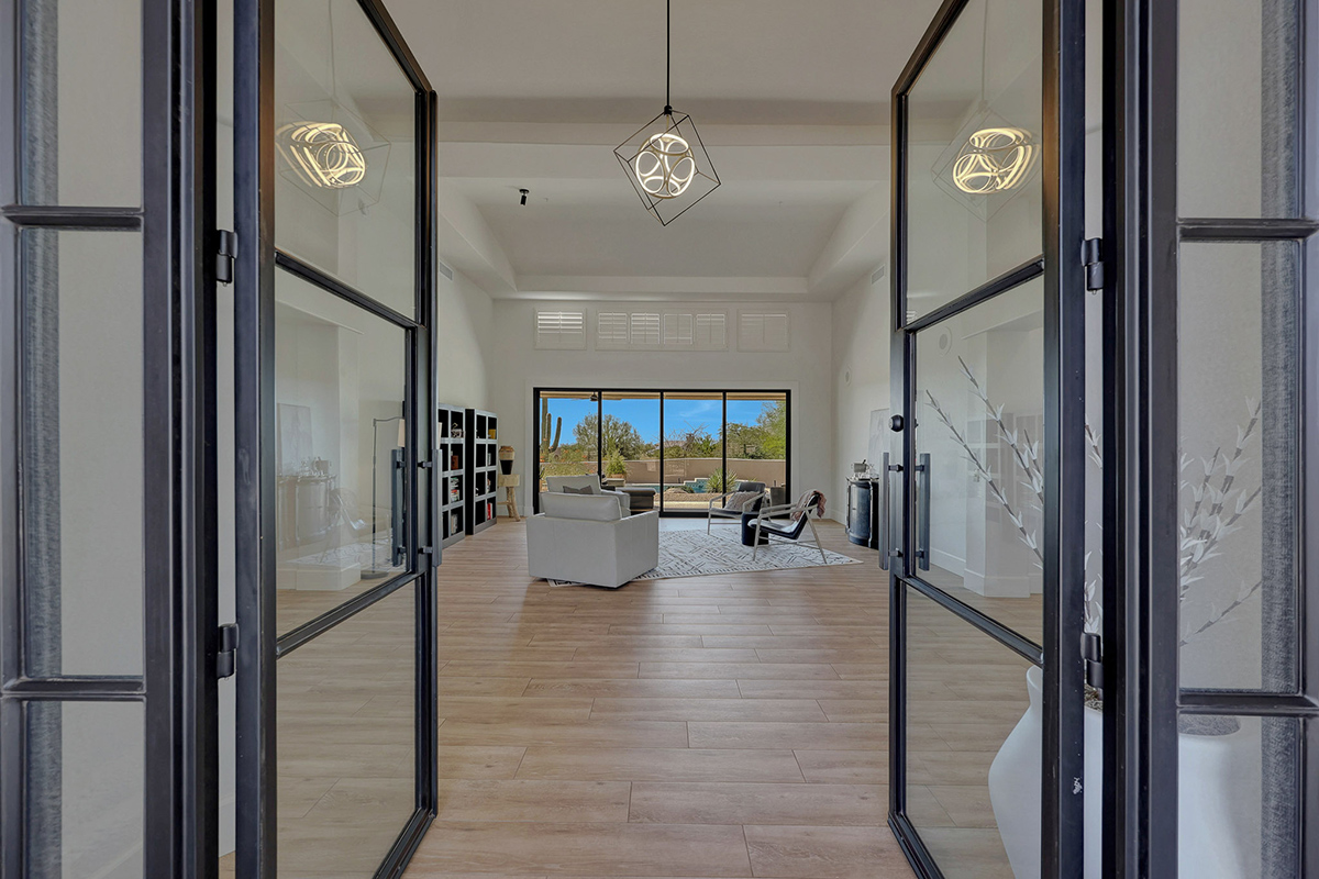 Enter through the newly installed high-end iron and glass front door to discover a seamlessly flowing interior adorned with new tile flooring and a large custom slider door creating a seamless indoor and outdoor living. The removal of columns in the expansive living room enhances the open ambiance, while new paint provides a fresh feel throughout.