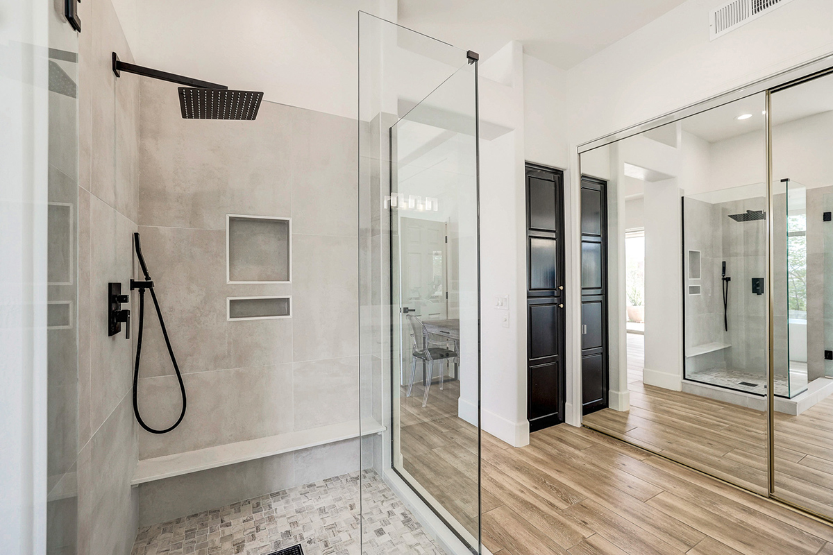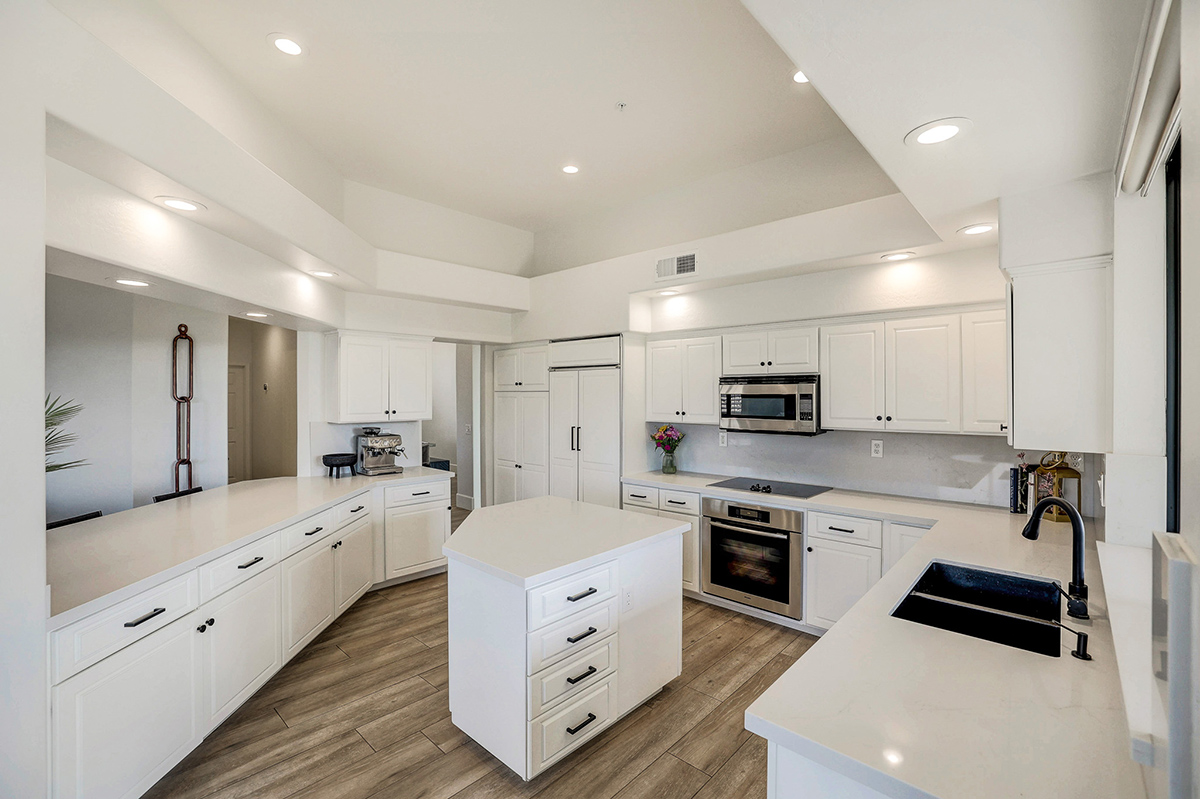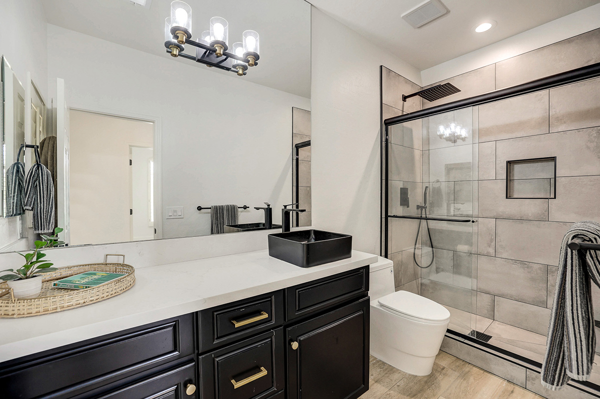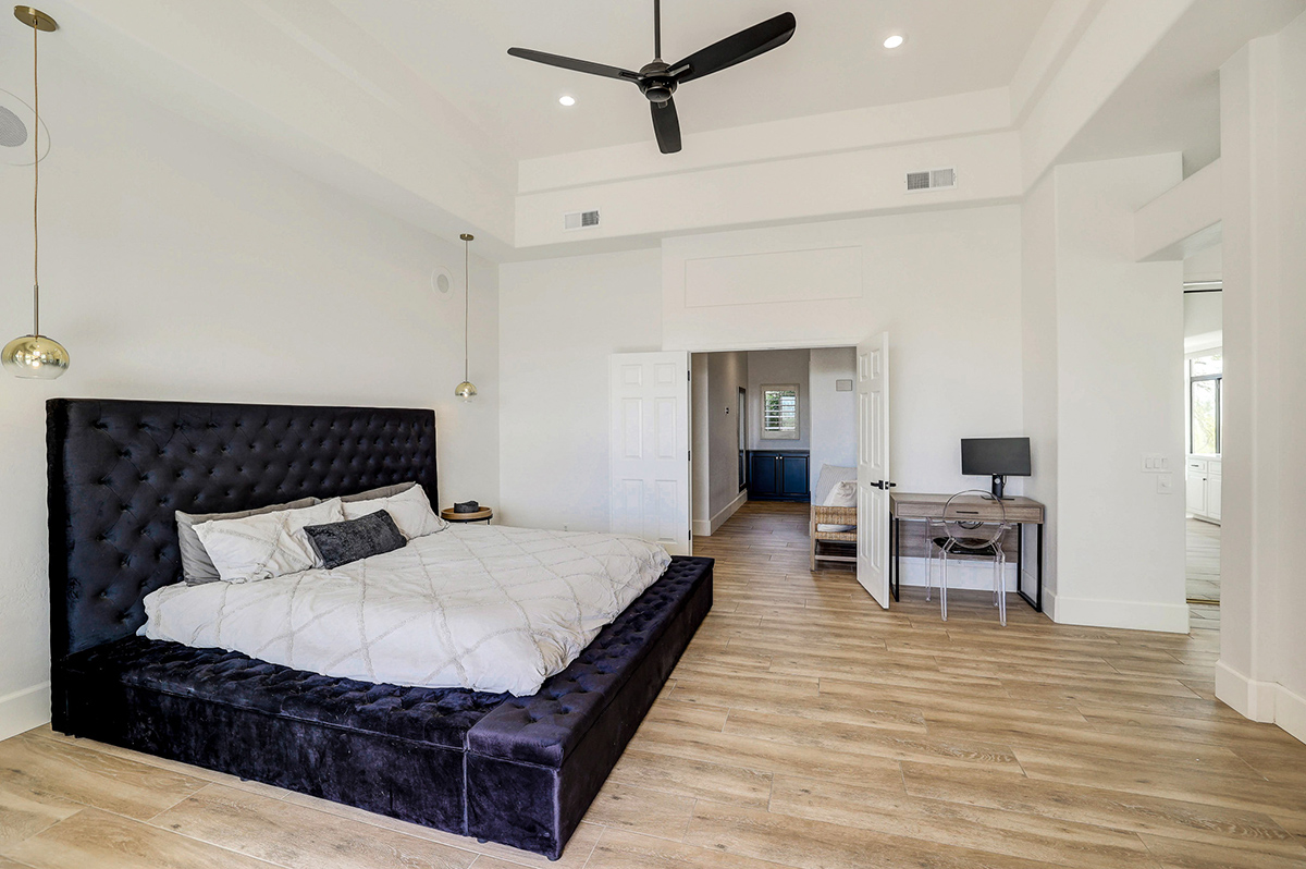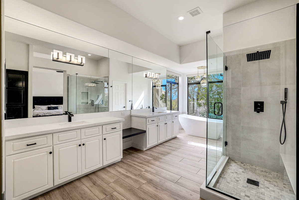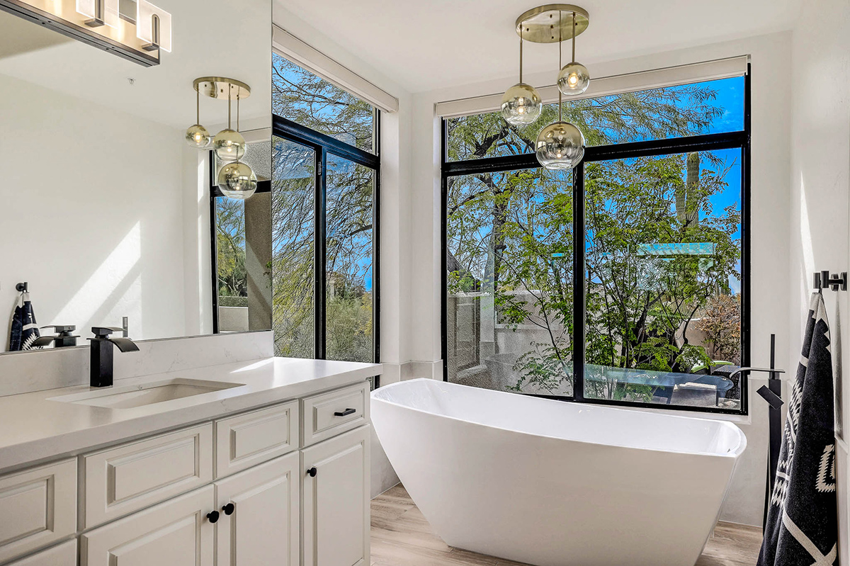 Retreat to the luxurious primary suite, where a complete remodel beckons with a freestanding bath with picture windows, a spacious shower with raised glass surround, and chic dual sinks. The guest bath mirrors this sophistication with its own stunning renovation.