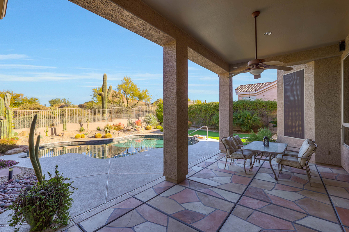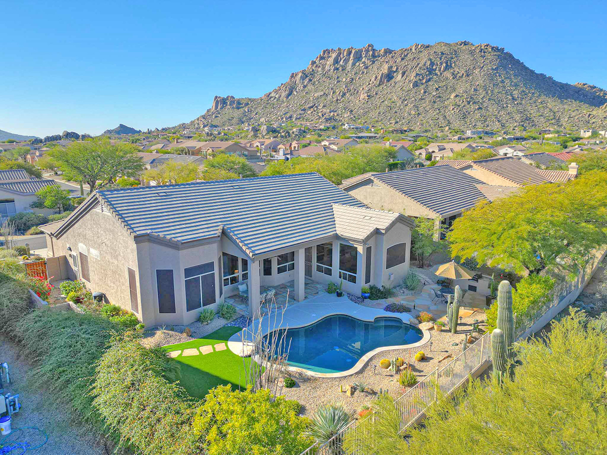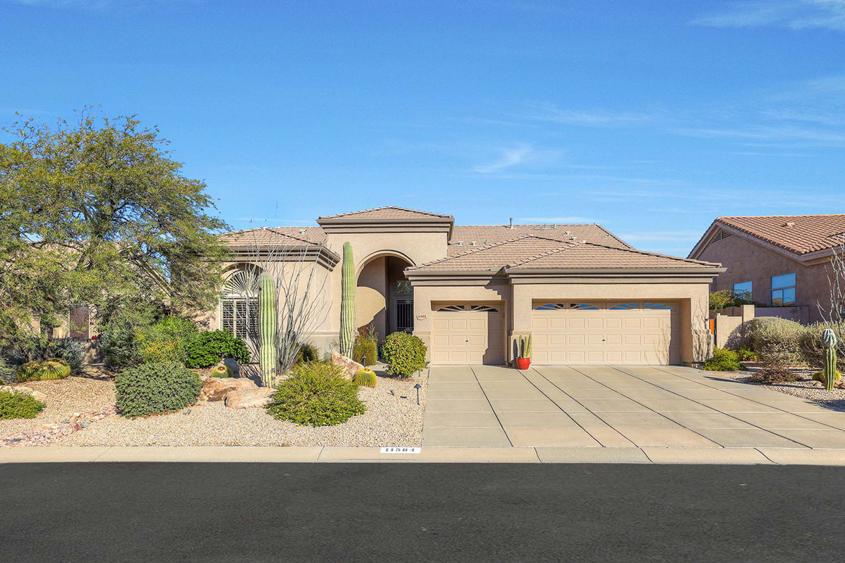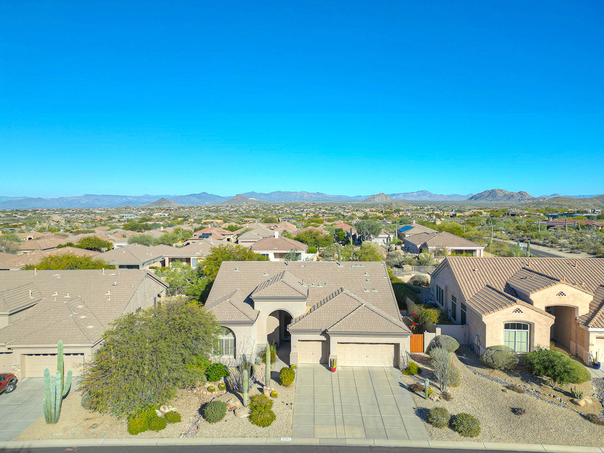 Beautifully updated home in Four Peaks at Troon Village boasts an elevated position on a tranquil cul-de-sac, offering views of Troon Mountain and sweeping panoramas of Four Peaks and McDowell Mountains. The home is within walking distance to miles of hiking and biking trails in the McDowell Preserve. Constructed by Shea Homes, the thoughtfully designed 2,248 square foot residence features a well-appointed split floor plan with four bedrooms and two bathrooms and features 12’ ceilings throughout the house.