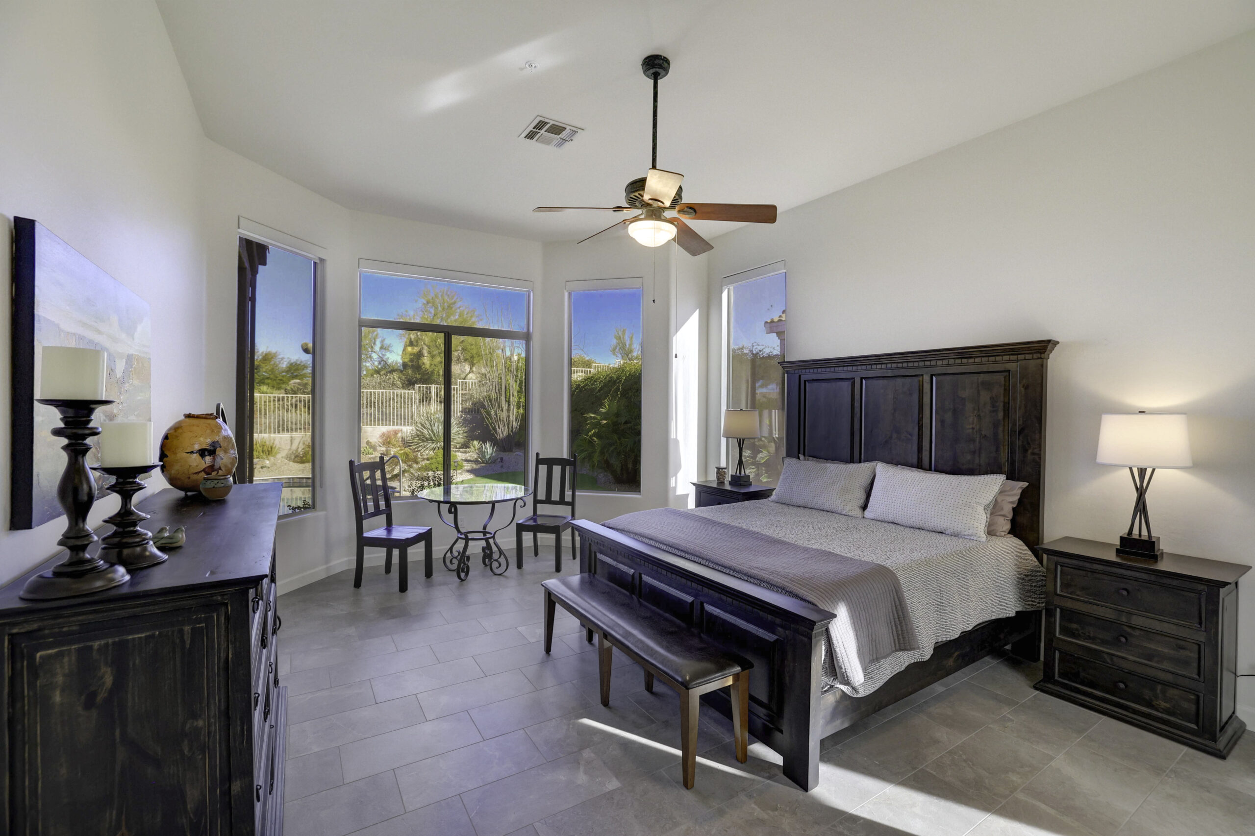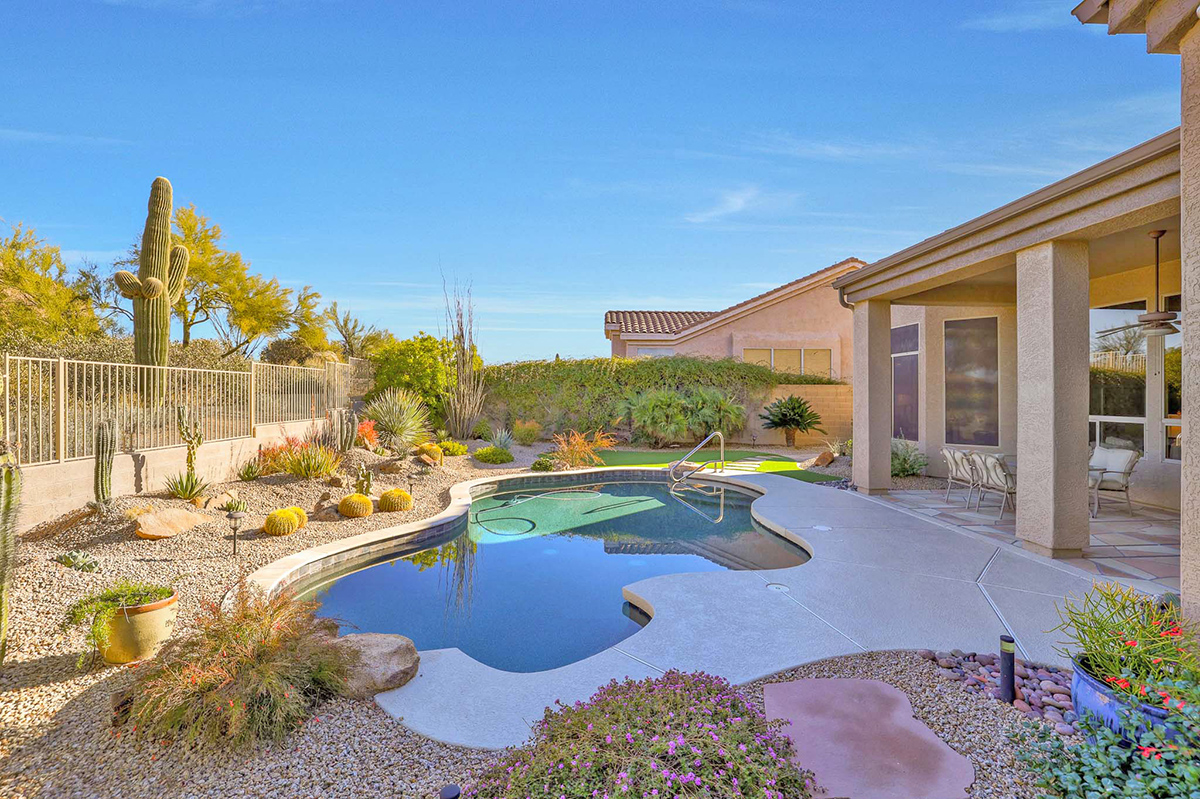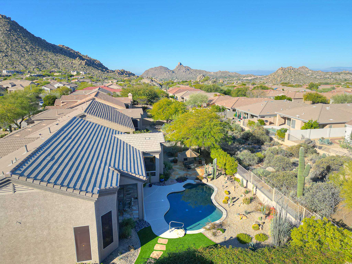 Beautifully updated home in Four Peaks at Troon Village boasts an elevated position on a tranquil cul-de-sac, offering views of Troon Mountain and sweeping panoramas of Four Peaks and McDowell Mountains. The home is within walking distance to miles of hiking and biking trails in the McDowell Preserve. Constructed by Shea Homes, the thoughtfully designed 2,248 square foot residence features a well-appointed split floor plan with four bedrooms and two bathrooms and features 12’ ceilings throughout the house.