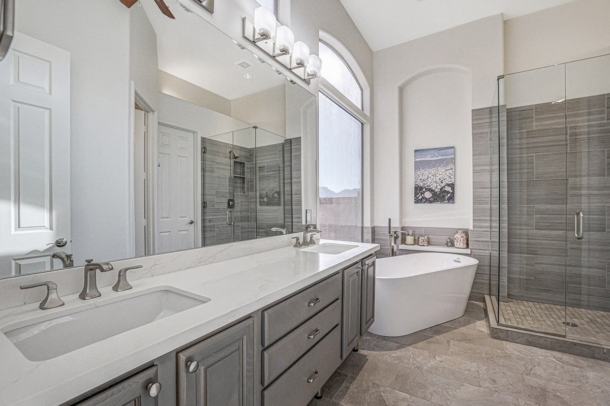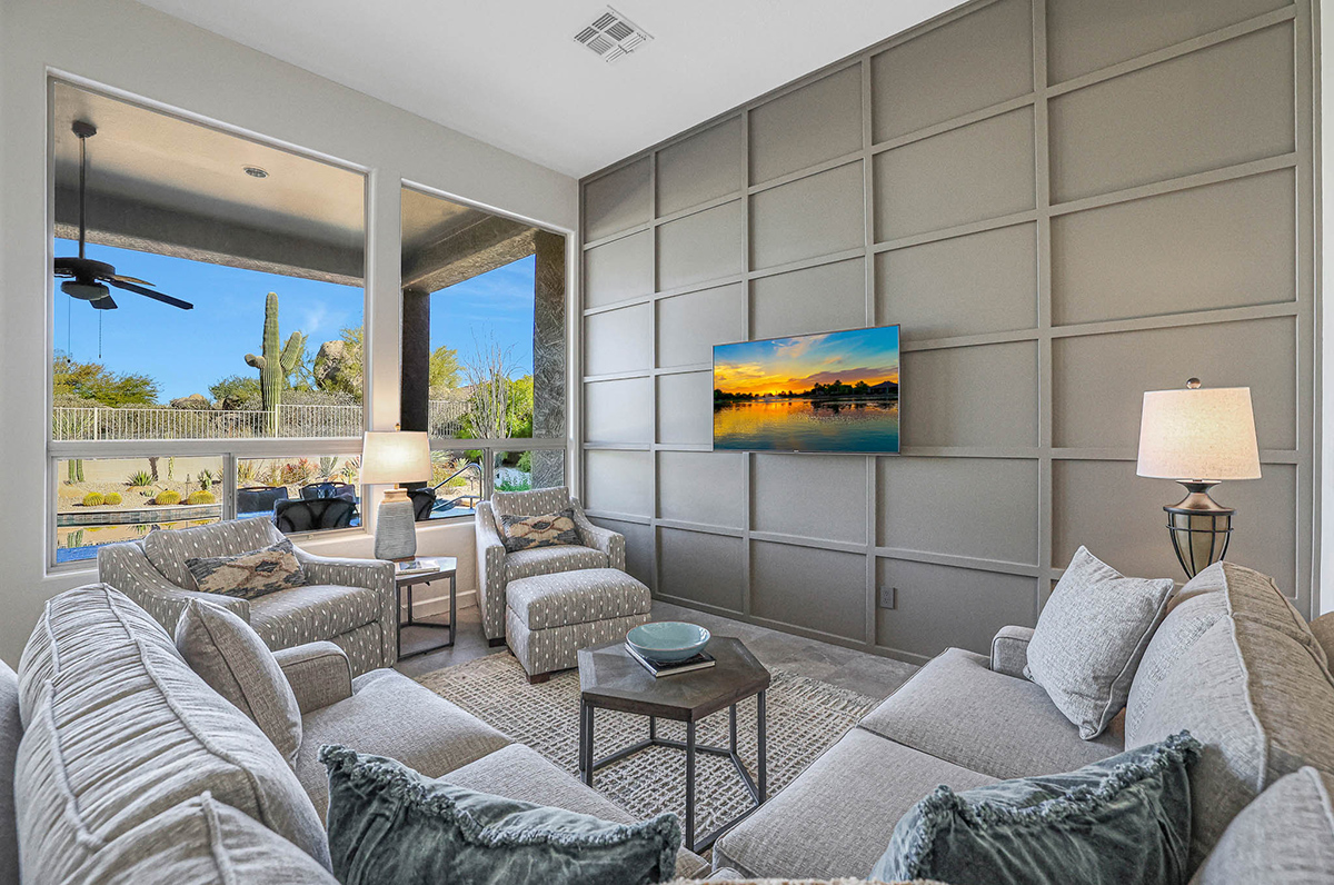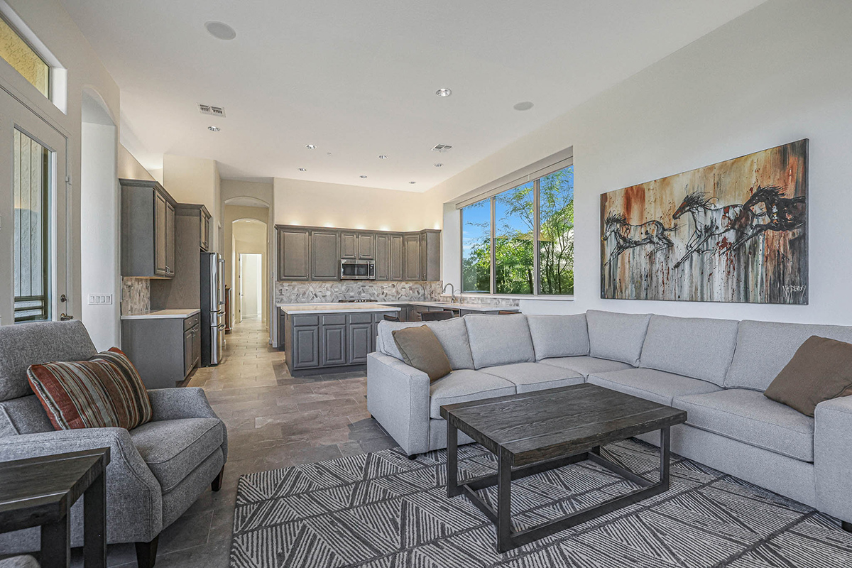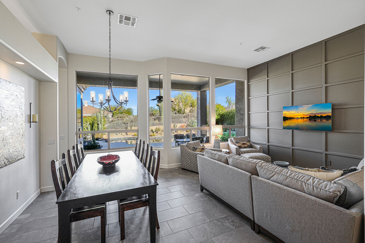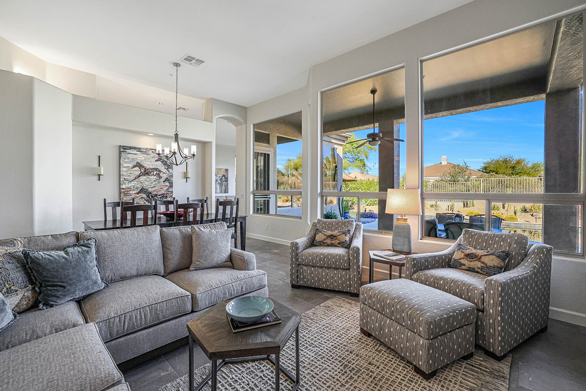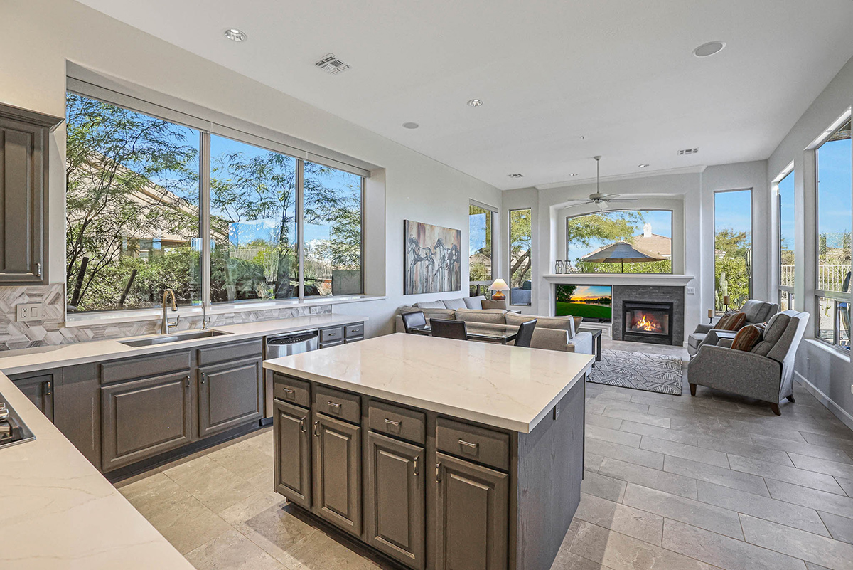 The family room features large picture windows for viewing the resort-like back yard and has exterior access to the patio. The gas fireplace was remodeled with a stacked stone surround. The formal living and dining area is also graced by large picture windows which frame the boulder outcroppings in the nature area behind the house.