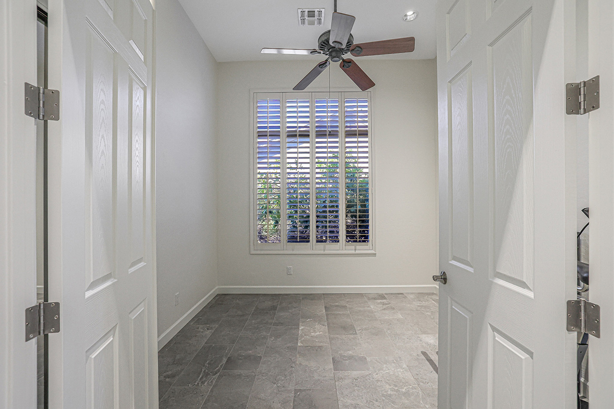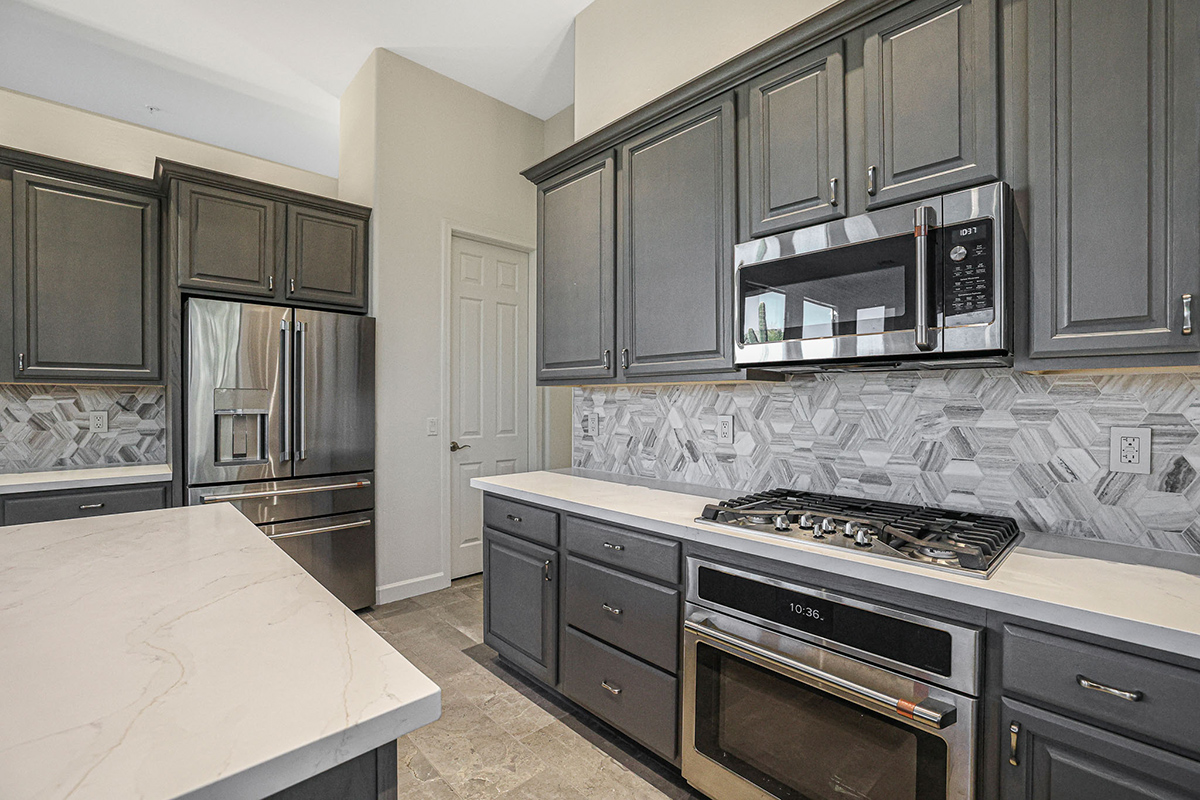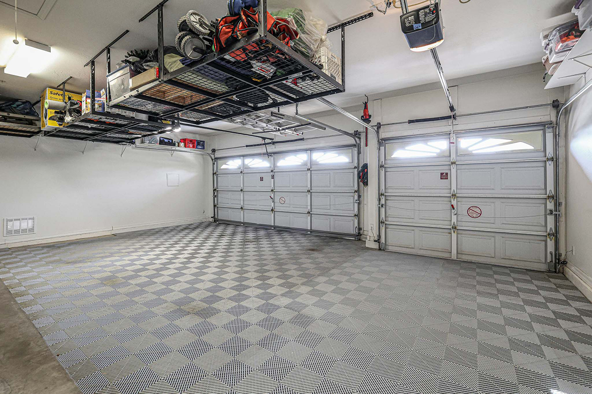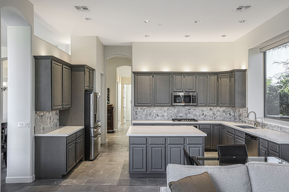 The meticulously landscaped backyard includes mature vegetation including flowering plants, citrus, a new watering system, low-maintenance artificial turf, and a rejuvenated pool featuring new PebbleTec, tile, and cleaning/filtration system. The three-car garage is equipped with built-in cabinets, a sink, an overhead storage system and modular garage flooring.