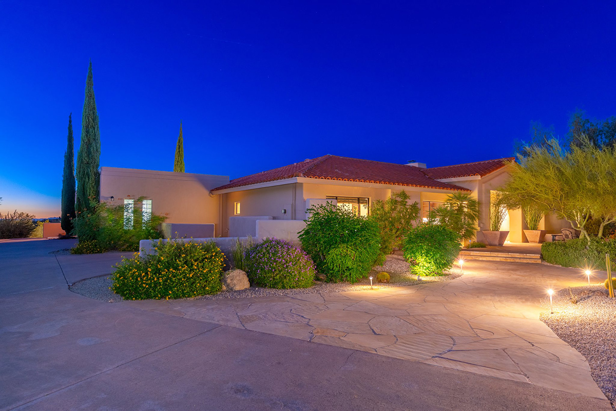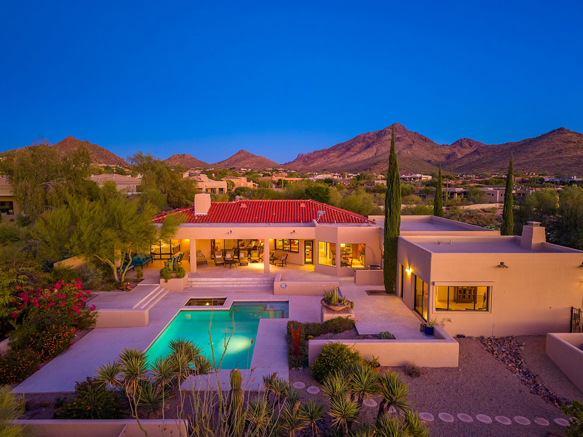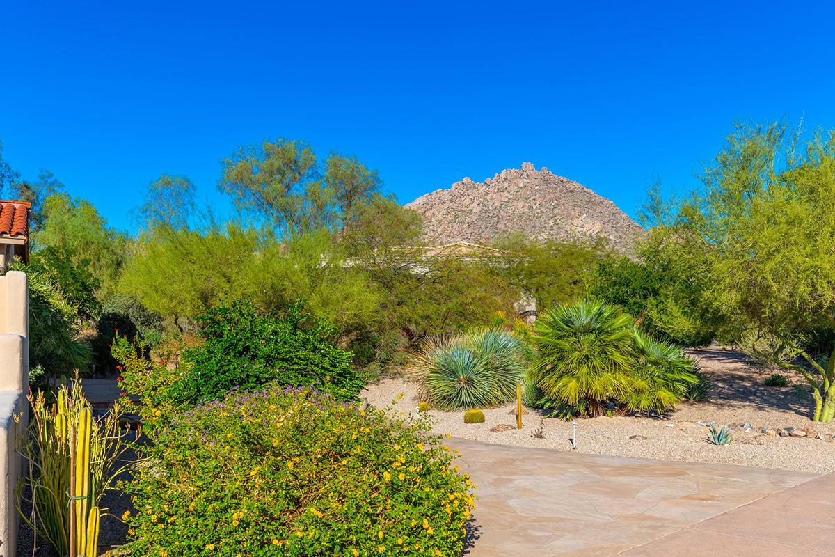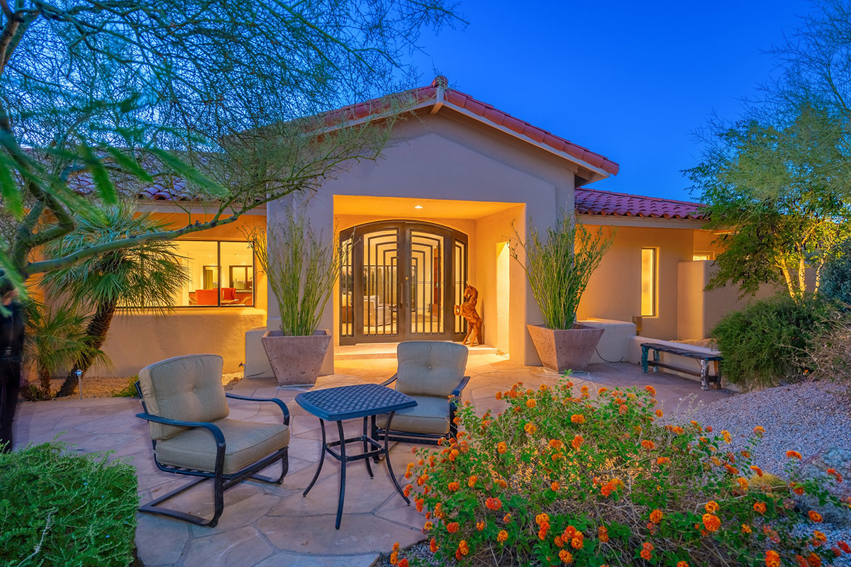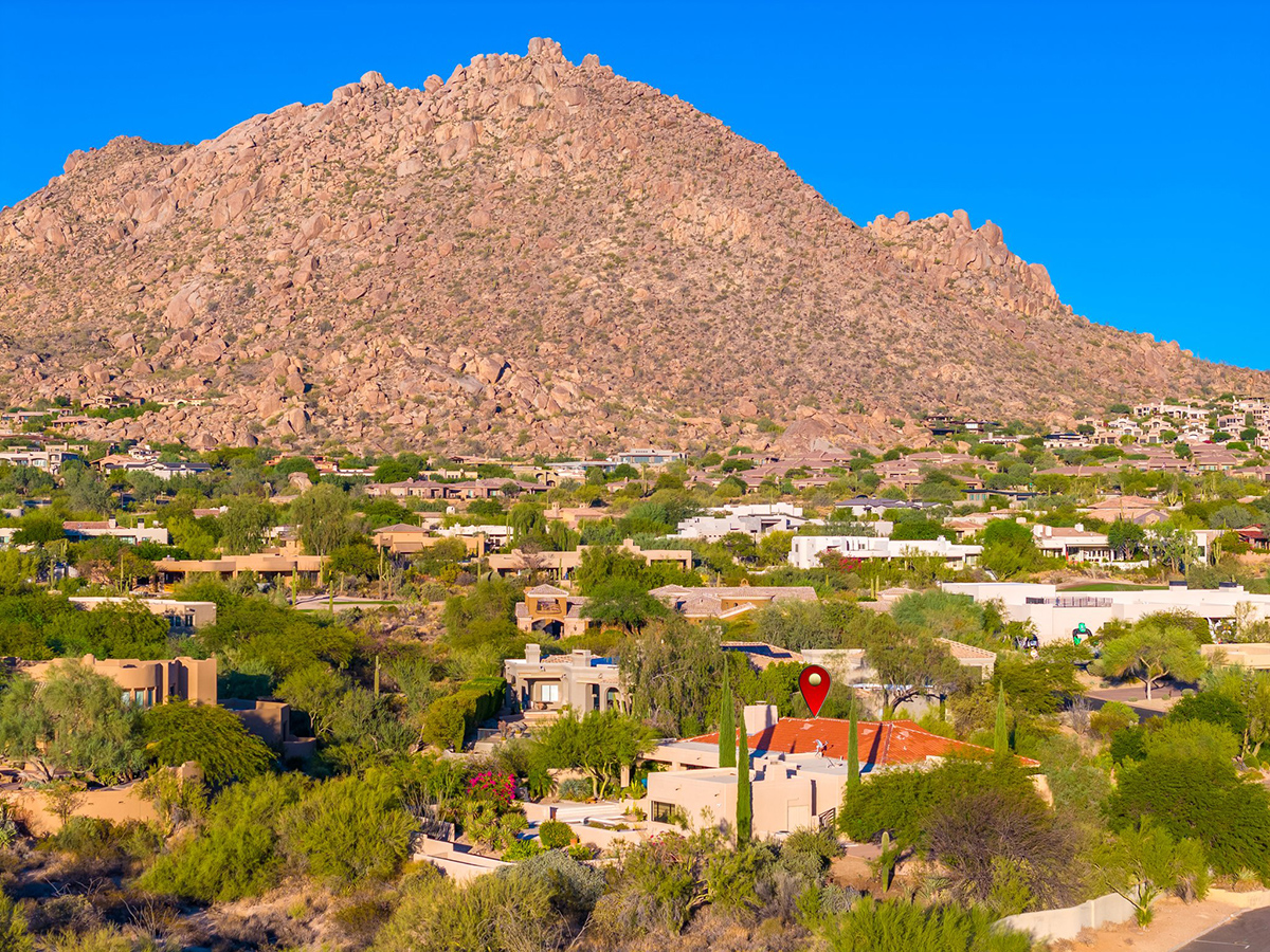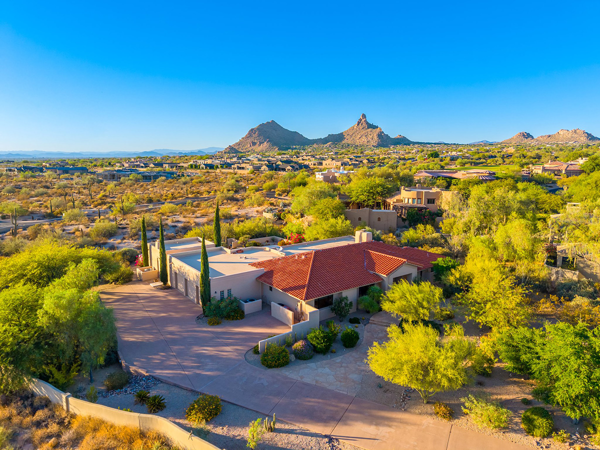 Breathtaking views of Pinnacle Peak, the valley, and city lights set the stage for this stunning home, nestled on just over an acre of mature desert landscape. Freshly painted throughout with all new switches and cover plates, this three bedroom plus office and three and a half bathroom home is a blank canvas ready for its new owner. The main house spans 2,791 square feet of single-level living, featuring two bedrooms, plus an office that could serve as a fourth bedroom, and two-and-a-half bathrooms. The thoughtful split floor plan provides privacy, while the detached 460 square foot guest house, with its own private entry, offers a bedroom, full bath, classic kiva fireplace, sitting area, and kitchenette.