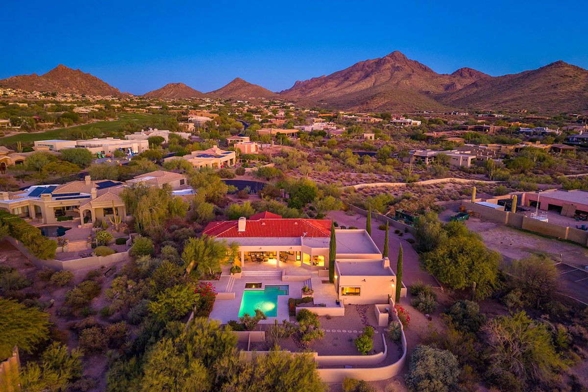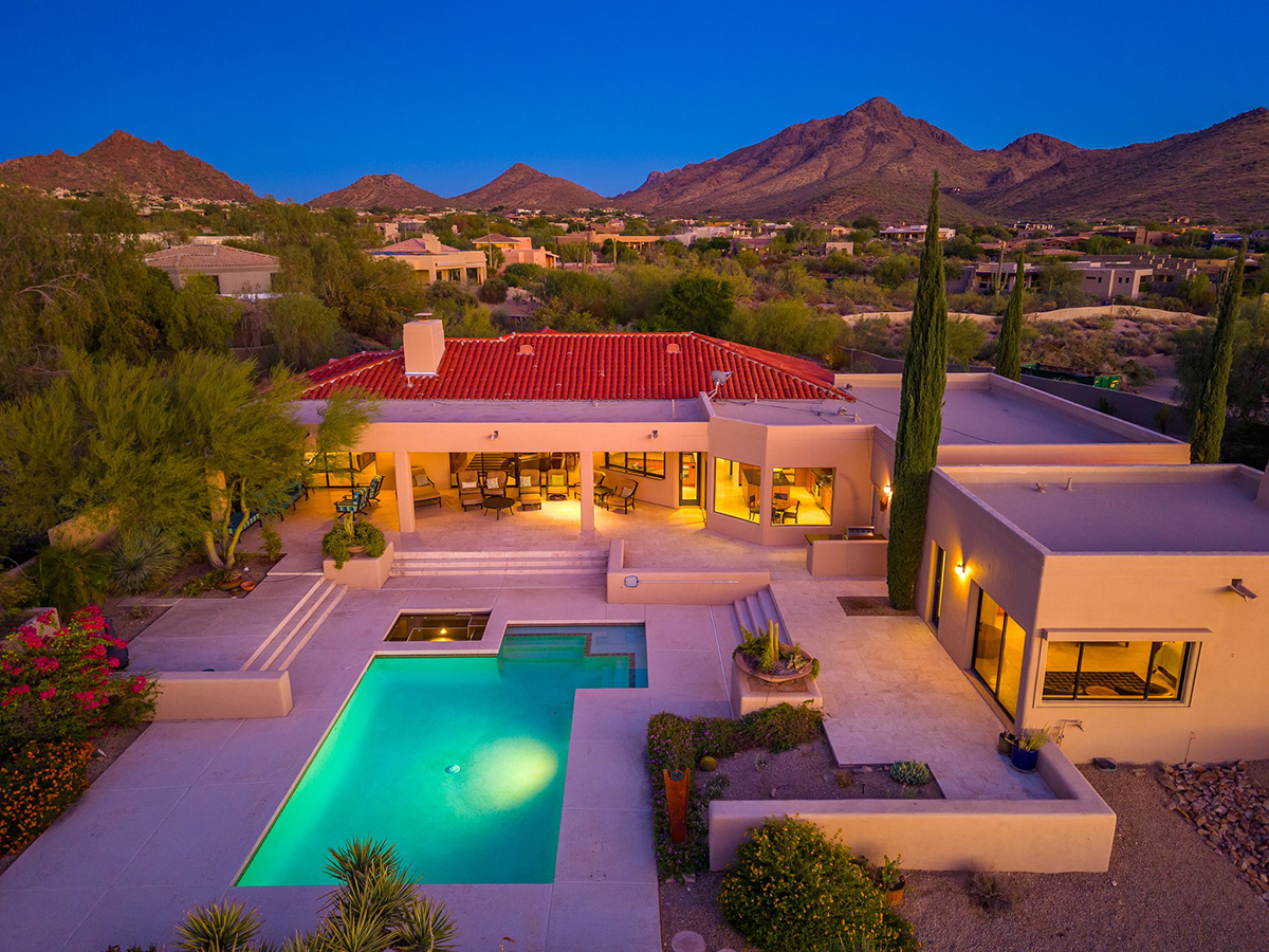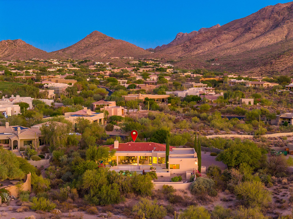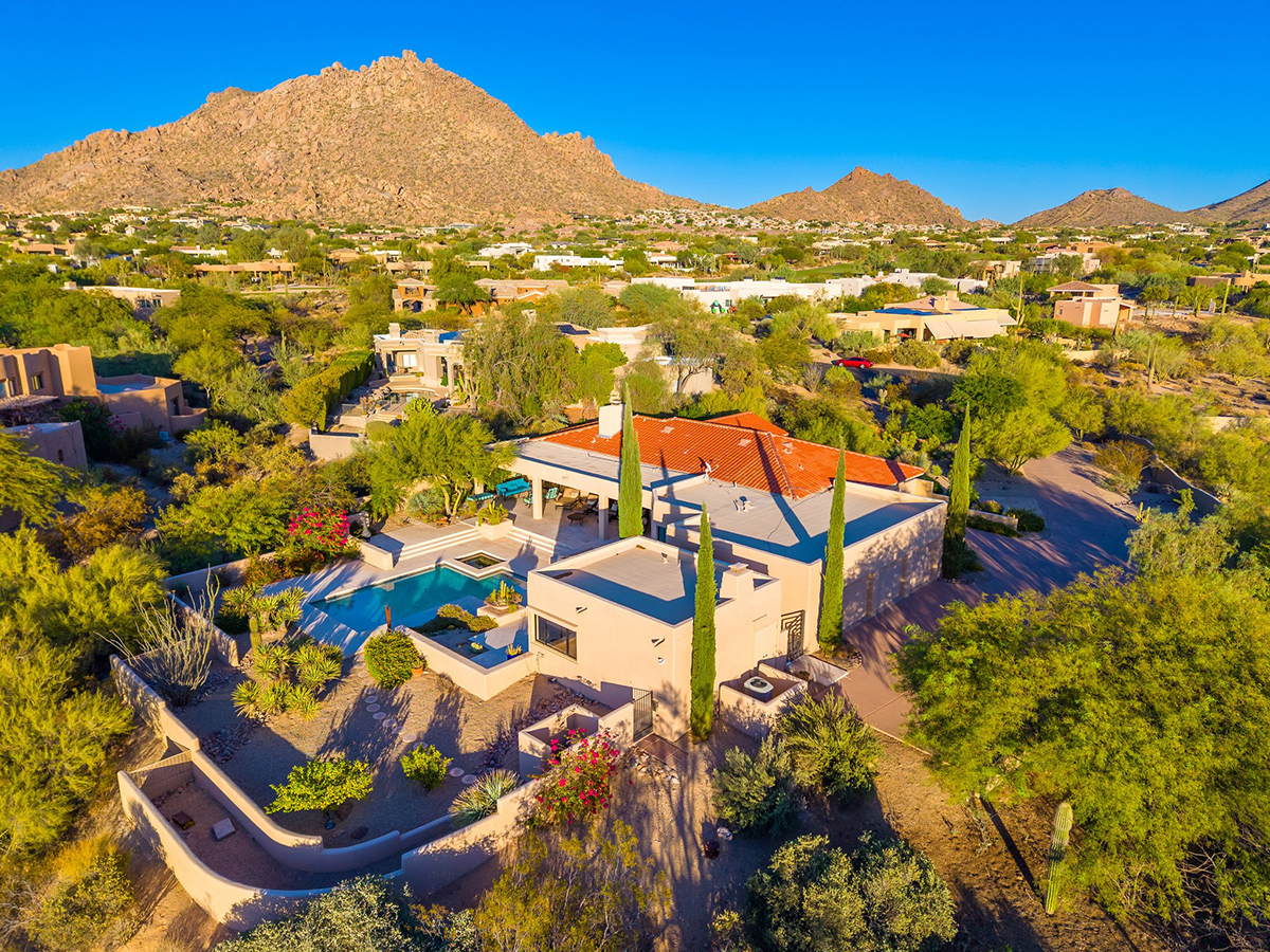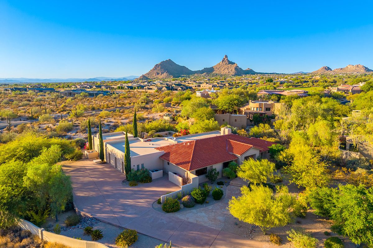 Breathtaking views of Pinnacle Peak, the valley, and city lights set the stage for this stunning home, nestled on just over an acre of mature desert landscape. Freshly painted throughout with all new switches and cover plates, this three bedroom plus office and three and a half bathroom home is a blank canvas ready for its new owner. The main house spans 2,791 square feet of single-level living, featuring two bedrooms, plus an office that could serve as a fourth bedroom, and two-and-a-half bathrooms. The thoughtful split floor plan provides privacy, while the detached 460 square foot guest house, with its own private entry, offers a bedroom, full bath, classic kiva fireplace, sitting area, and kitchenette.