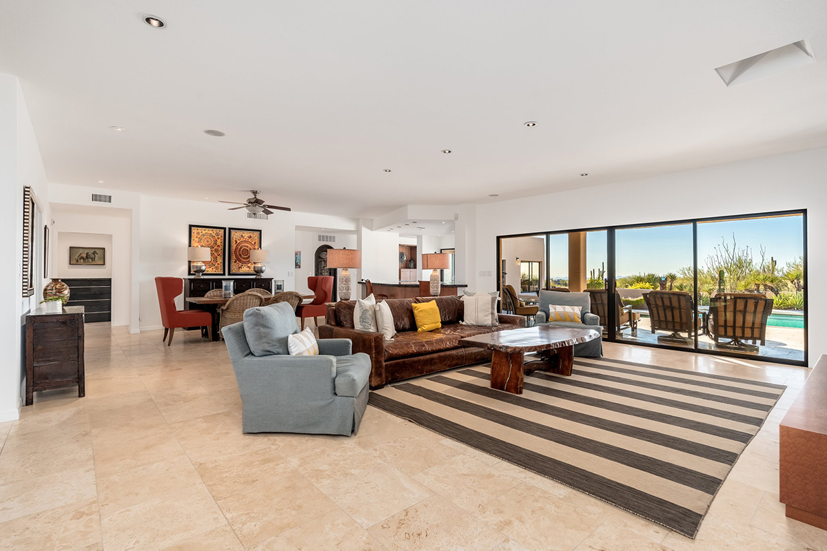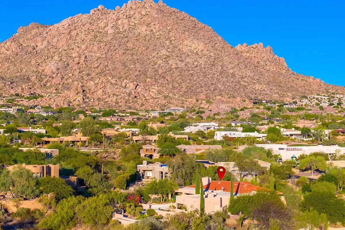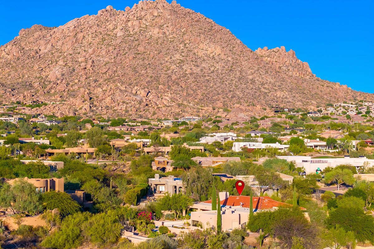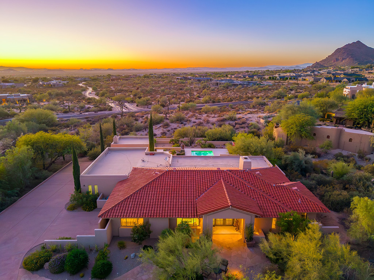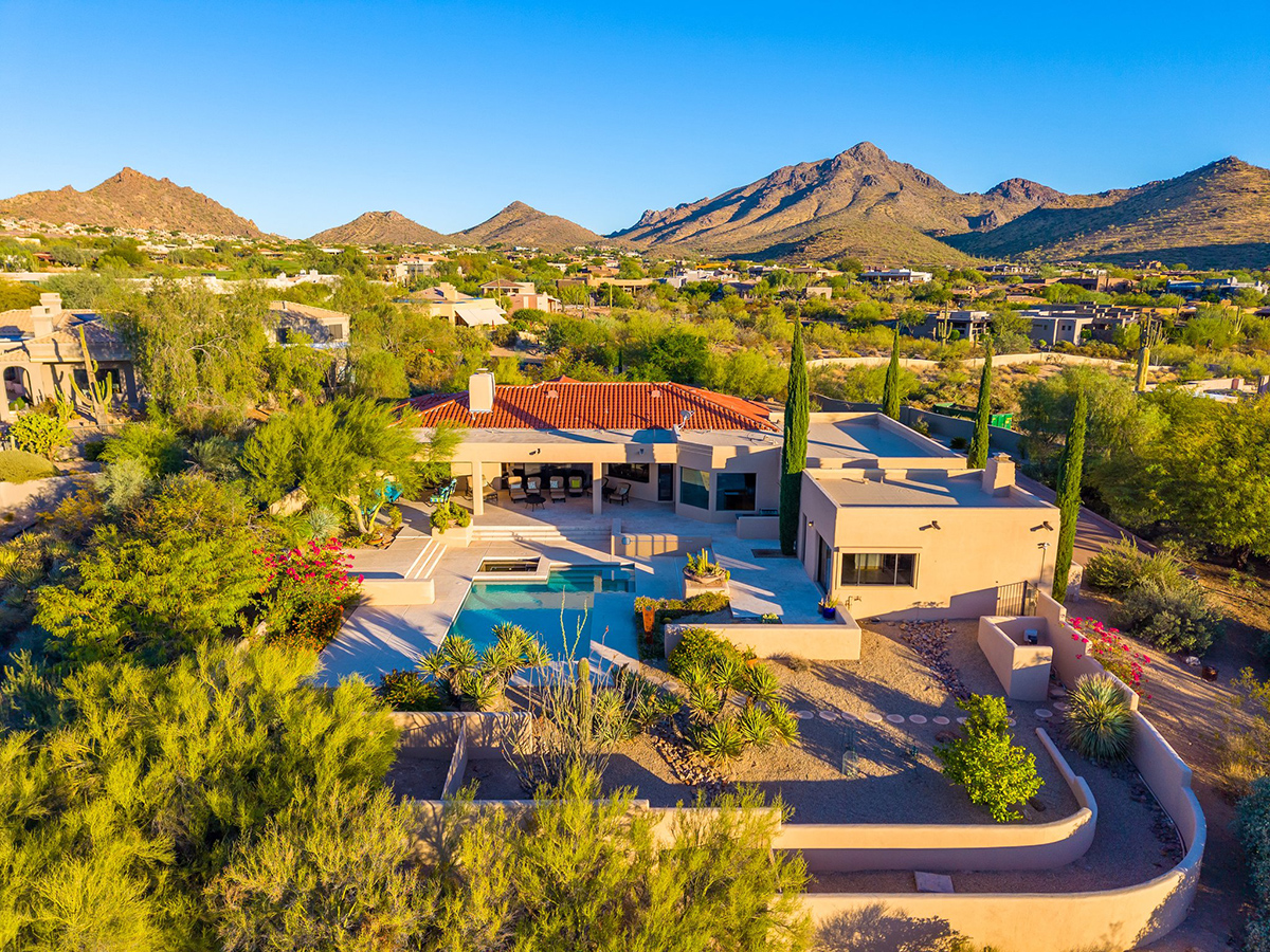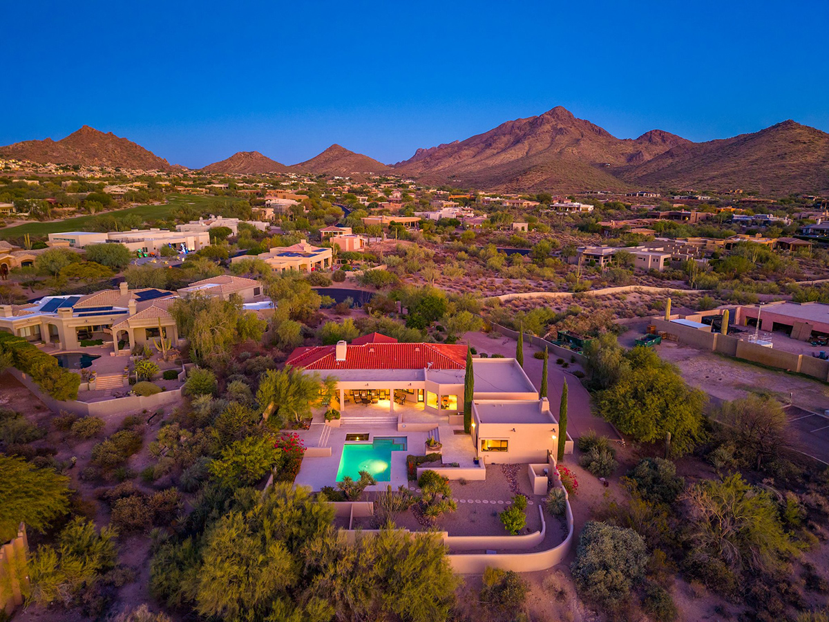 Breathtaking views of Pinnacle Peak, the valley, and city lights set the stage for this stunning home, nestled on just over an acre of mature desert landscape. Freshly painted throughout with all new switches and cover plates, this three bedroom plus office and three and a half bathroom home is a blank canvas ready for its new owner. The main house spans 2,791 square feet of single-level living, featuring two bedrooms, plus an office that could serve as a fourth bedroom, and two-and-a-half bathrooms. The thoughtful split floor plan provides privacy, while the detached 460 square foot guest house, with its own private entry, offers a bedroom, full bath, classic kiva fireplace, sitting area, and kitchenette.