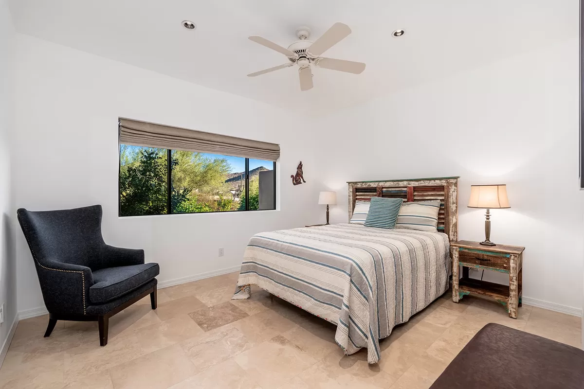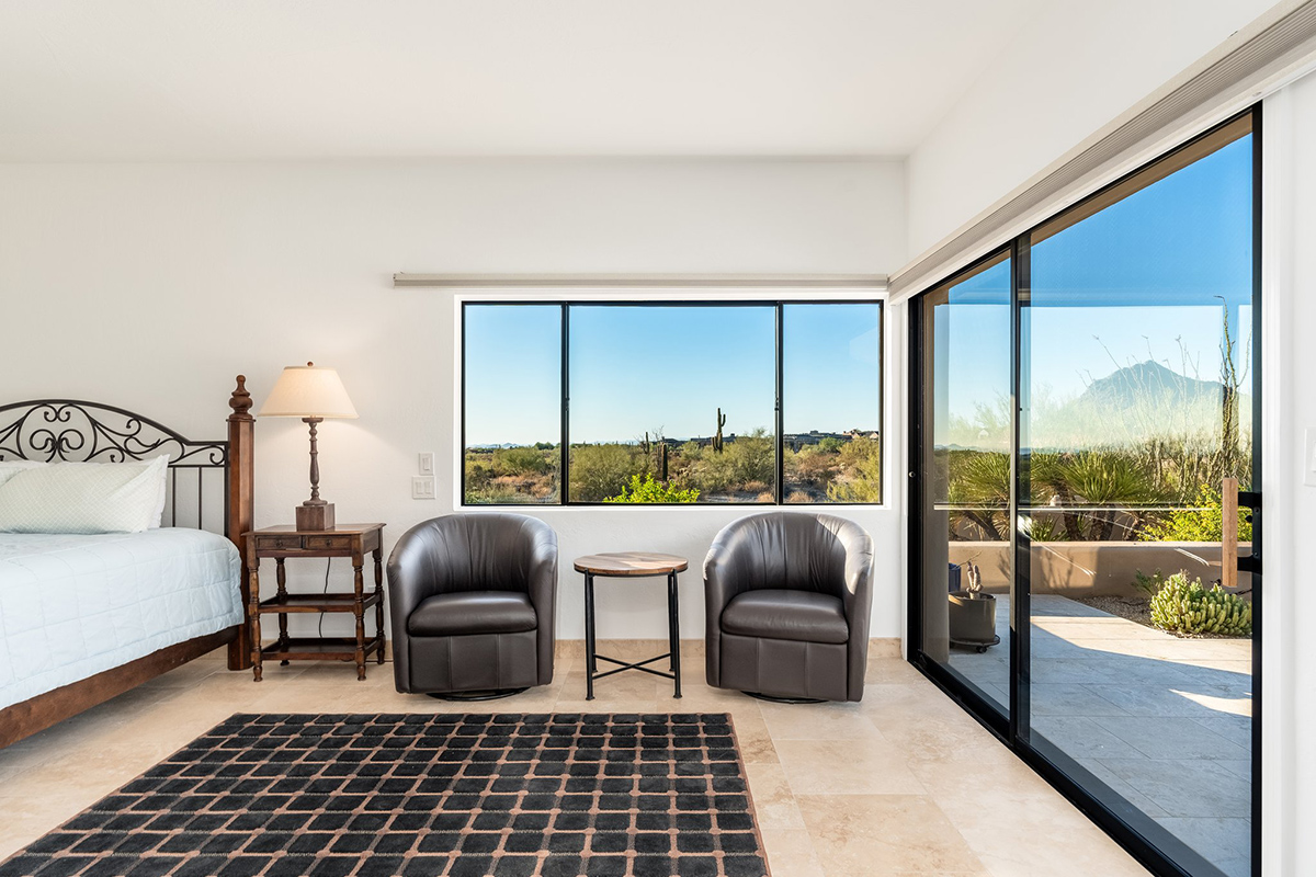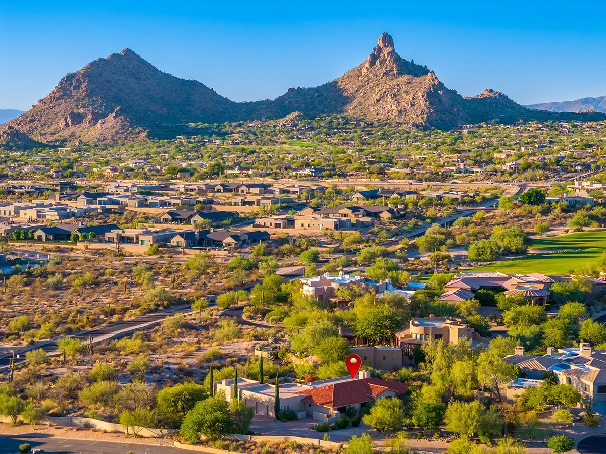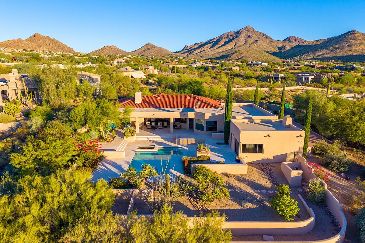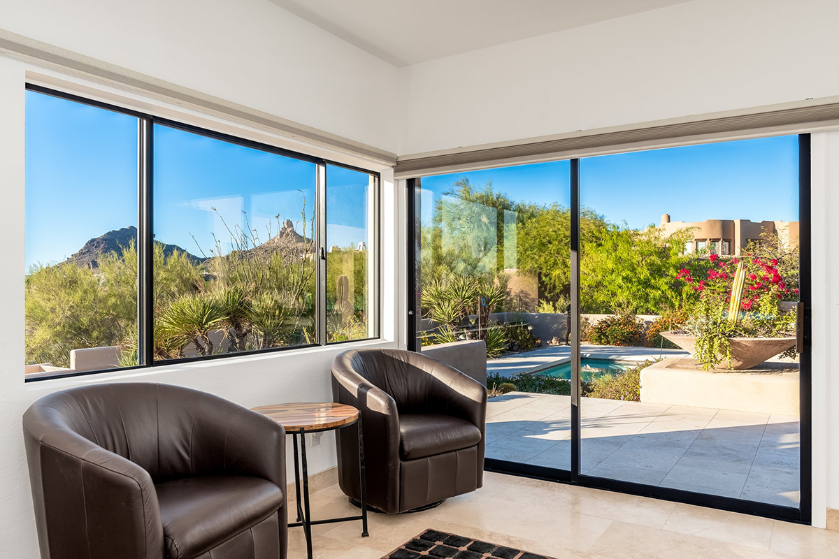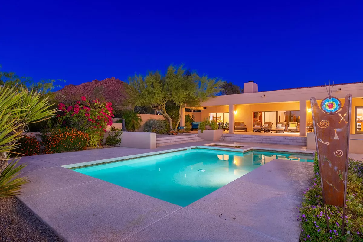 Breathtaking views of Pinnacle Peak, the valley, and city lights set the stage for this stunning home, nestled on just over an acre of mature desert landscape. Freshly painted throughout with all new switches and cover plates, this three bedroom plus office and three and a half bathroom home is a blank canvas ready for its new owner. The main house spans 2,791 square feet of single-level living, featuring two bedrooms, plus an office that could serve as a fourth bedroom, and two-and-a-half bathrooms. The thoughtful split floor plan provides privacy, while the detached 460 square foot guest house, with its own private entry, offers a bedroom, full bath, classic kiva fireplace, sitting area, and kitchenette.