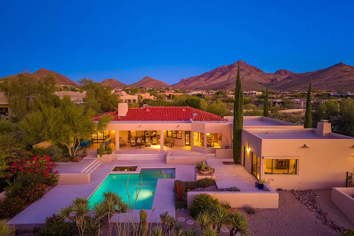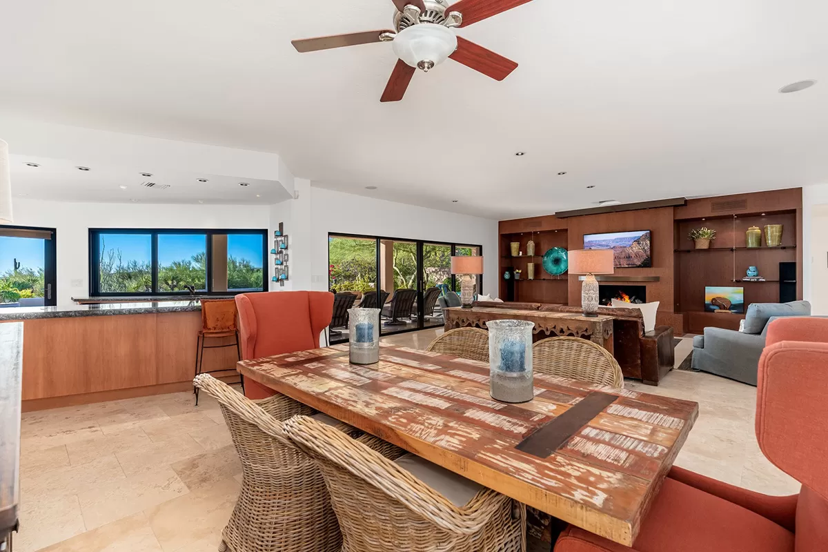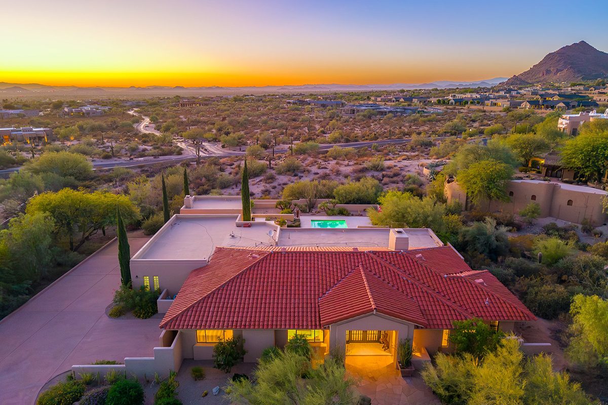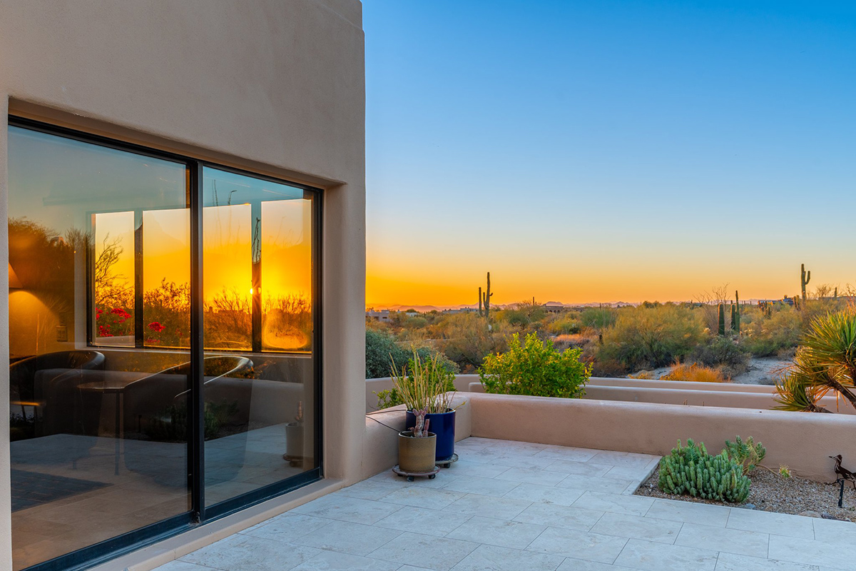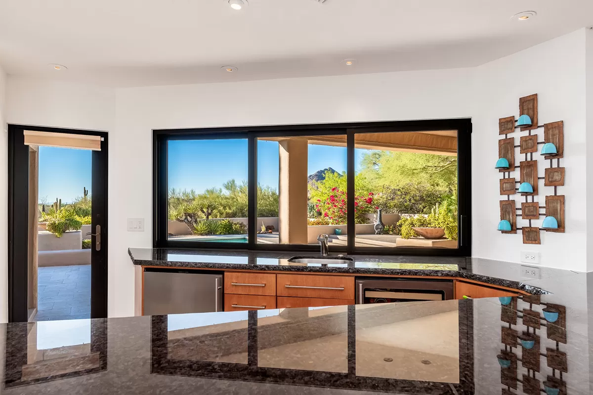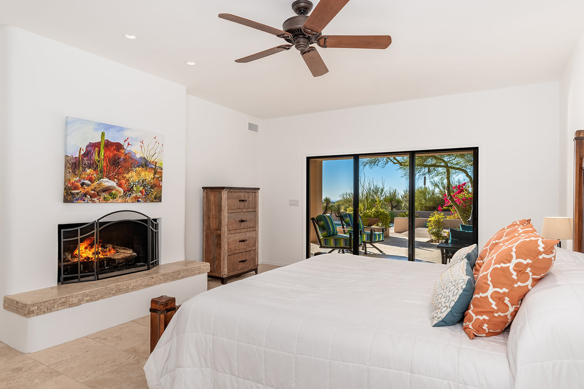 Breathtaking views of Pinnacle Peak, the valley, and city lights set the stage for this stunning home, nestled on just over an acre of mature desert landscape. Freshly painted throughout with all new switches and cover plates, this three bedroom plus office and three and a half bathroom home is a blank canvas ready for its new owner. The main house spans 2,791 square feet of single-level living, featuring two bedrooms, plus an office that could serve as a fourth bedroom, and two-and-a-half bathrooms. The thoughtful split floor plan provides privacy, while the detached 460 square foot guest house, with its own private entry, offers a bedroom, full bath, classic kiva fireplace, sitting area, and kitchenette.