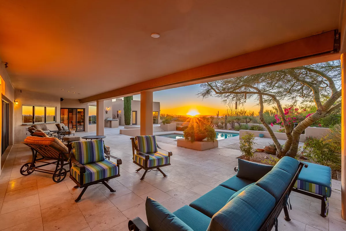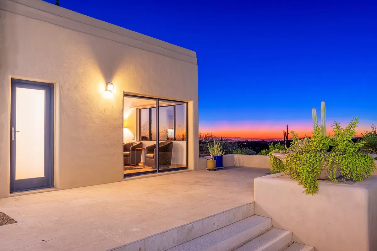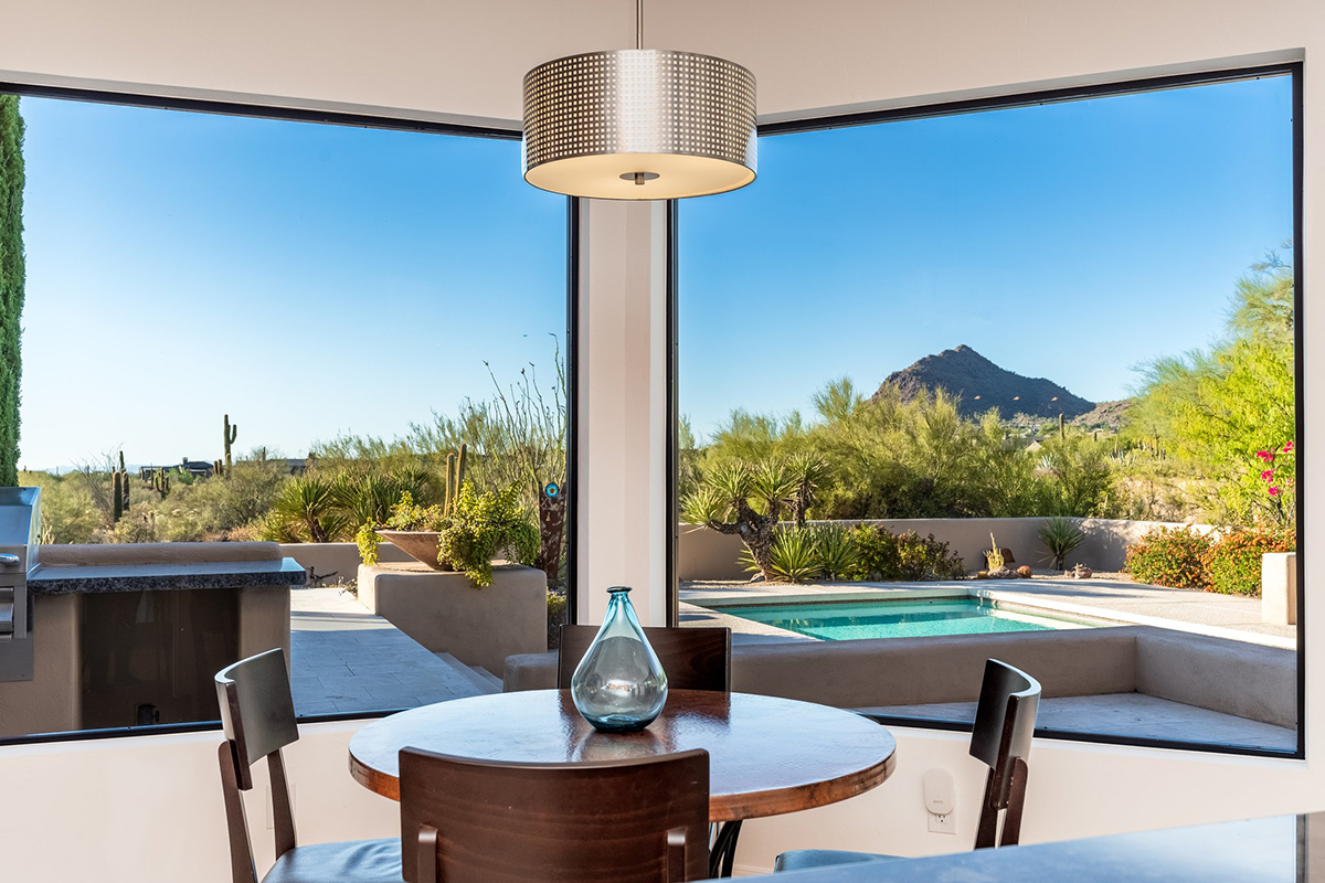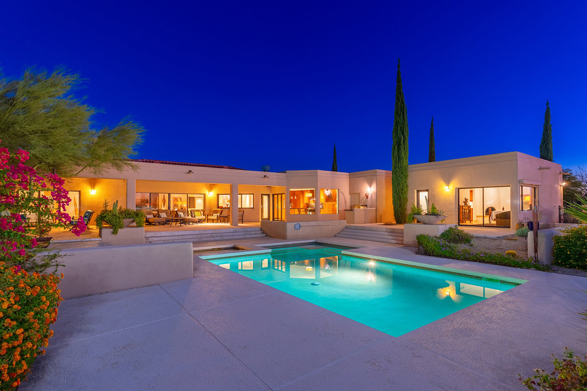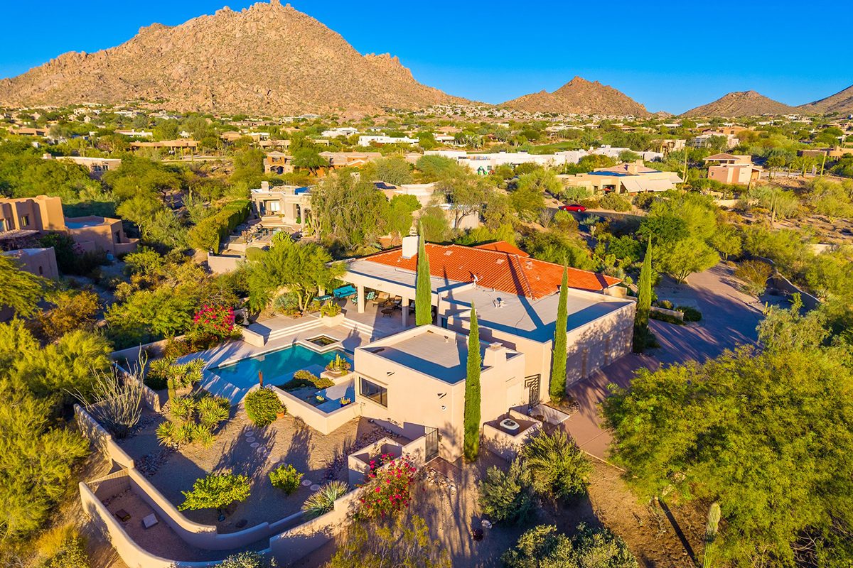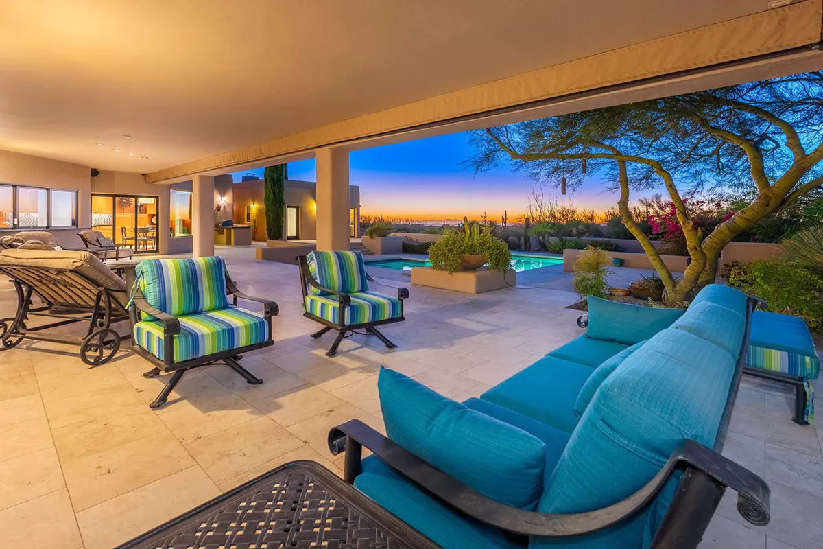 Breathtaking views of Pinnacle Peak, the valley, and city lights set the stage for this stunning home, nestled on just over an acre of mature desert landscape. Freshly painted throughout with all new switches and cover plates, this three bedroom plus office and three and a half bathroom home is a blank canvas ready for its new owner. The main house spans 2,791 square feet of single-level living, featuring two bedrooms, plus an office that could serve as a fourth bedroom, and two-and-a-half bathrooms. The thoughtful split floor plan provides privacy, while the detached 460 square foot guest house, with its own private entry, offers a bedroom, full bath, classic kiva fireplace, sitting area, and kitchenette.