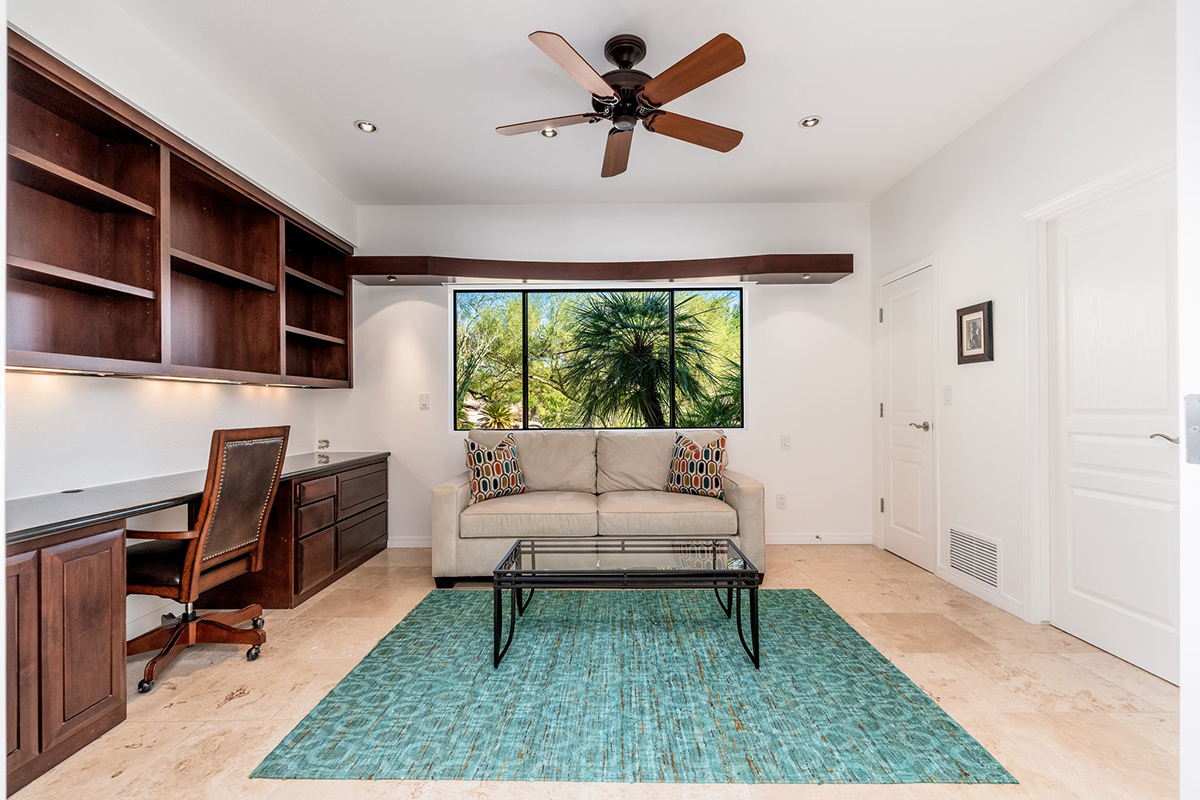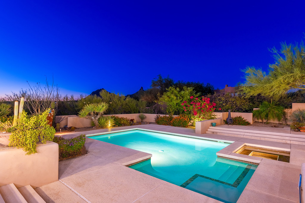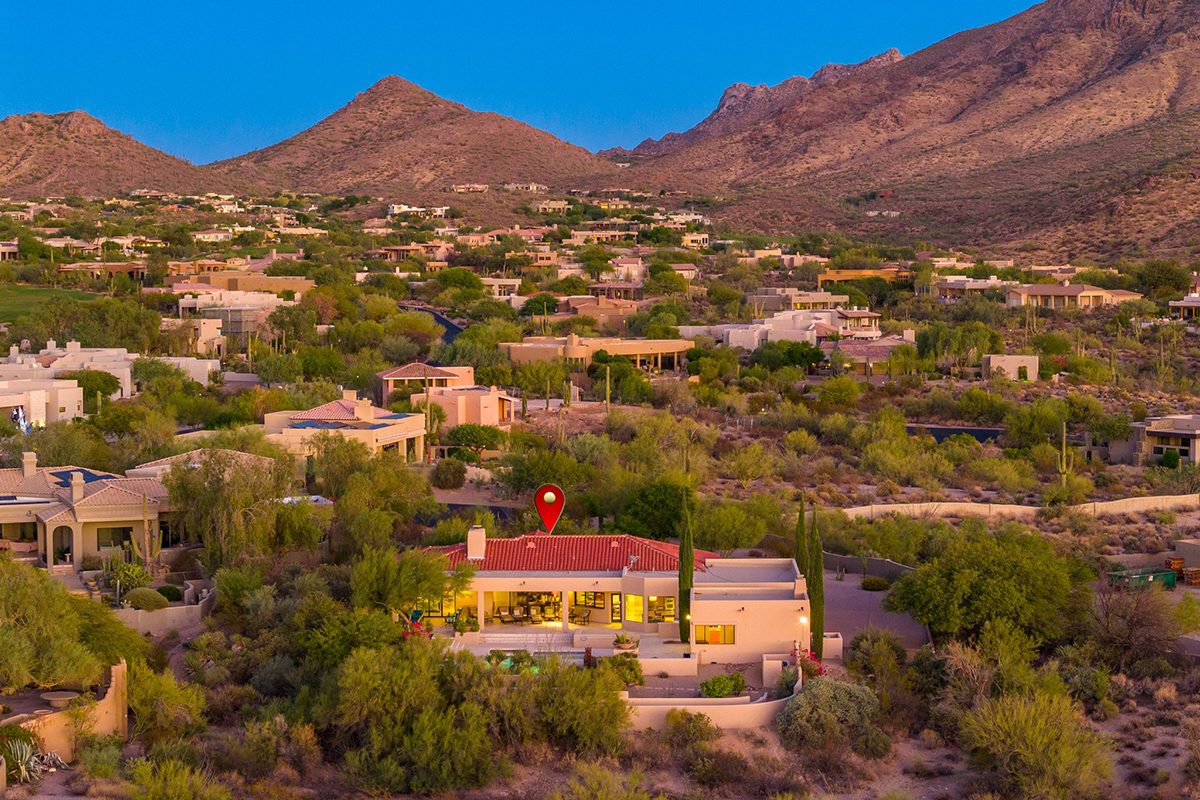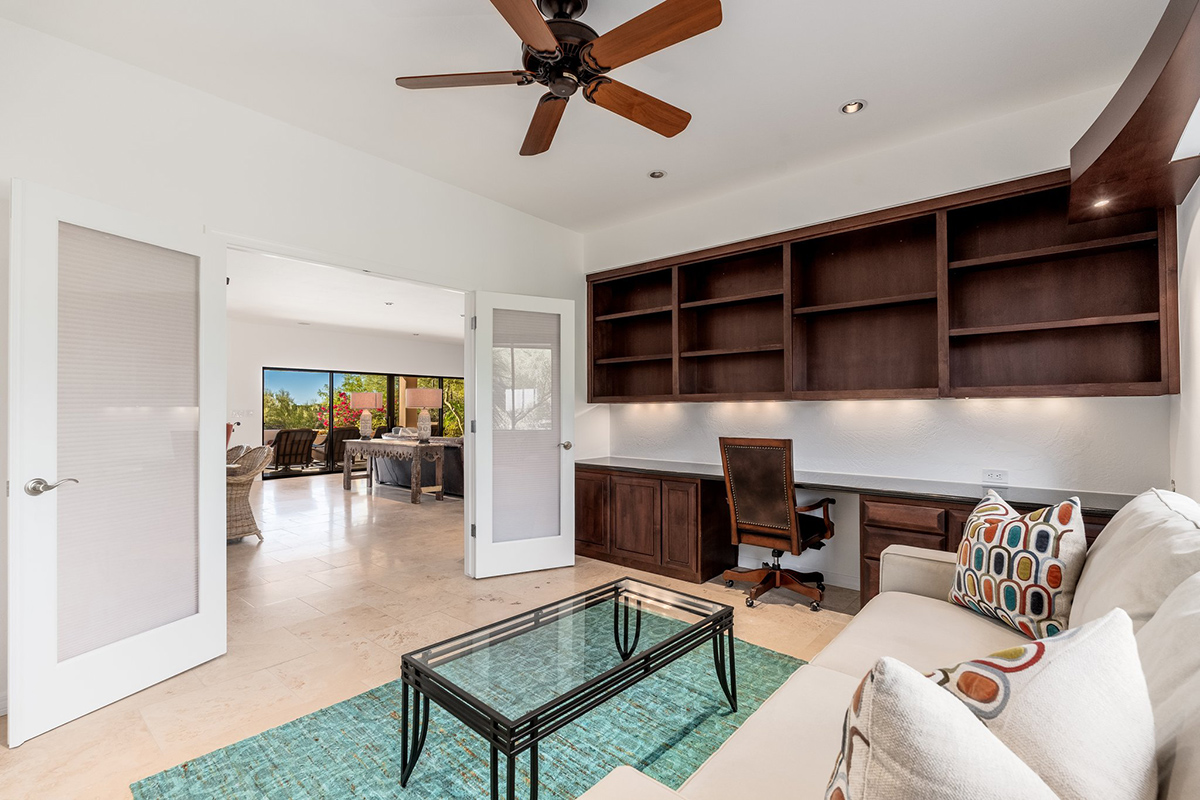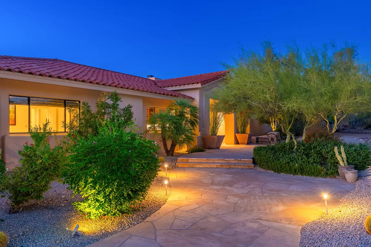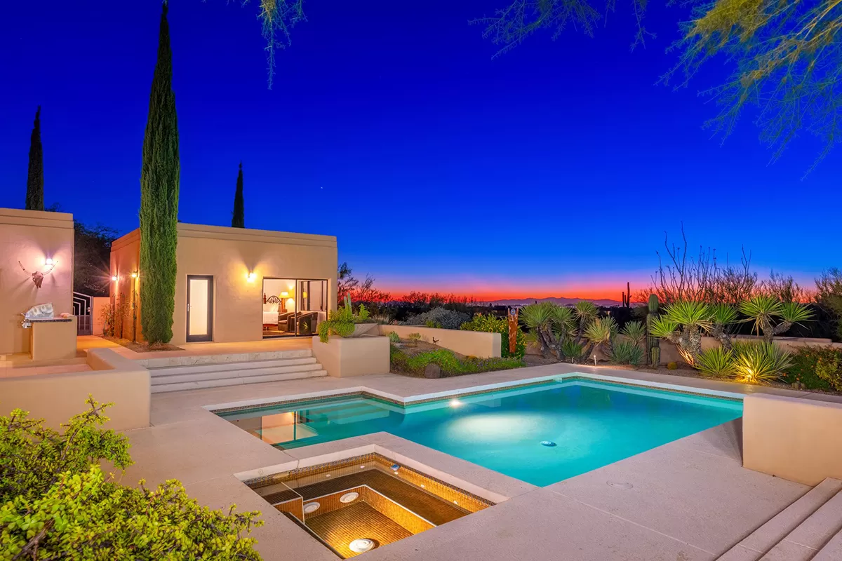 Breathtaking views of Pinnacle Peak, the valley, and city lights set the stage for this stunning home, nestled on just over an acre of mature desert landscape. Freshly painted throughout with all new switches and cover plates, this three bedroom plus office and three and a half bathroom home is a blank canvas ready for its new owner. The main house spans 2,791 square feet of single-level living, featuring two bedrooms, plus an office that could serve as a fourth bedroom, and two-and-a-half bathrooms. The thoughtful split floor plan provides privacy, while the detached 460 square foot guest house, with its own private entry, offers a bedroom, full bath, classic kiva fireplace, sitting area, and kitchenette.
