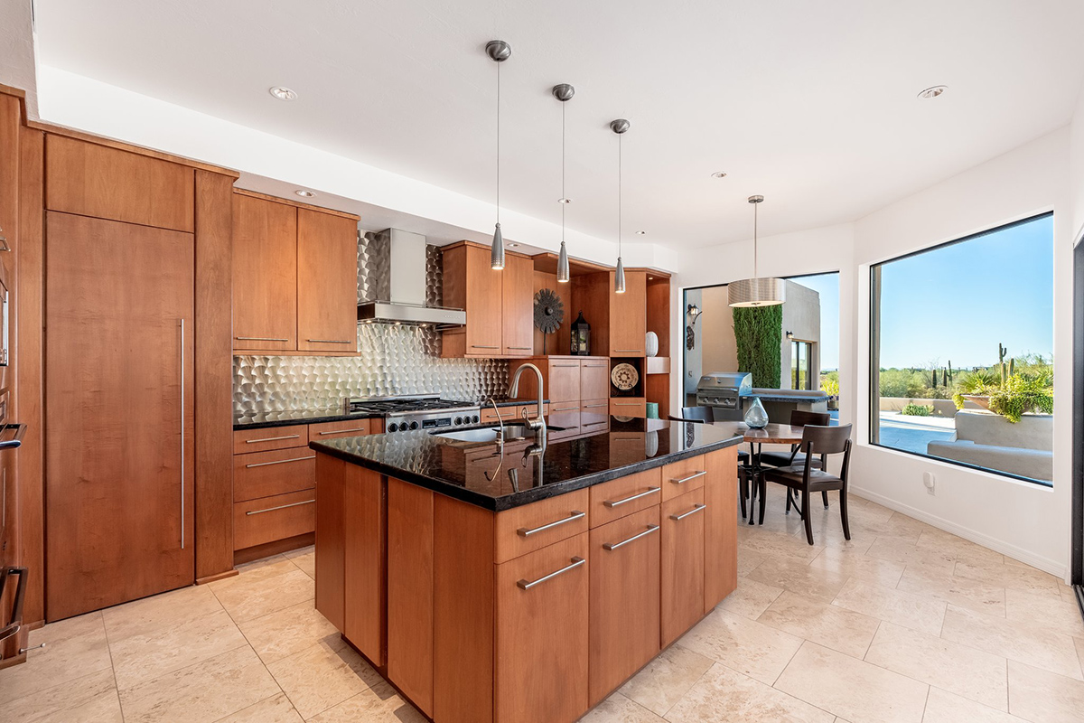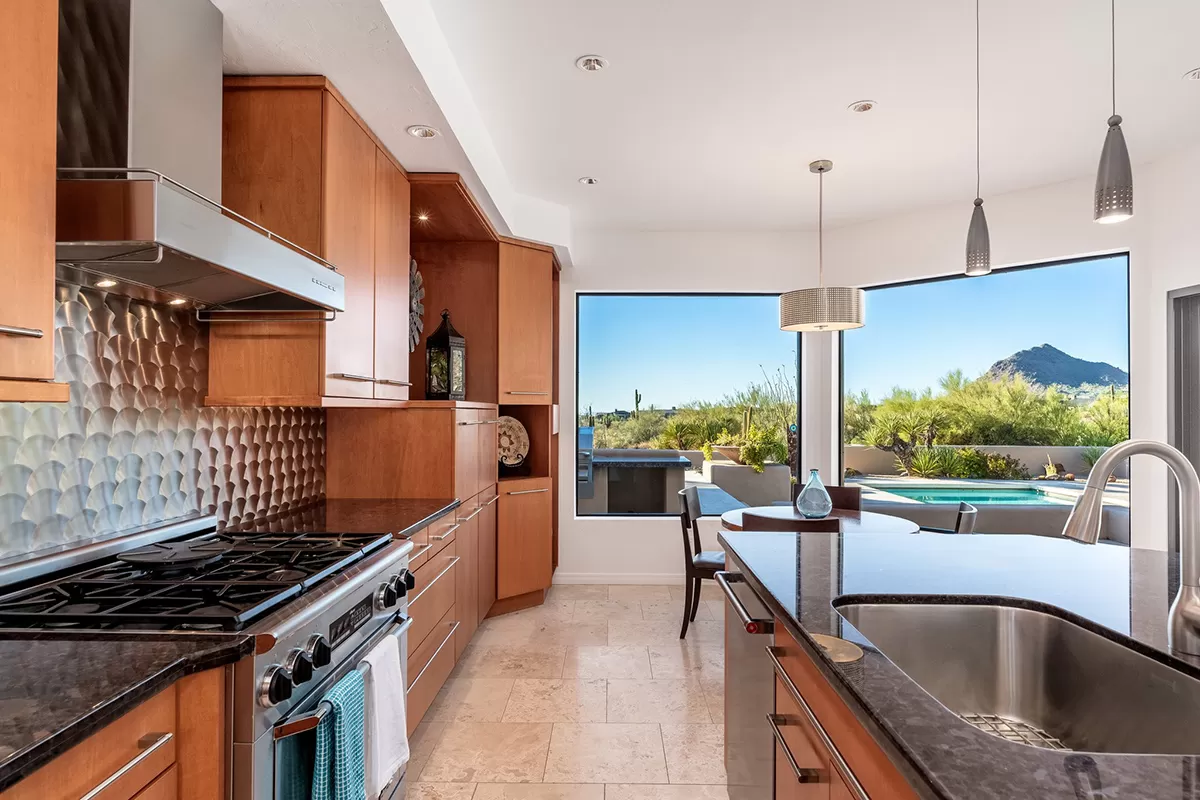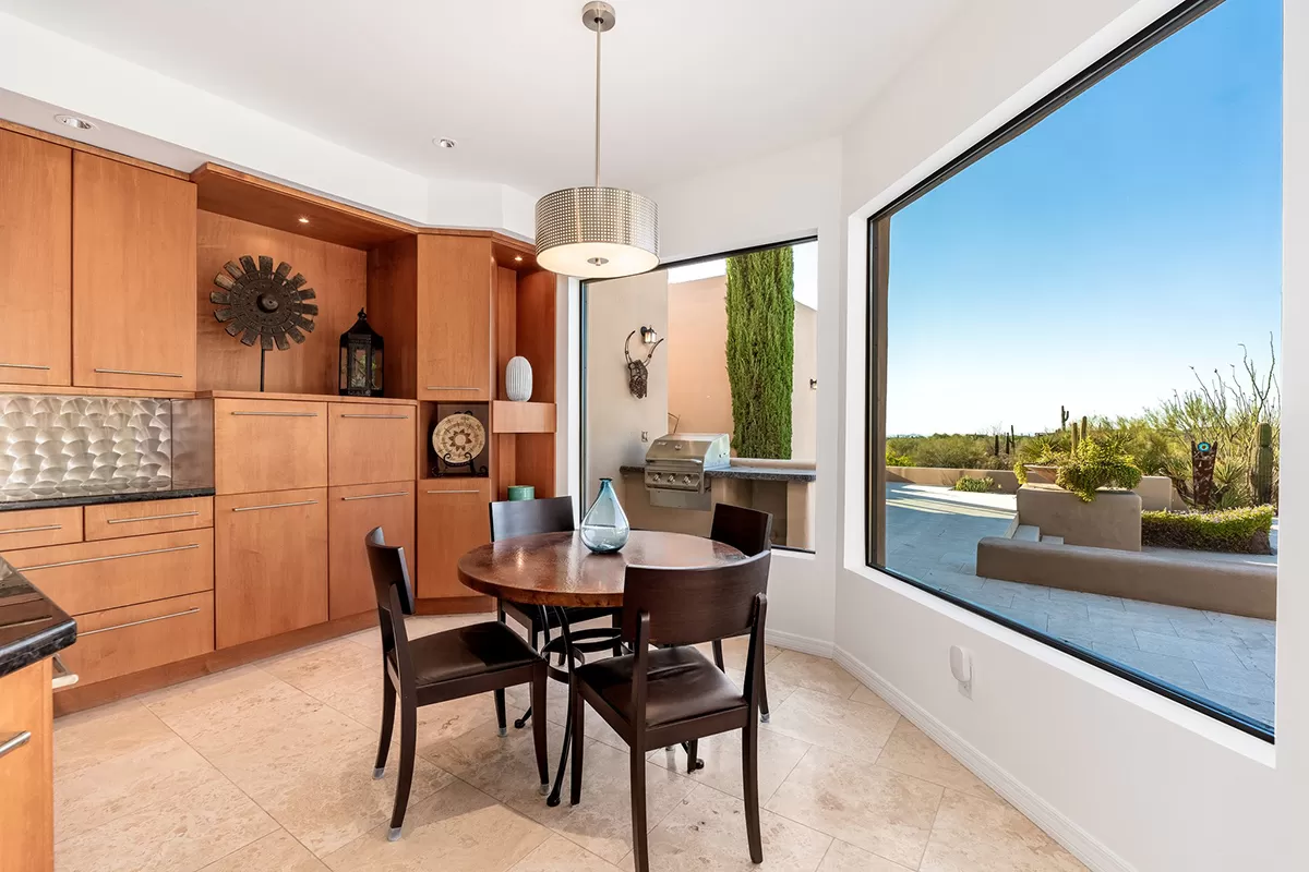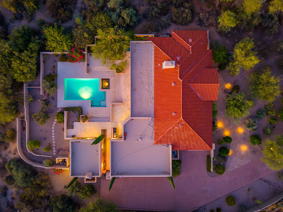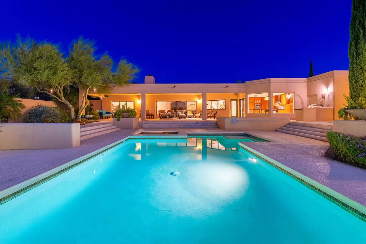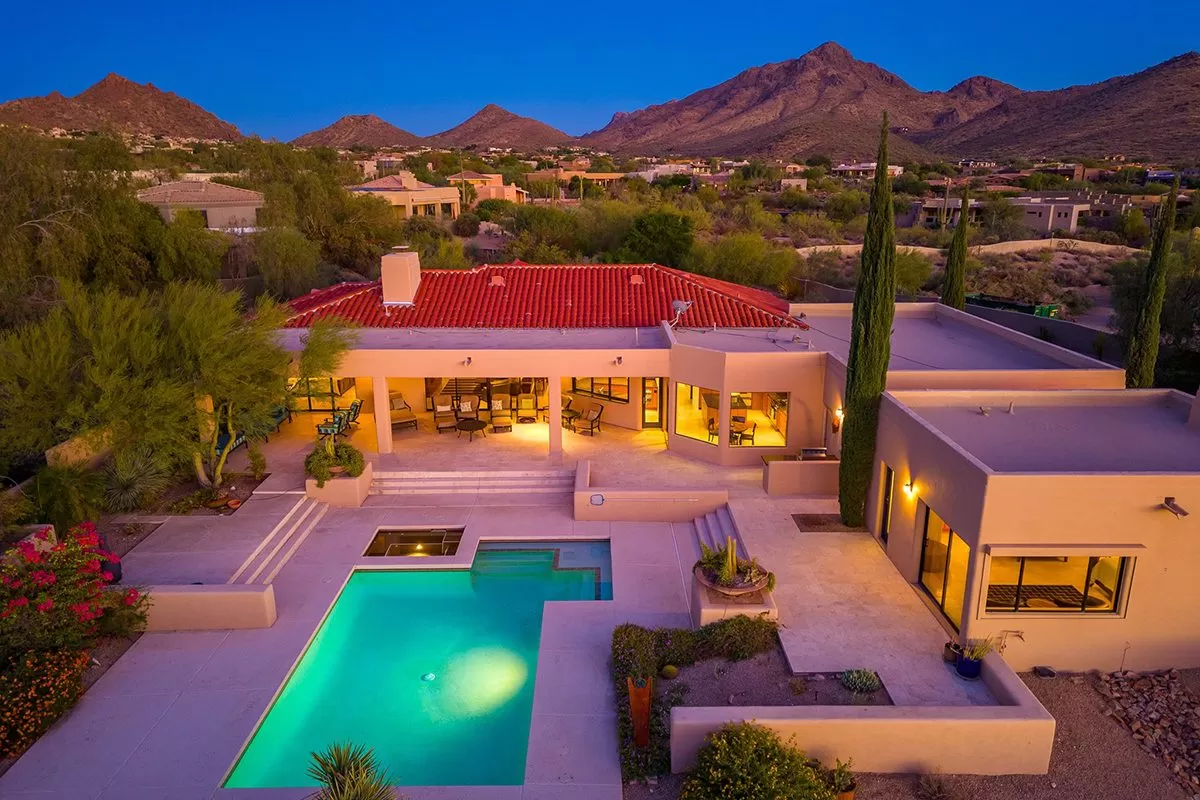 Breathtaking views of Pinnacle Peak, the valley, and city lights set the stage for this stunning home, nestled on just over an acre of mature desert landscape. Freshly painted throughout with all new switches and cover plates, this three bedroom plus office and three and a half bathroom home is a blank canvas ready for its new owner. The main house spans 2,791 square feet of single-level living, featuring two bedrooms, plus an office that could serve as a fourth bedroom, and two-and-a-half bathrooms. The thoughtful split floor plan provides privacy, while the detached 460 square foot guest house, with its own private entry, offers a bedroom, full bath, classic kiva fireplace, sitting area, and kitchenette.