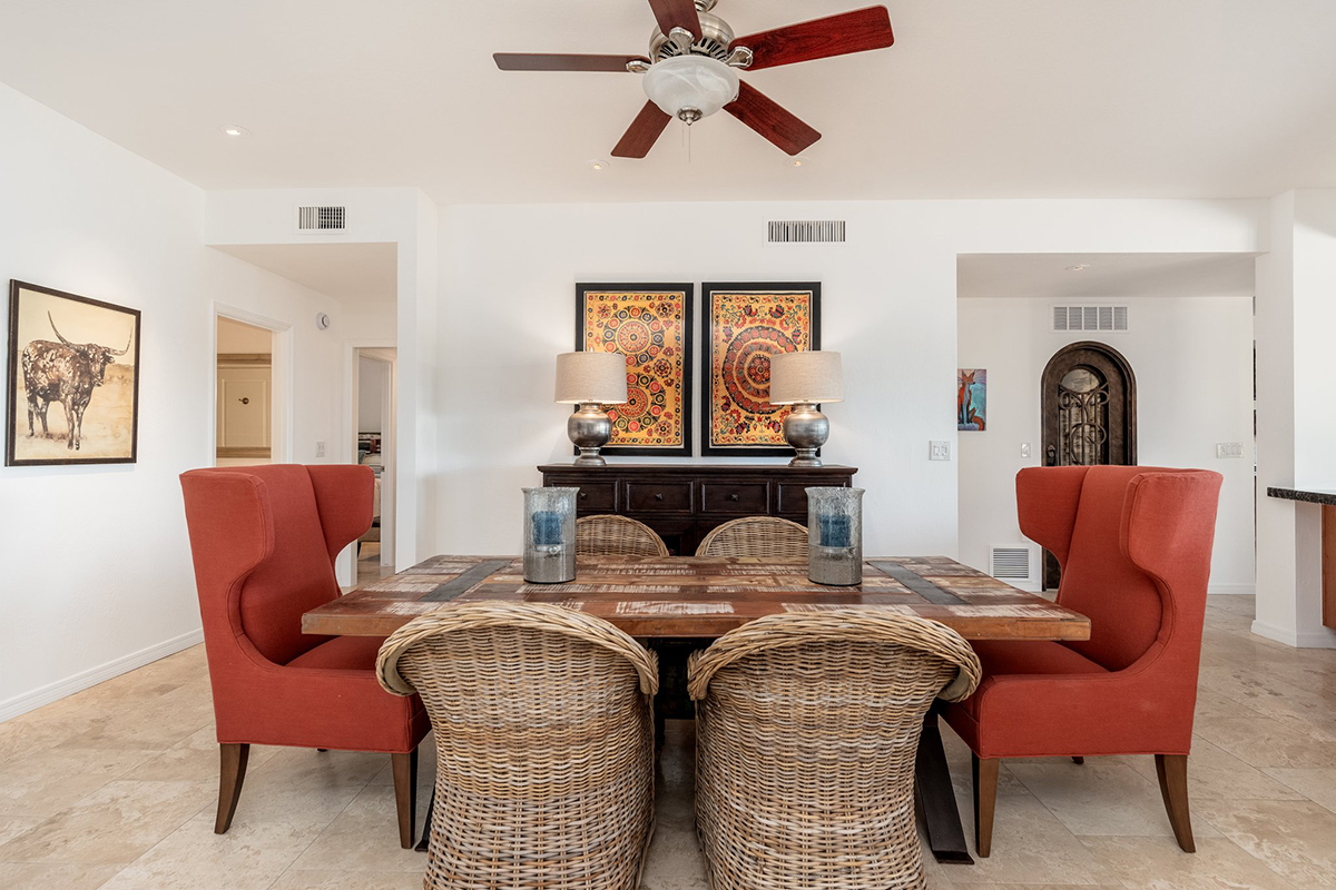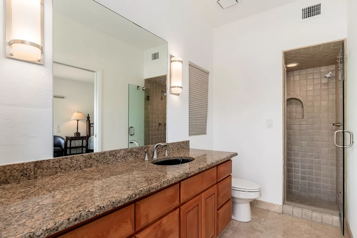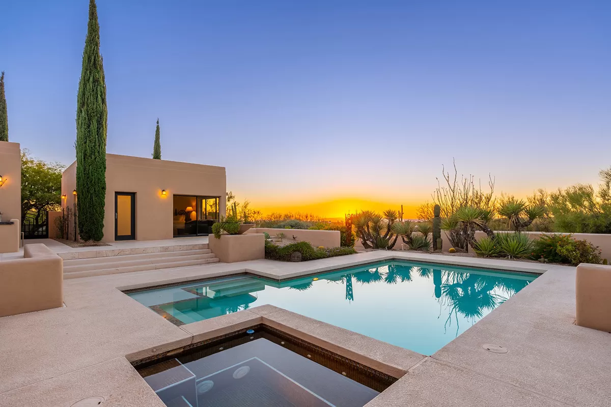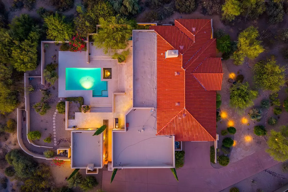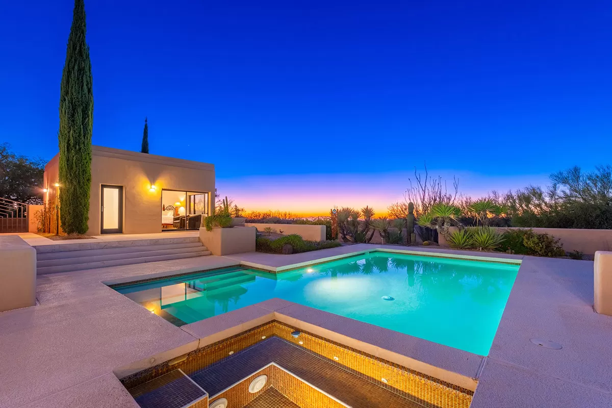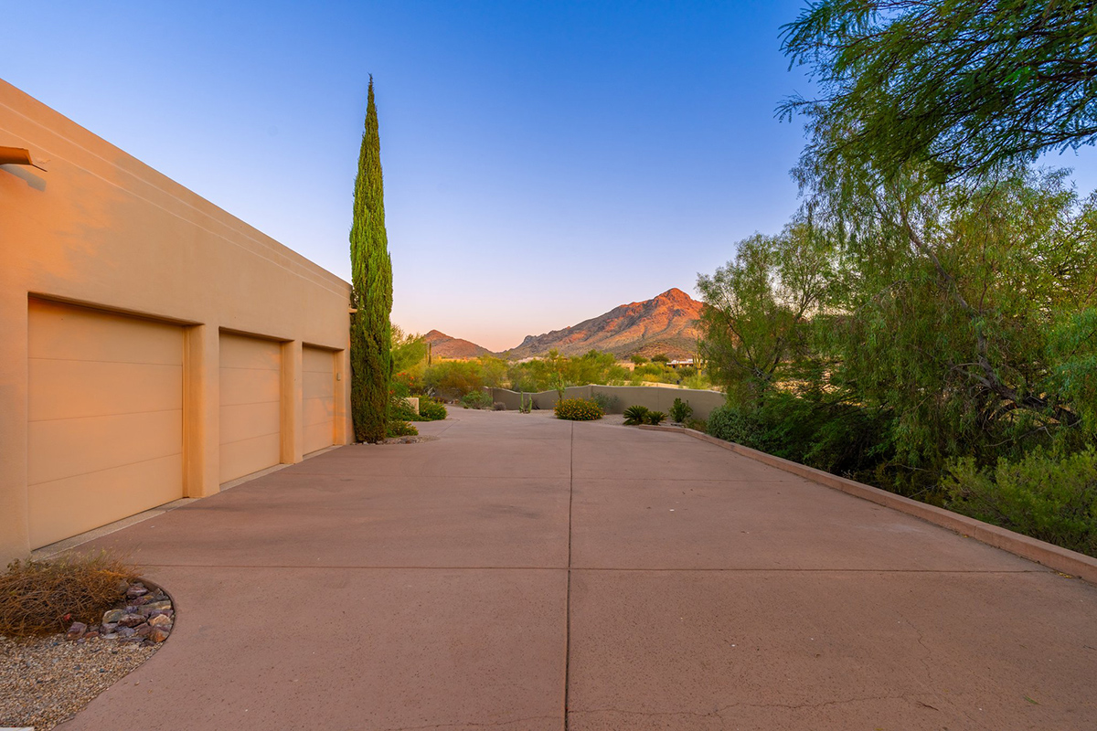 Breathtaking views of Pinnacle Peak, the valley, and city lights set the stage for this stunning home, nestled on just over an acre of mature desert landscape. Freshly painted throughout with all new switches and cover plates, this three bedroom plus office and three and a half bathroom home is a blank canvas ready for its new owner. The main house spans 2,791 square feet of single-level living, featuring two bedrooms, plus an office that could serve as a fourth bedroom, and two-and-a-half bathrooms. The thoughtful split floor plan provides privacy, while the detached 460 square foot guest house, with its own private entry, offers a bedroom, full bath, classic kiva fireplace, sitting area, and kitchenette.
