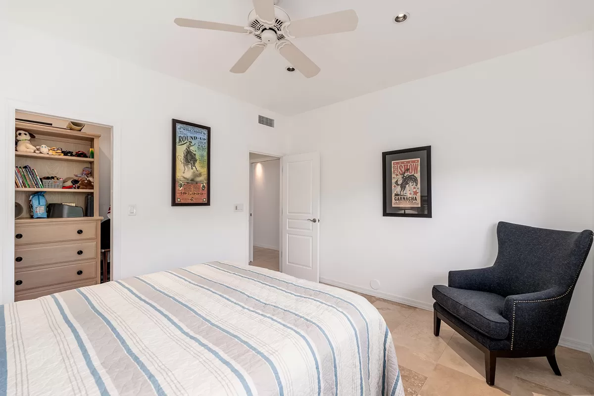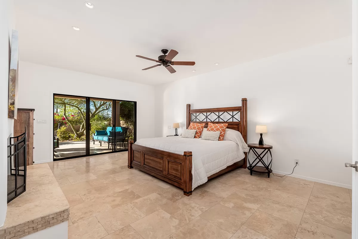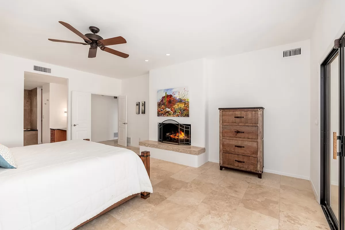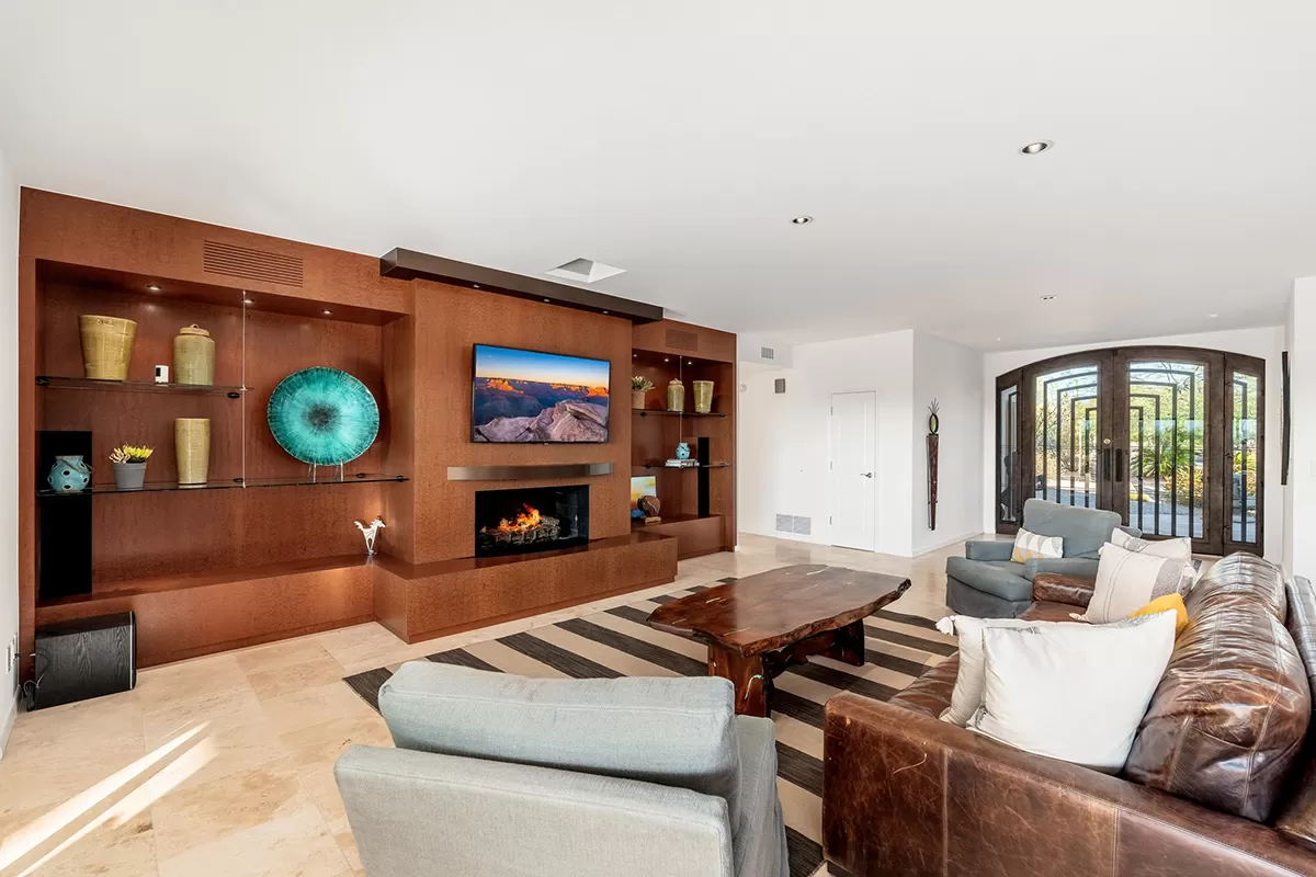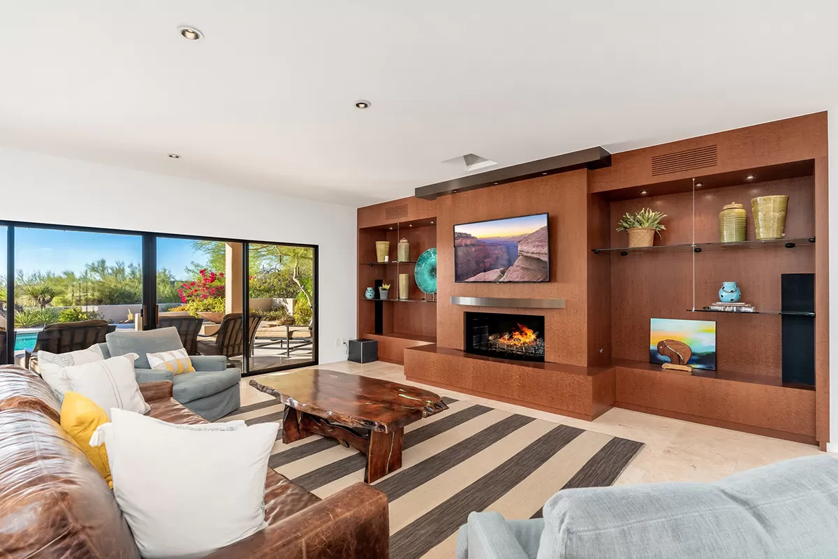 The main home welcomes you with an open great room, where an oversized sliding glass door fills the space with natural light and offers seamless views of the backyard. A modern fireplace with a custom wood surround and display shelving adds warmth to the room. Extending from the home is a spacious travertine patio, offering plenty of room for outdoor dining and lounging, all while overlooking the pool, spa, and barbecue area—perfect for entertaining.