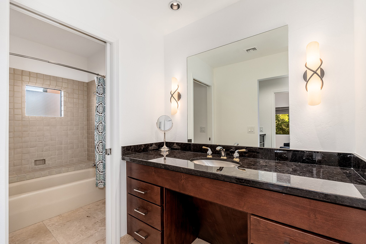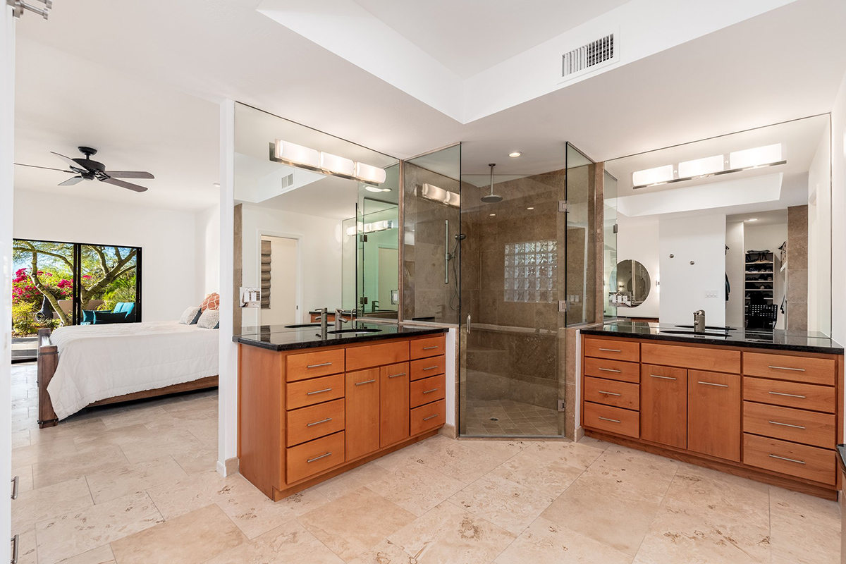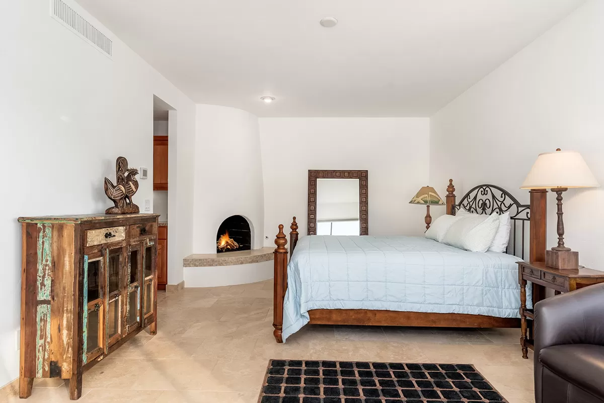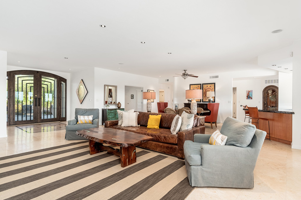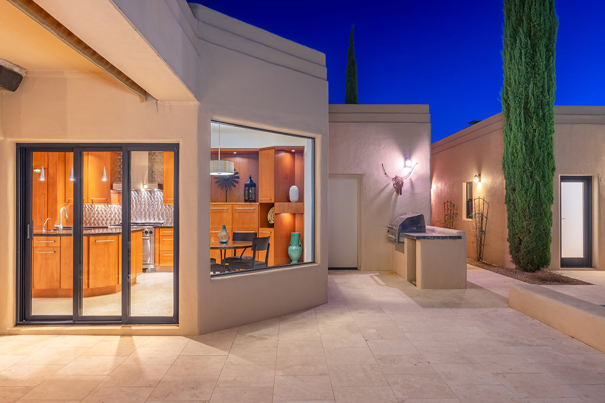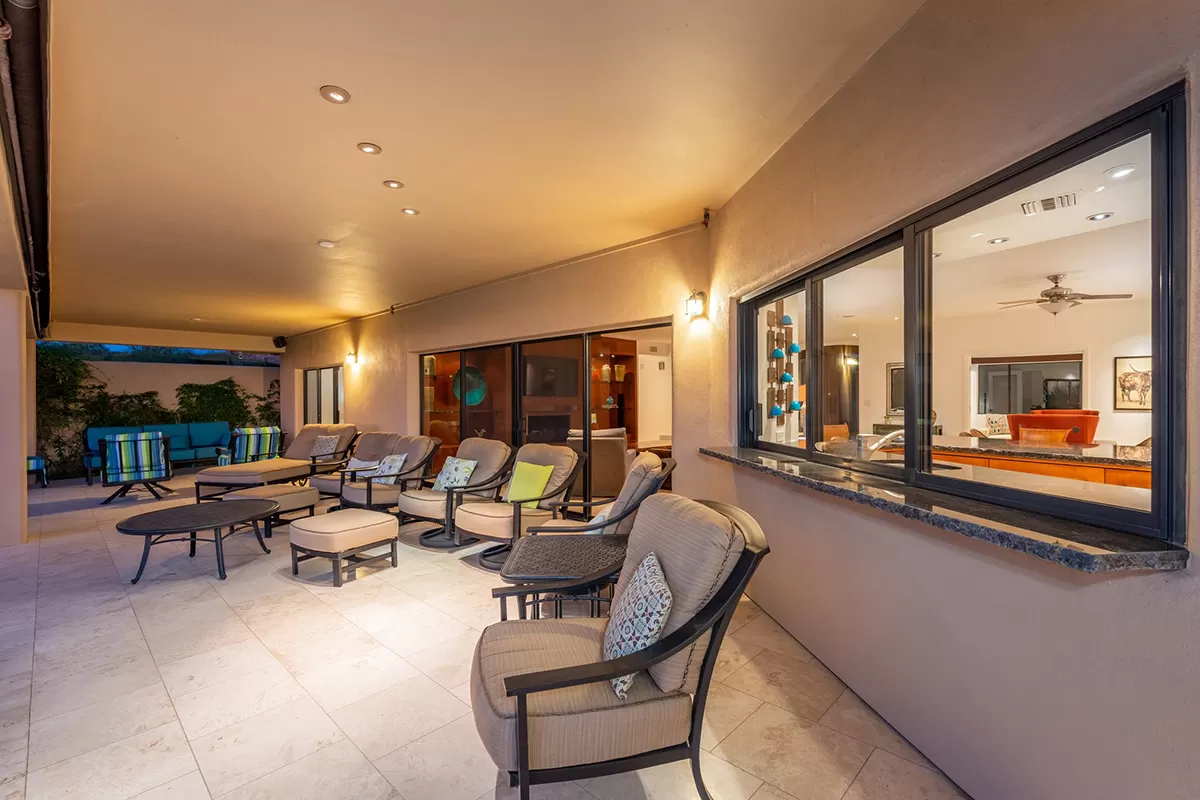 The main home welcomes you with an open great room, where an oversized sliding glass door fills the space with natural light and offers seamless views of the backyard. A modern fireplace with a custom wood surround and display shelving adds warmth to the room. Extending from the home is a spacious travertine patio, offering plenty of room for outdoor dining and lounging, all while overlooking the pool, spa, and barbecue area—perfect for entertaining.