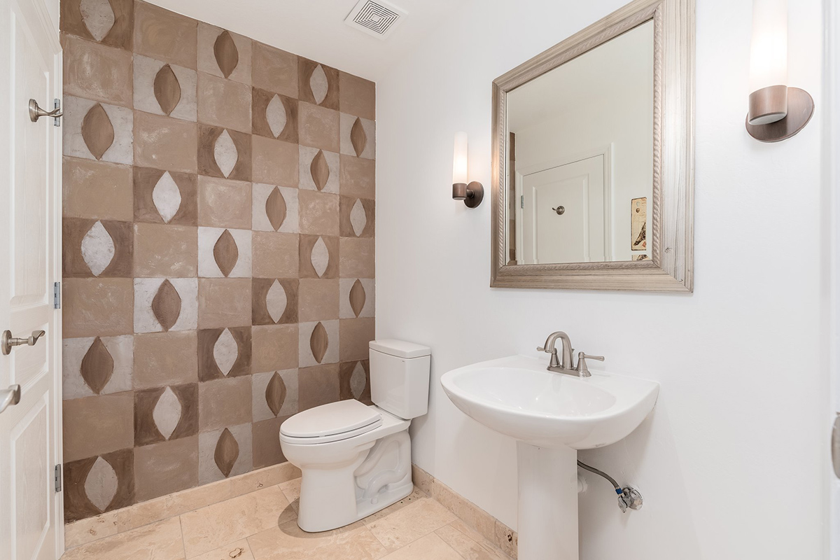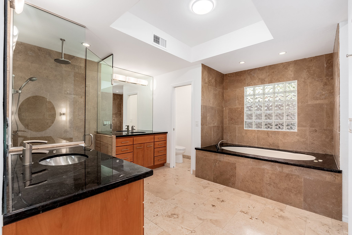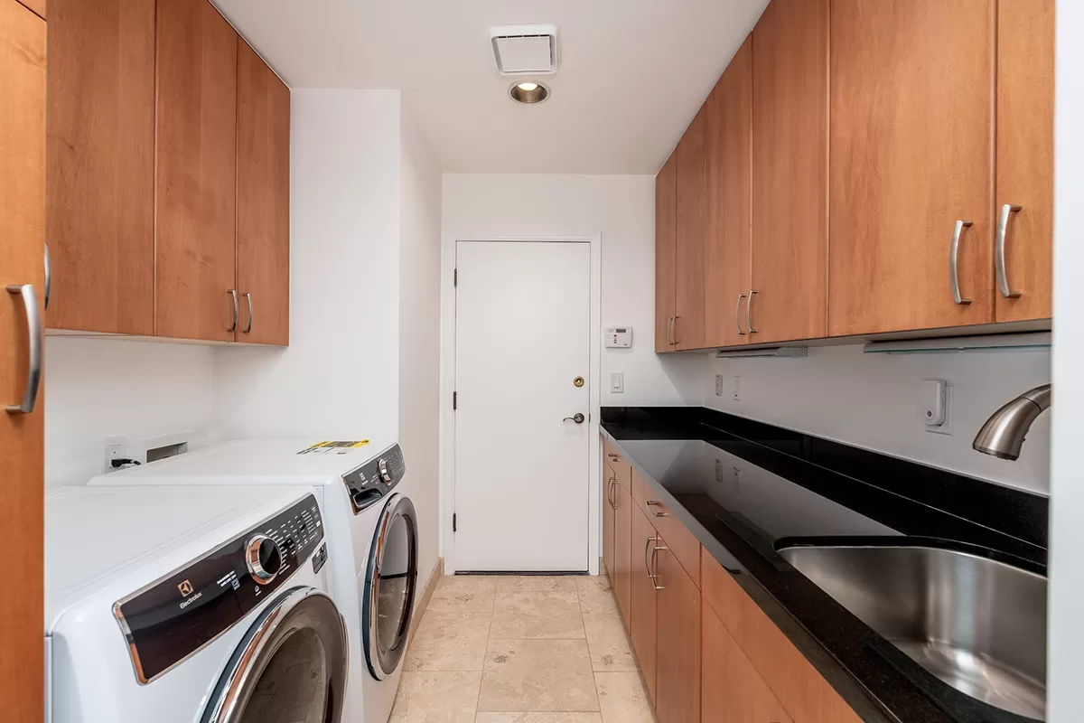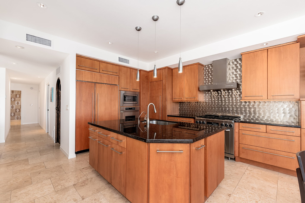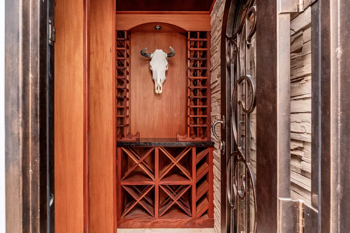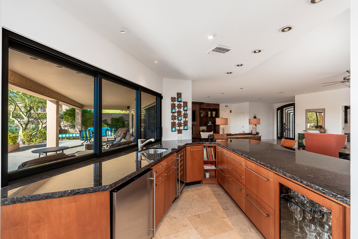 The kitchen is a contemporary chef’s dream, with flat-panel European cabinetry, matching paneled refrigerator and freezer, stainless steel appliances, gas cooktop, and a center island topped with black granite. A hidden walk-in pantry, accessible from both the kitchen and garage, provides extra storage and convenience. Adjacent to the kitchen is a full wet bar with matching finishes, a beverage fridge, and an open flow to the great room and wine room, which features built-in wine storage and an arched steel and glass display door.