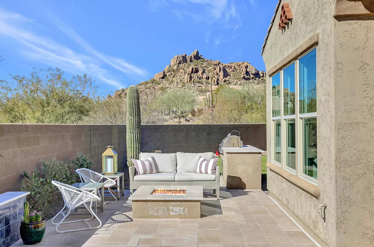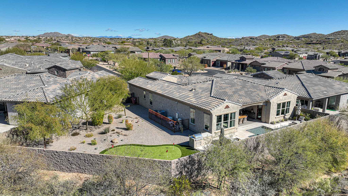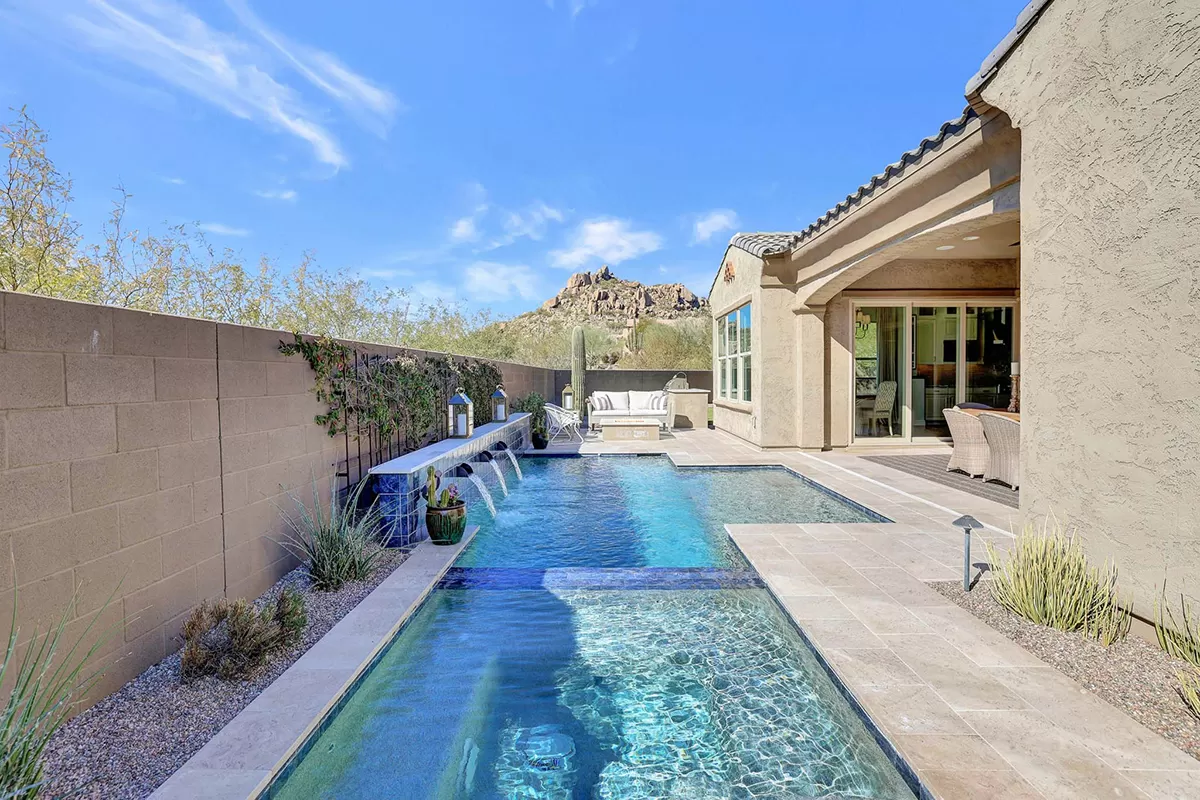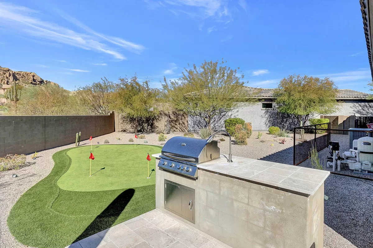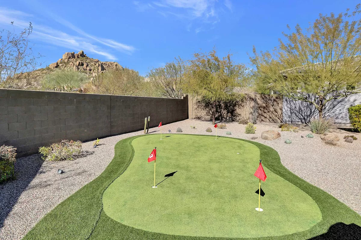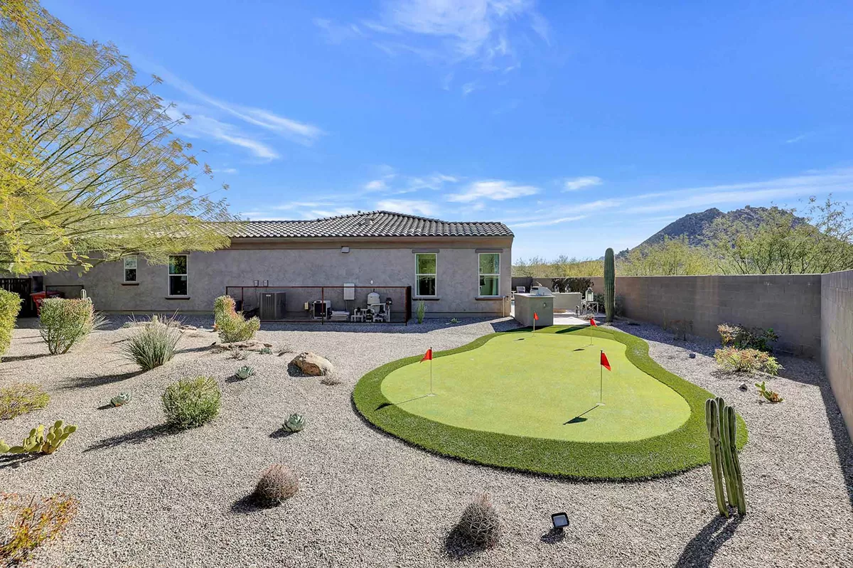As you enter, a center interior courtyard with travertine paving and a gas firepit offers a secluded oasis, perfect for entertaining guests or enjoying tranquil mornings. Revel in views of both Troon Mountain and Pinnacle Peak, creating a picturesque backdrop for exterior living. The expansive backyard features an artificial turf 5-hole putting green, fire pit, heated self-cleaning pool and spa, built-in BBQ, covered patio, and low-maintenance landscaping, meticulously crafted by Blooming Desert Design.