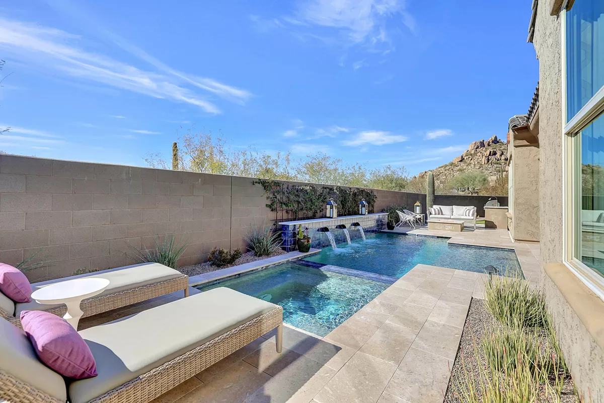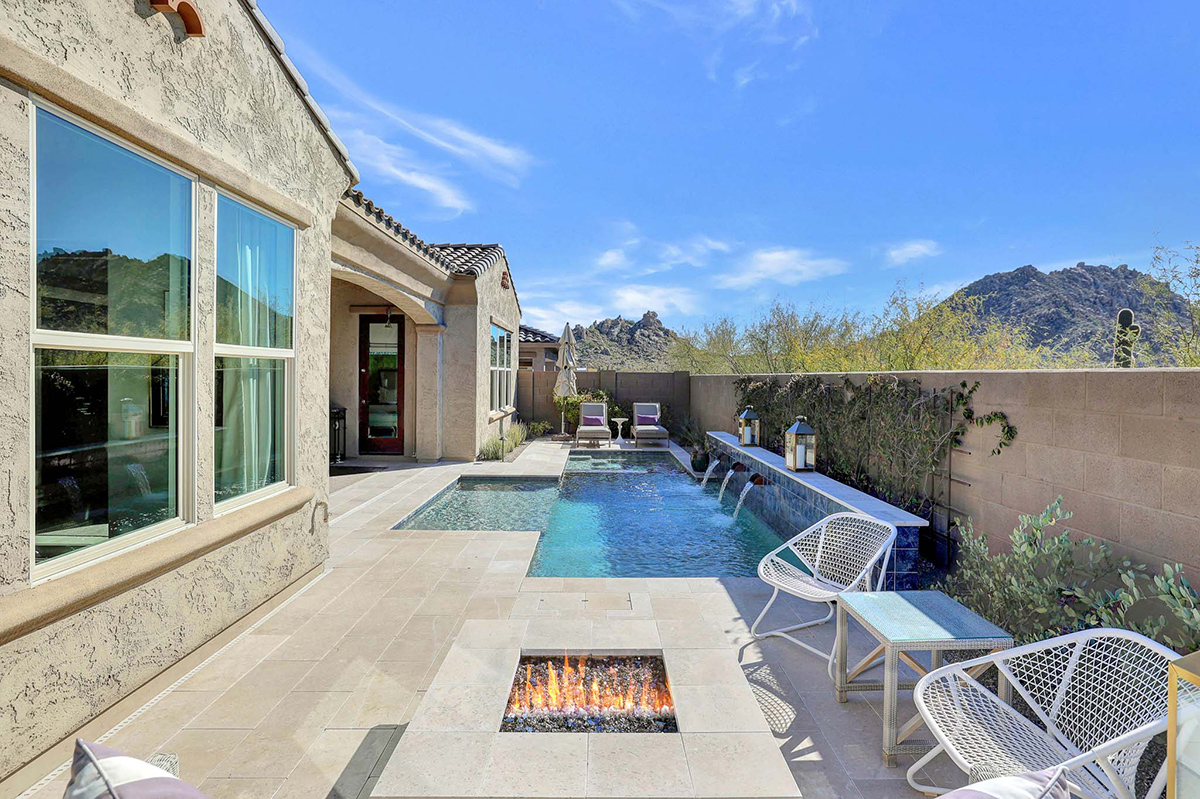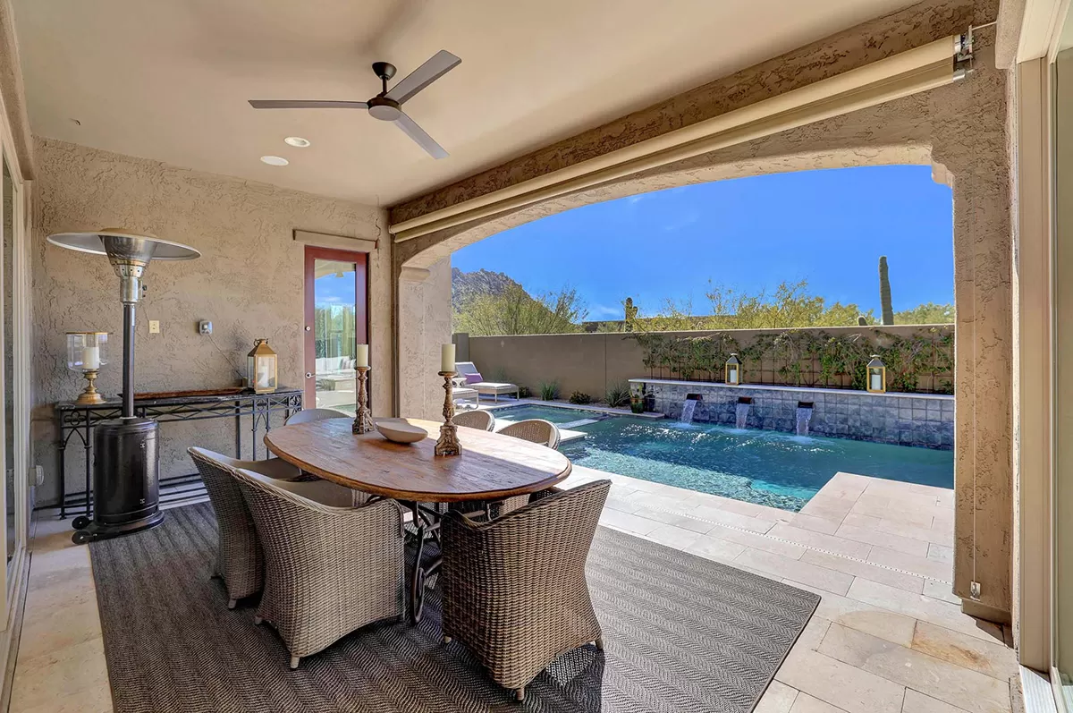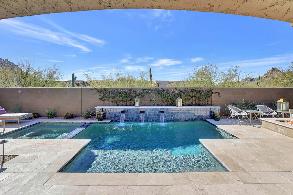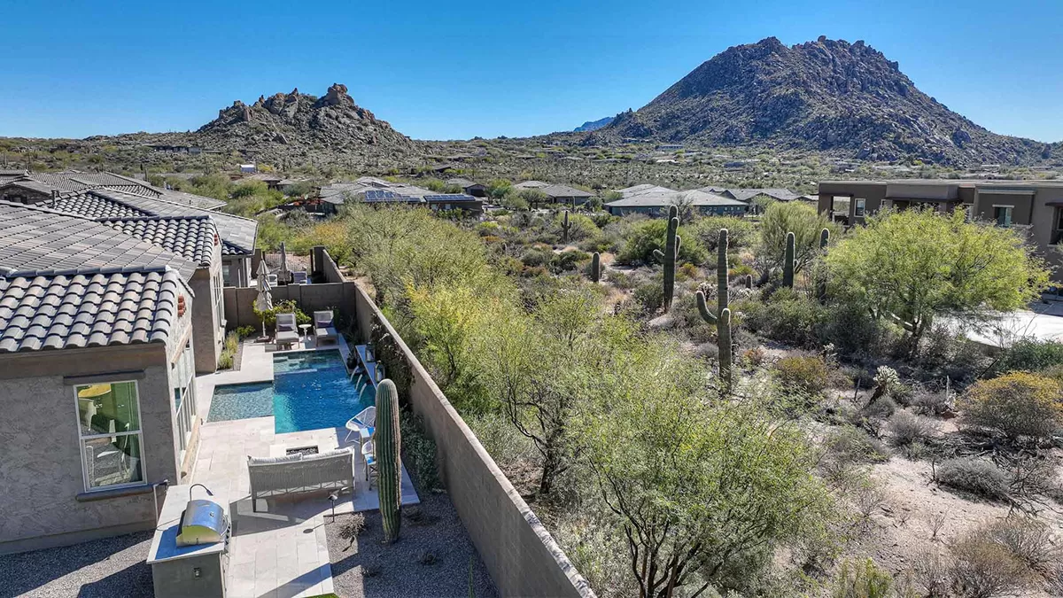 As you enter, a center interior courtyard with travertine paving and a gas firepit offers a secluded oasis, perfect for entertaining guests or enjoying tranquil mornings. Revel in views of both Troon Mountain and Pinnacle Peak, creating a picturesque backdrop for exterior living. The expansive backyard features an artificial turf 5-hole putting green, fire pit, heated self-cleaning pool and spa, built-in BBQ, covered patio, and low-maintenance landscaping, meticulously crafted by Blooming Desert Design.