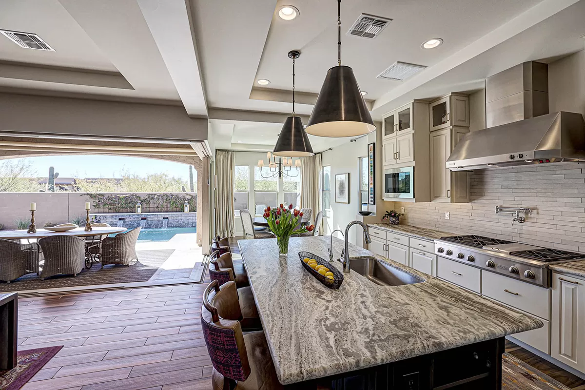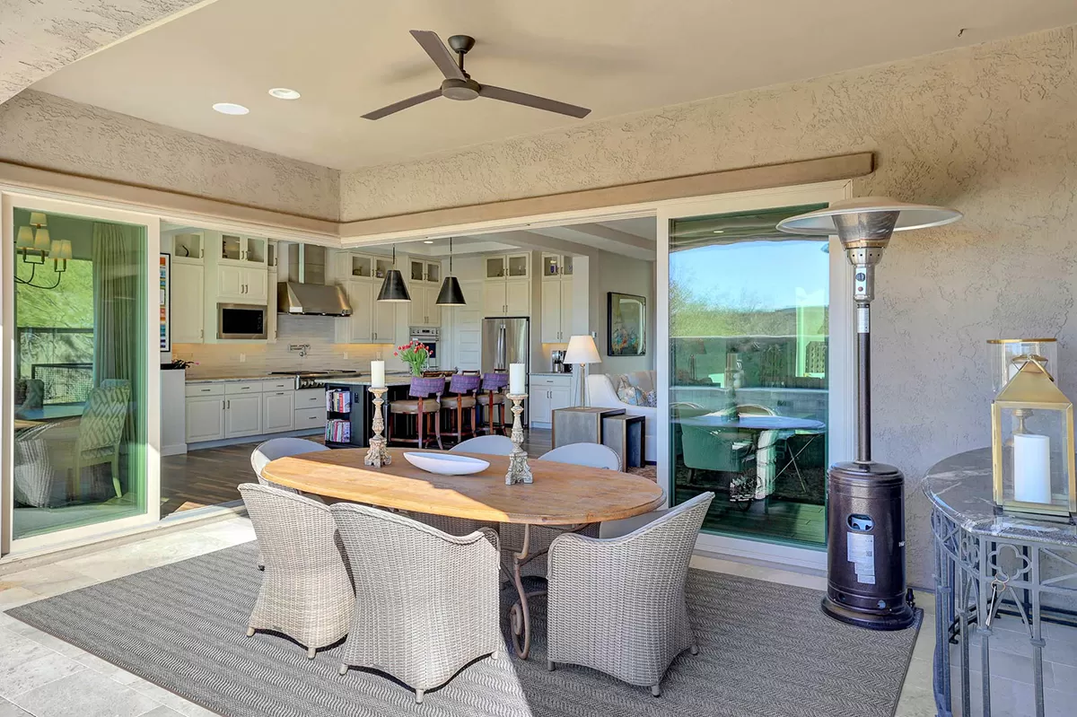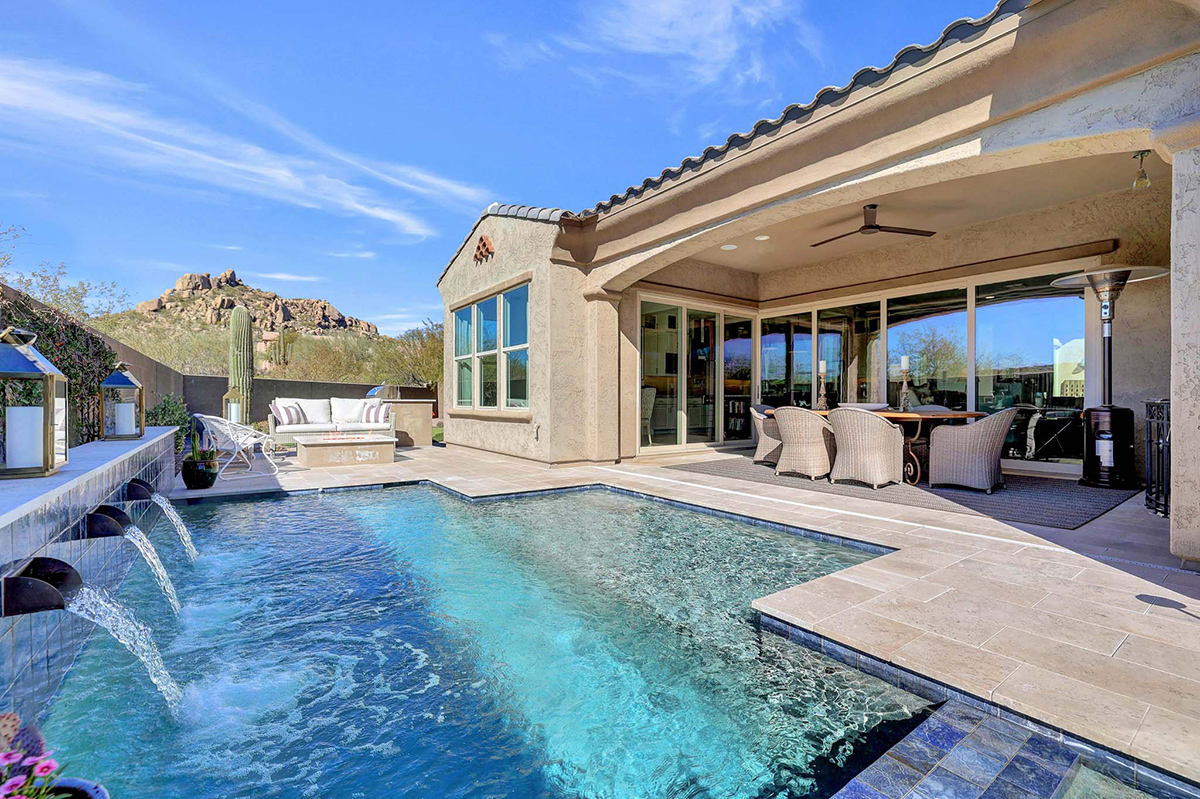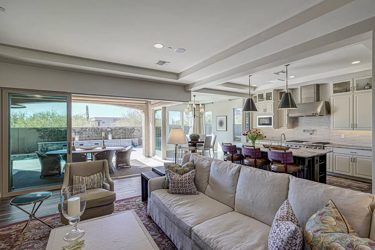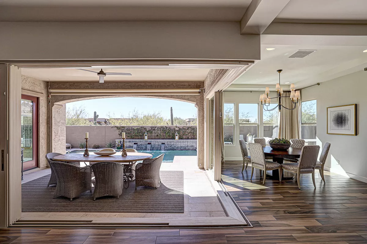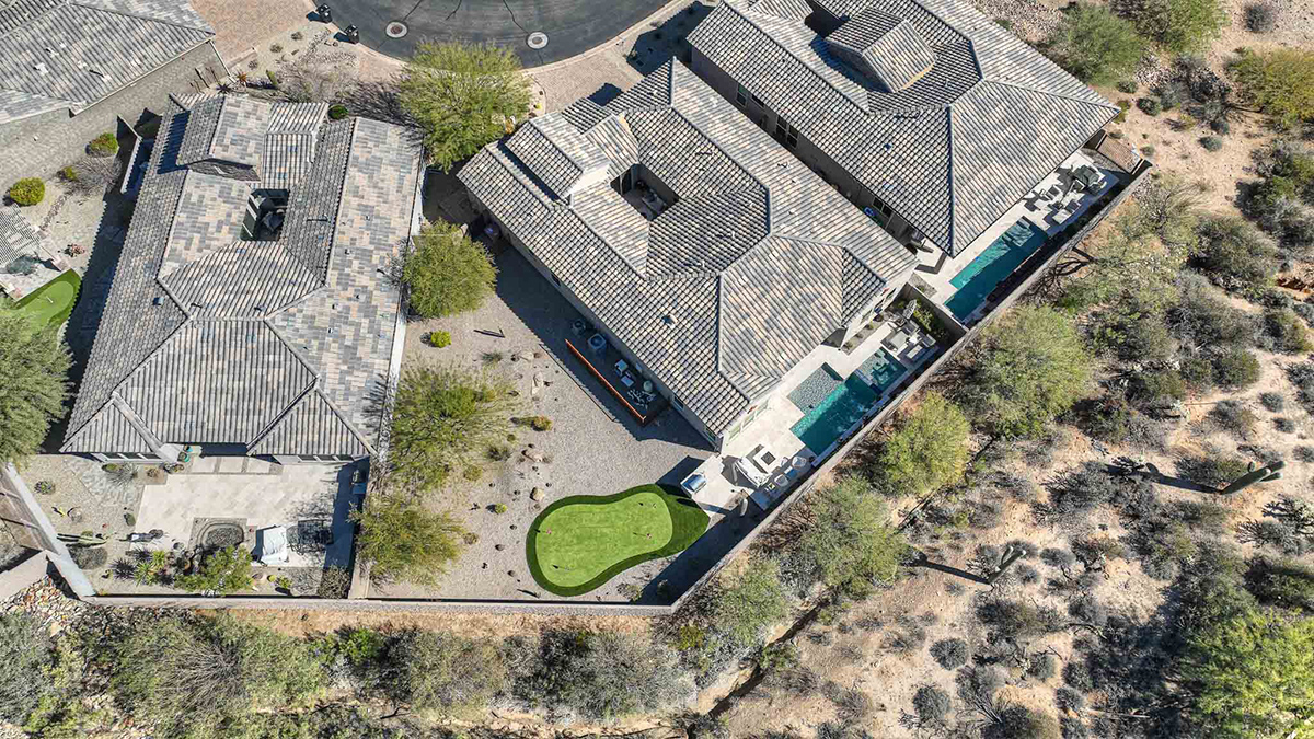 As you enter, a center interior courtyard with travertine paving and a gas firepit offers a secluded oasis, perfect for entertaining guests or enjoying tranquil mornings. Revel in views of both Troon Mountain and Pinnacle Peak, creating a picturesque backdrop for exterior living. The expansive backyard features an artificial turf 5-hole putting green, fire pit, heated self-cleaning pool and spa, built-in BBQ, covered patio, and low-maintenance landscaping, meticulously crafted by Blooming Desert Design.