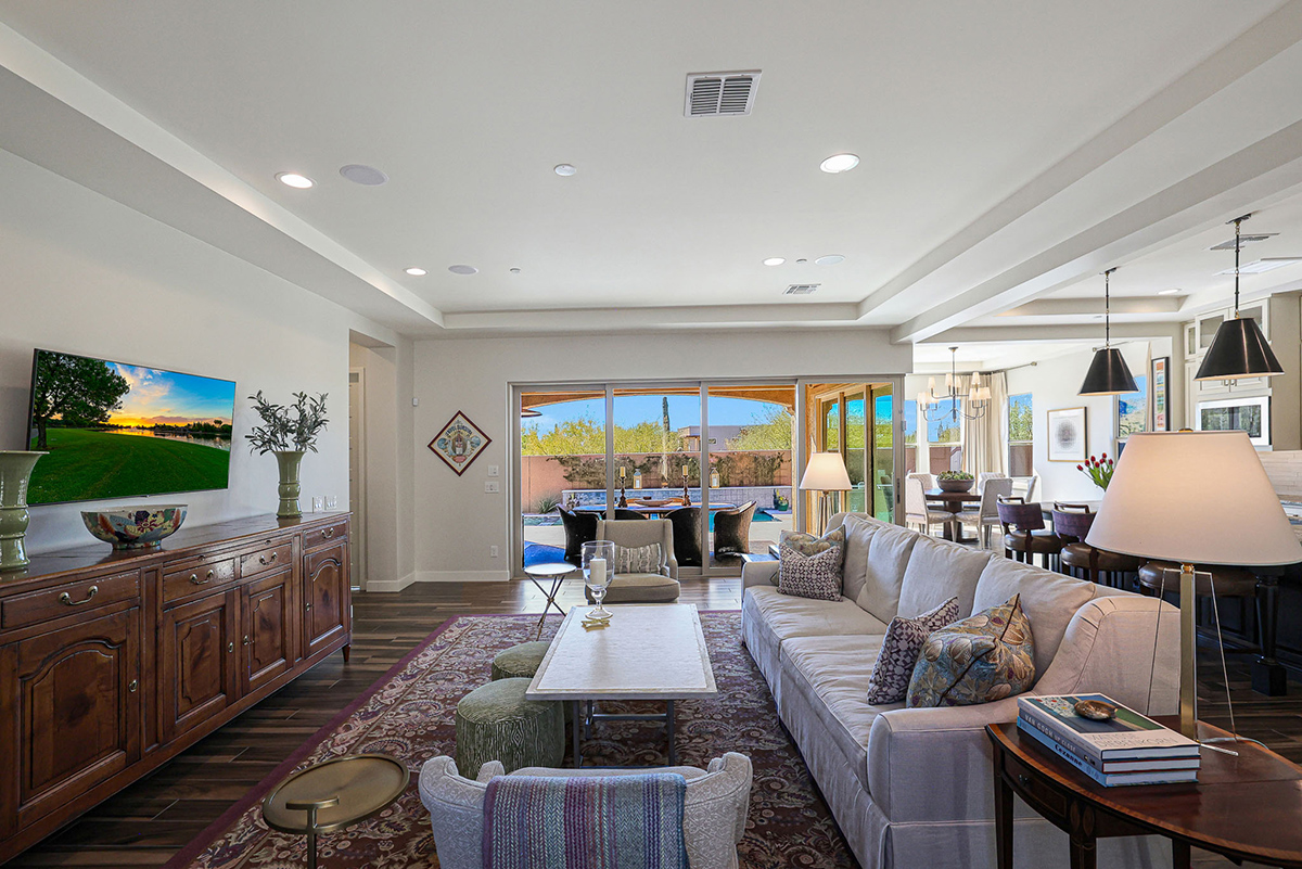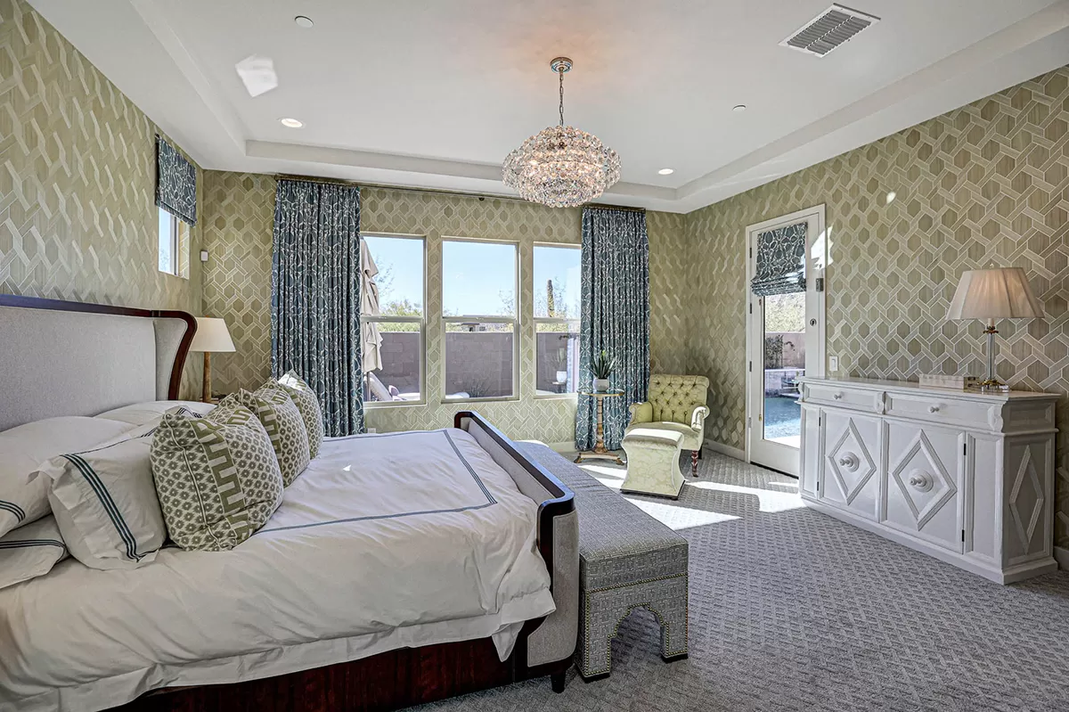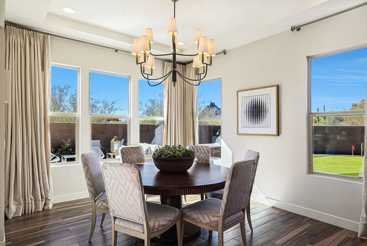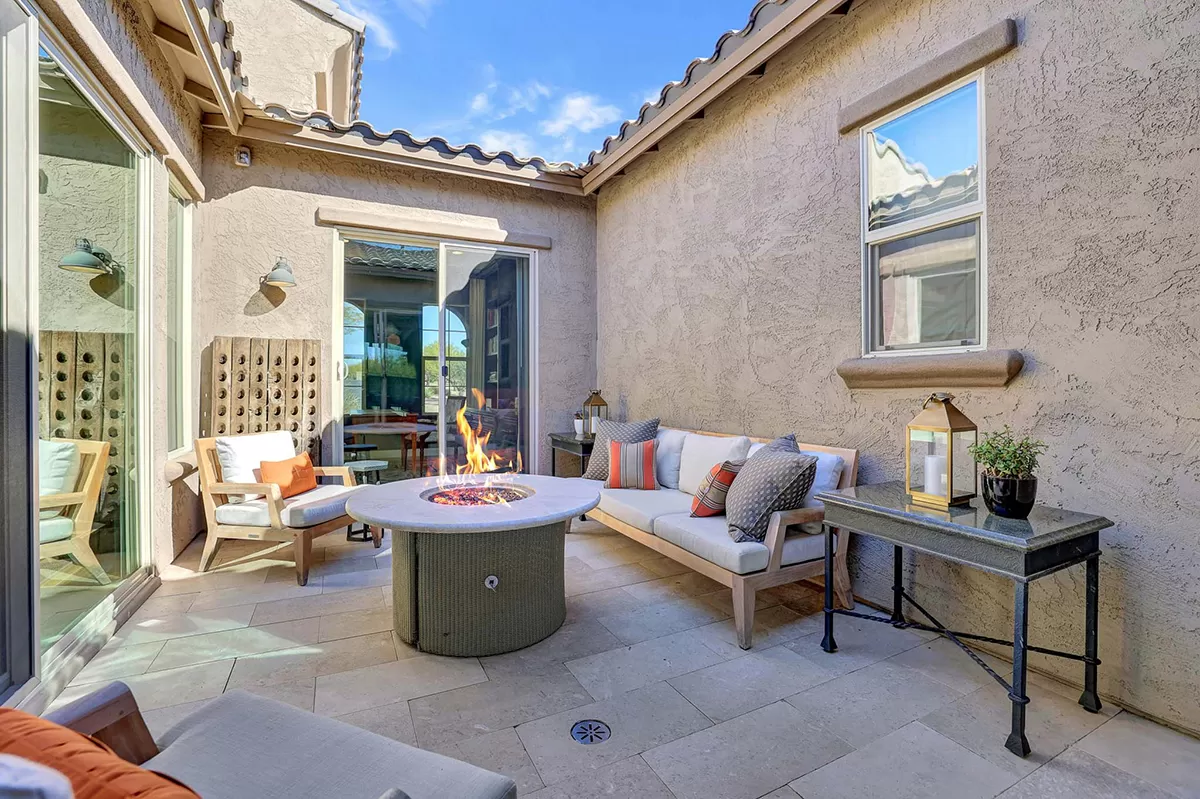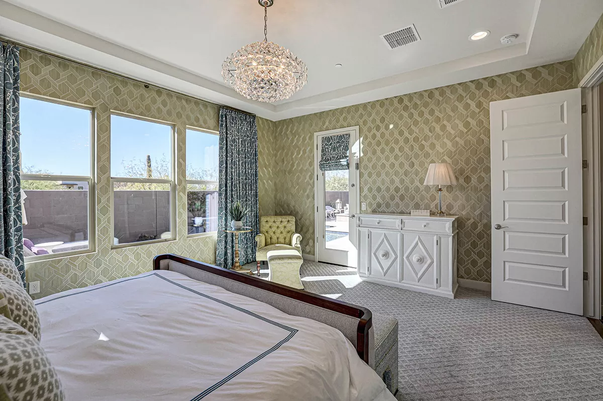 As you enter, a center interior courtyard with travertine paving and a gas firepit offers a secluded oasis, perfect for entertaining guests or enjoying tranquil mornings. Revel in views of both Troon Mountain and Pinnacle Peak, creating a picturesque backdrop for exterior living. The expansive backyard features an artificial turf 5-hole putting green, fire pit, heated self-cleaning pool and spa, built-in BBQ, covered patio, and low-maintenance landscaping, meticulously crafted by Blooming Desert Design.