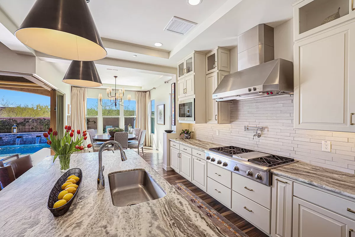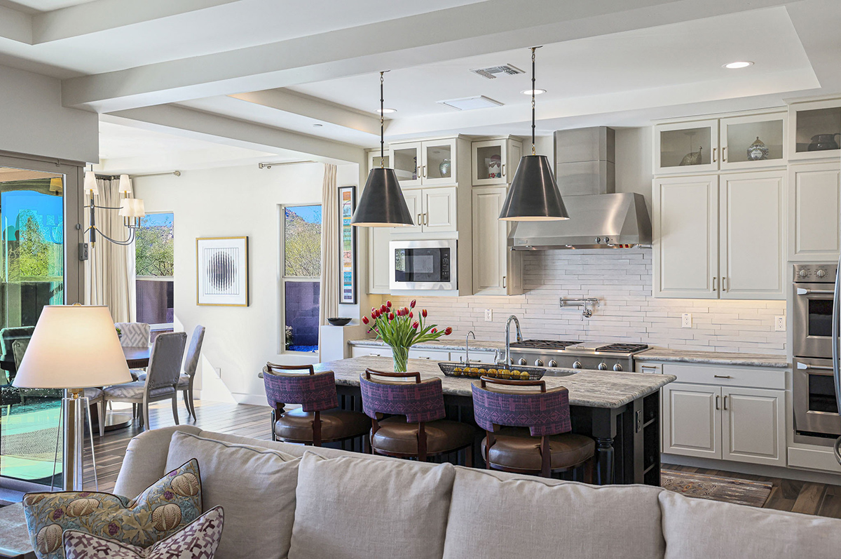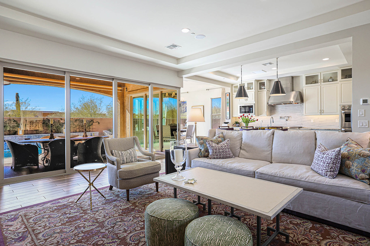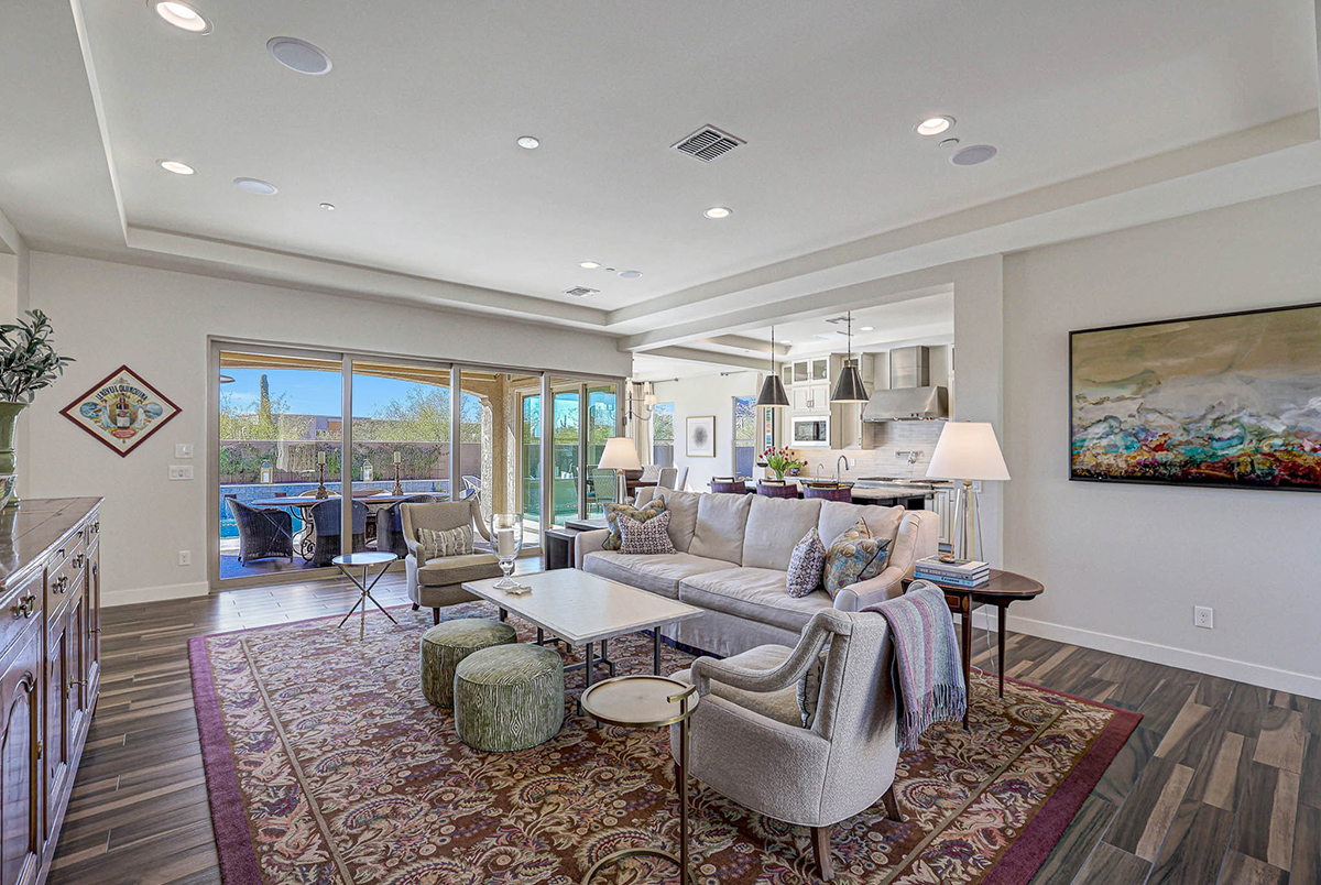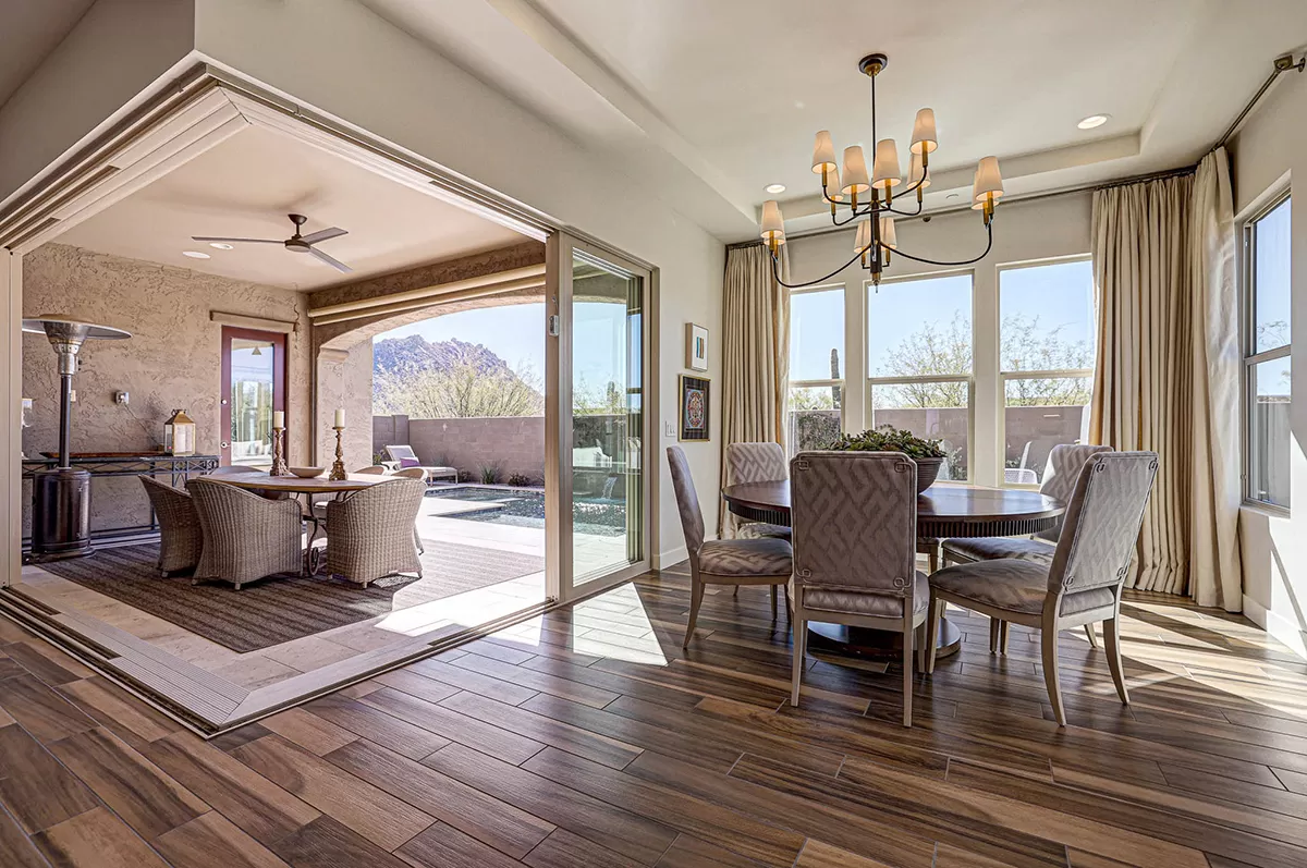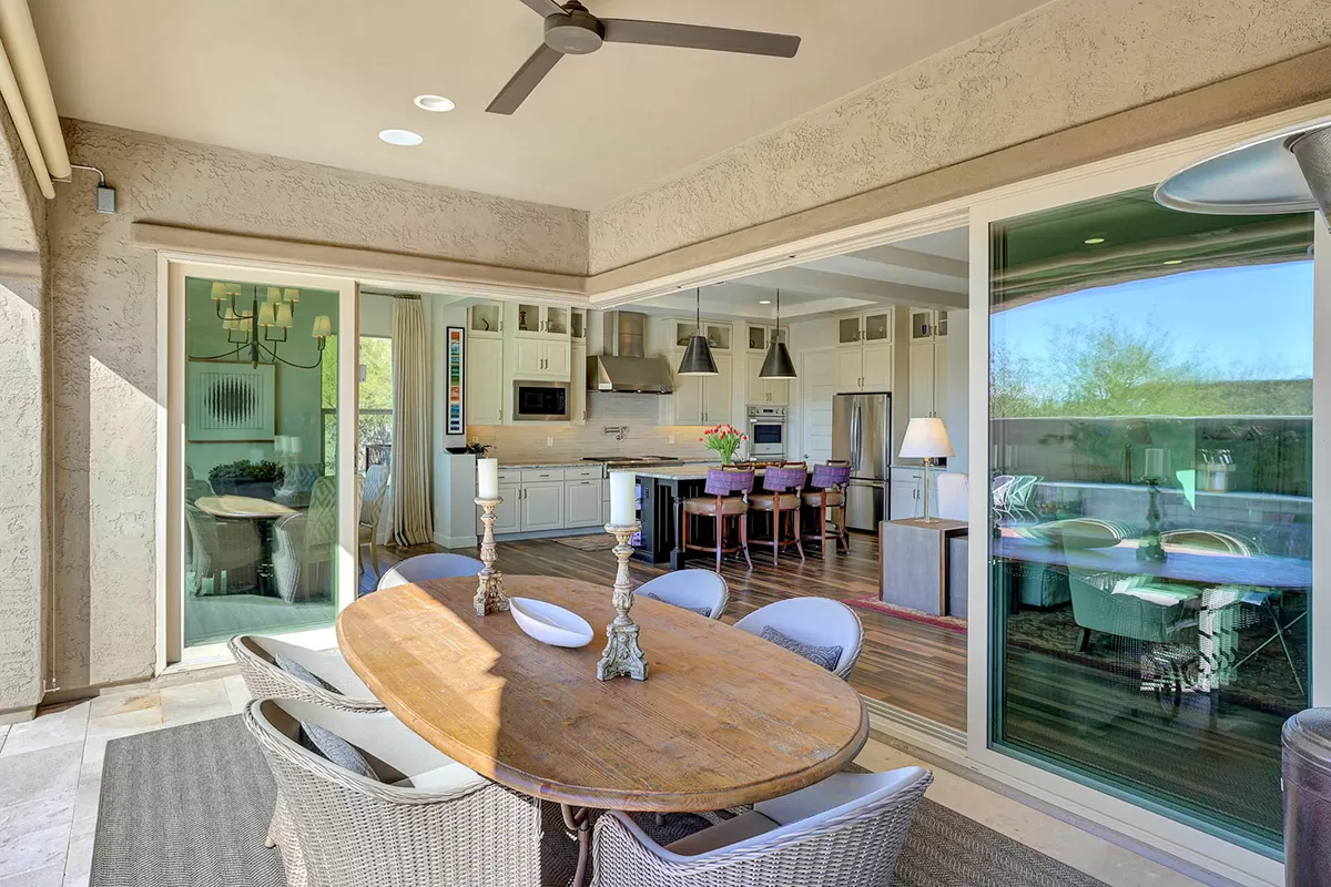 As you enter, a center interior courtyard with travertine paving and a gas firepit offers a secluded oasis, perfect for entertaining guests or enjoying tranquil mornings. Revel in views of both Troon Mountain and Pinnacle Peak, creating a picturesque backdrop for exterior living. The expansive backyard features an artificial turf 5-hole putting green, fire pit, heated self-cleaning pool and spa, built-in BBQ, covered patio, and low-maintenance landscaping, meticulously crafted by Blooming Desert Design.