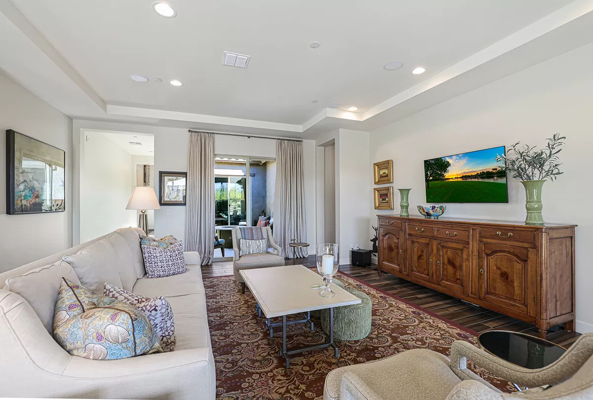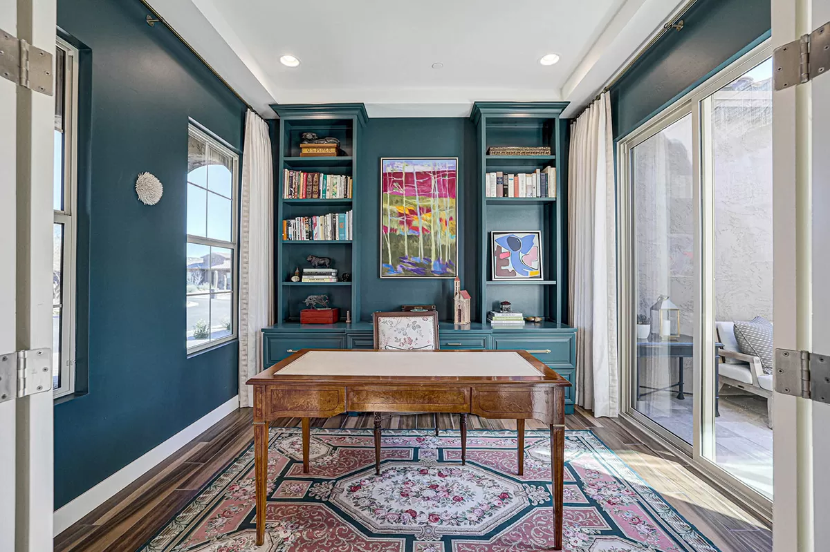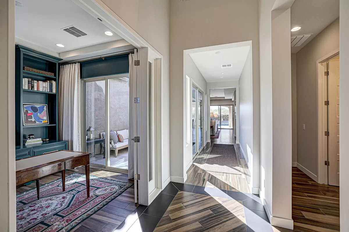 Inside, the home is adorned with designer window treatments, closet storage systems, and exquisite accents throughout, including wall treatments, custom lighting, and paint. The private office/den, situated off the entry foyer, boasts built-in bookshelves and cabinetry, providing a stylish and functional workspace with direct access to the interior courtyard. Two guest bedrooms, each with walk-in closets, share a well-appointed hall bath, offering a comfortable retreat for family or visitors.