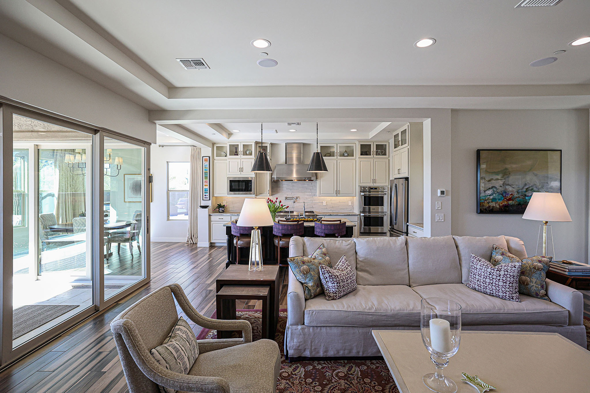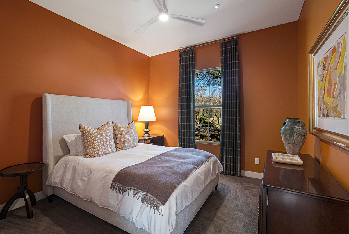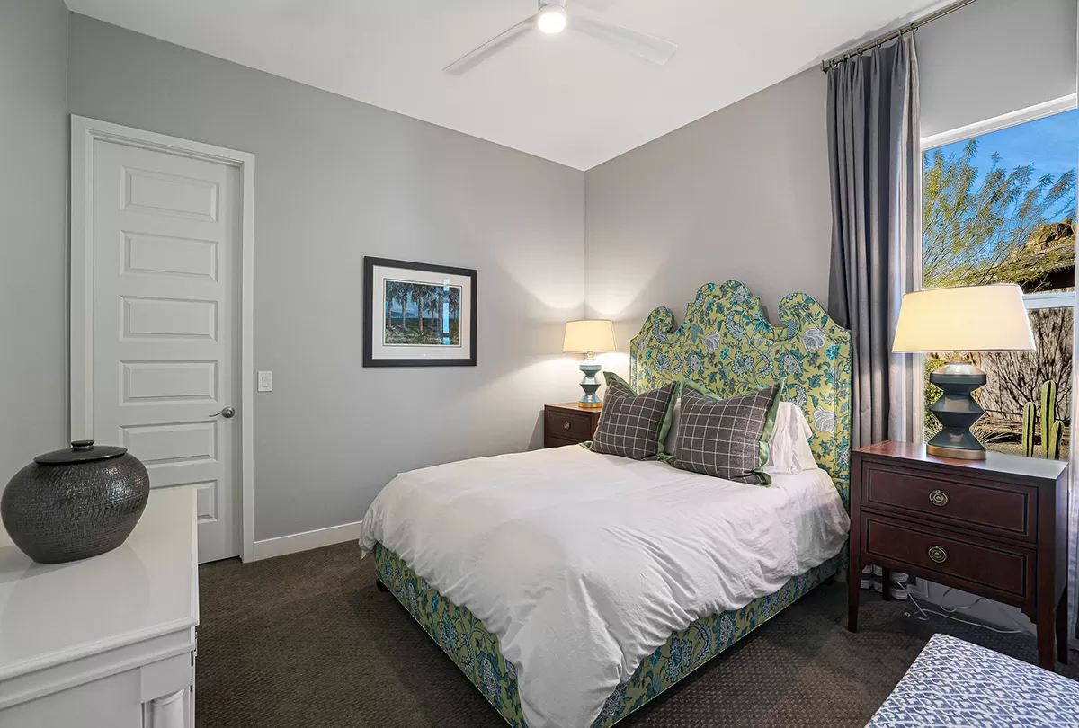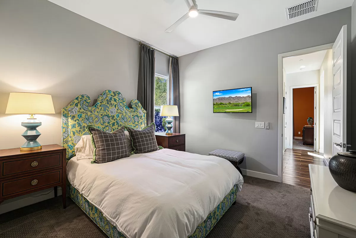 Inside, the home is adorned with designer window treatments, closet storage systems, and exquisite accents throughout, including wall treatments, custom lighting, and paint. The private office/den, situated off the entry foyer, boasts built-in bookshelves and cabinetry, providing a stylish and functional workspace with direct access to the interior courtyard. Two guest bedrooms, each with walk-in closets, share a well-appointed hall bath, offering a comfortable retreat for family or visitors.