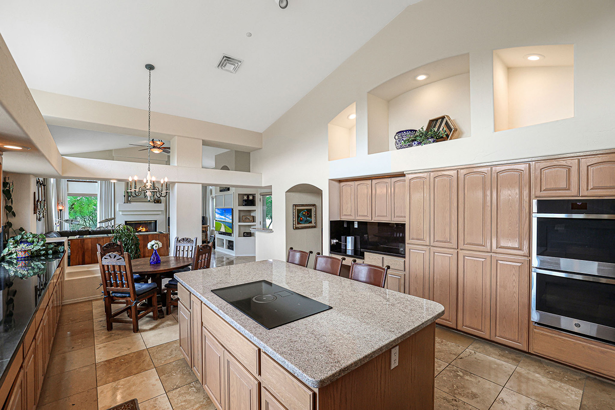The kitchen is light and bright with clerestory windows, granite counters, center island, and eat-in breakfast area. Culinary enthusiasts will delight in the state-of-the-art Italian induction cooktop with downdraft venting as well as a new microwave, double convection oven, and refrigerator installed in 2023.